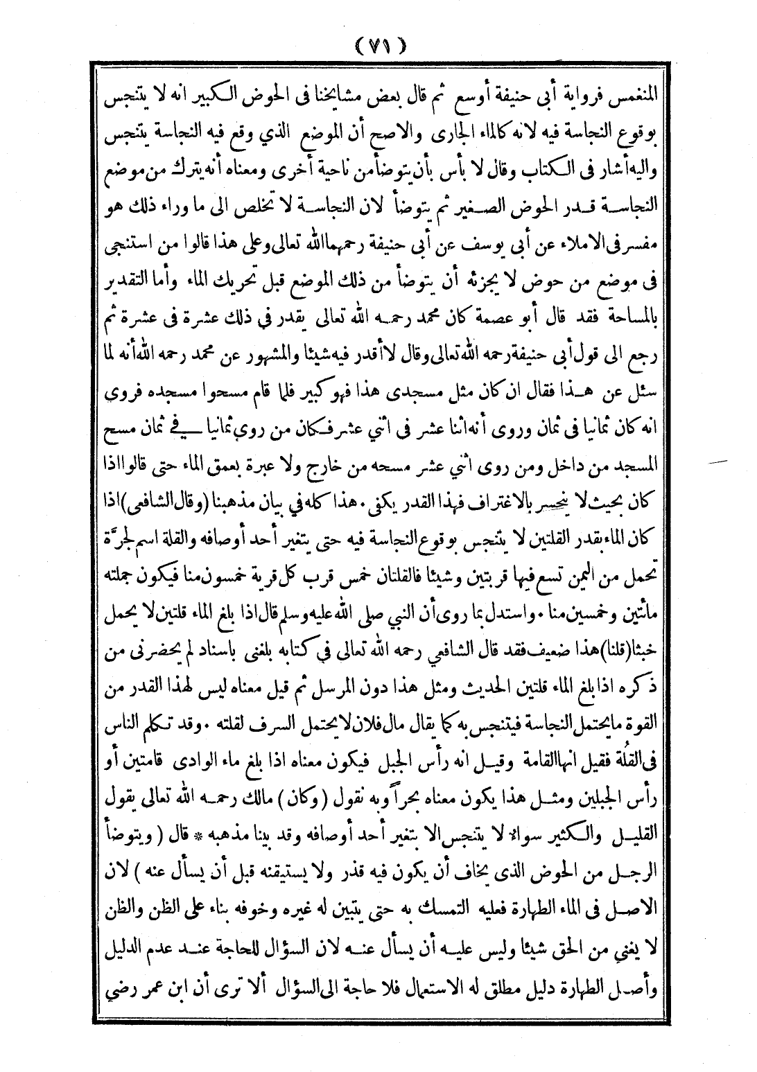 وَأَمَّا التَّقْدِيرُ بِالْمِسَاحَةِ فَقَدْ قَالَ أَبُو عِصْمَةَ كَانَ مُحَمَّدٌ - رَحِمَهُ اللَّهُ تَعَالَى - يُقَدِّرُ فِي ذَلِكَ عَشْرَةً فِي عَشْرَةٍ، ثُمَّ رَجَعَ إلَى قَوْلِ أَبِي حَنِيفَةَ - رَحِمَهُ اللَّهُ تَعَالَى -، وَقَالَ: لَا أُقَدِّرُ فِيهِ شَيْئًا، وَالْمَشْهُورُ عَنْ مُحَمَّدٍ - رَحِمَهُ اللَّهُ - أَنَّهُ لَمَّا سُئِلَ عَنْ هَذَا فَقَالَ: إنْ كَانَ مِثْلَ مَسْجِدِي هَذَا فَهُوَ كَبِيرٌ فَلَمَّا قَامَ مَسَحُوا مَسْجِدَهُ فَرُوِيَ أَنَّهُ كَانَ ثَمَانِيًا فِي ثَمَانٍ، وَرُوِيَ أَنَّهُ اثْنَا عَشَرَ فِي اثْنَيْ عَشَرَ فَكَانَ مَنْ رَوَى ثَمَانِيًا فِي ثَمَانٍ مَسَحَ الْمَسْجِدَ مِنْ دَاخِلٍ، وَمَنْ رَوَى اثْنَيْ عَشَرَ مَسَحَهُ مِنْ خَارِجٍ، وَلَا عِبْرَةَ بِعُمْقِ الْمَاءِ حَتَّى قَالُوا إذَا كَانَ بِحَيْثُ لَا يَنْحَسِرُ بِالِاغْتِرَافِ فَهَذَا الْقَدْرُ يَكْفِي.