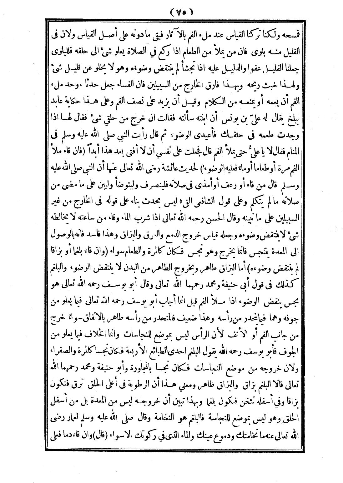 فَمَسَحَهُ، وَلَكِنَّا تَرَكْنَا الْقِيَاسَ عِنْدَ مِلْءِ الْفَمِ - بِالْآثَارِ فَبَقِيَ مَا دُونَهُ عَلَى أَصْلِ الْقِيَاسِ، وَلِأَنَّ فِي الْقَلِيلِ مِنْهُ بَلْوًى فَإِنَّ مَنْ يَمْلَأُ مِنْ الطَّعَامِ إذَا رَكَعَ فِي الصَّلَاةِ يَعْلُو شَيْءٌ إلَى حَلْقِهِ فَلِلْبَلْوَى جَعَلْنَا الْقَلِيلَ عَفْوًا، وَالدَّلِيلُ عَلَيْهِ إذَا تَجَشَّأَ لَمْ يَنْتَقِضْ وُضُوءُهُ، وَهُوَ لَا يَخْلُو عَنْ قَلِيلِ شَيْءٍ، وَلِهَذَا خَبُثَ رِيحُهُ، وَبِهَذَا فَارَقَ الْخَارِجَ مِنْ السَّبِيلَيْنِ فَإِنَّ الْفُسَاءَ جُعِلَ حَدَثًا، وَحَدُّ مِلْءِ الْفَمِ أَنْ يَعُمَّهُ، أَوْ يَمْنَعَهُ مِنْ الْكَلَامِ، وَقِيلَ أَنْ يَزِيدَ عَلَى نِصْفِ الْفَمِ، وَعَلَى هَذَا حِكَايَةُ عَابِدٍ بِبَلْخٍ يُقَالُ عَلِيُّ بْنُ يُونُسَ أَنَّ ابْنَتَهُ سَأَلَتْهُ فَقَالَتْ إنْ خَرَجَ مِنْ حَلْقِي شَيْءٌ فَقَالَ لَهَا إذَا وَجَدْتِ طَعْمَهُ فِي حَلْقِكِ فَأَعِيدِي الْوُضُوءَ، ثُمَّ رَأَيْت النَّبِيَّ - صَلَّى اللَّهُ عَلَيْهِ وَسَلَّمَ - فِي الْمَنَامِ فَقَالَ لَا يَا عَلِيُّ حَتَّى يَمْلَأَ الْفَمَ فَجَعَلْت عَلَى نَفْسِي أَنْ لَا أُفْتِي بَعْدَ هَذَا أَبَدًا.