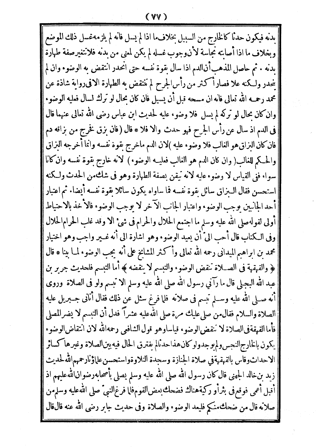 بَدَنِهِ فَيَكُونُ حَدَثًا كَالْخَارِجِ مِنْ السَّبِيلِ بِخِلَافِ مَا إذَا لَمْ يَسِلْ فَإِنَّهُ لَمْ يَلْزَمْهُ غُسْلُ ذَلِكَ الْمَوْضِعِ، وَبِخِلَافِ مَا إذَا أَصَابَتْهُ نَجَاسَةٌ؛ لِأَنَّ وُجُوبَ غُسْلِهِ لَمْ يَكُنْ لِمَعْنًى مِنْ بَدَنِهِ فَلَا تَتَغَيَّرُ صِفَةُ طَهَارَةِ بَدَنِهِ، ثُمَّ حَاصِلُ الْمَذْهَبِ أَنَّ الدَّمَ سَالَ بِقُوَّةِ نَفْسِهِ حَتَّى انْحَدَرَ انْتَقَضْ بِهِ الْوُضُوءُ، وَإِنْ لَمْ يَنْحَدِرْ، وَلَكِنَّهُ عَلَا فَصَارَ أَكْثَرَ مِنْ رَأْسِ الْجُرْحِ لَمْ تُنْتَقَضَ بِهِ الطَّهَارَةُ إلَّا فِي رِوَايَةٍ شَاذَّةٍ عَنْ مُحَمَّدٍ - رَحِمَهُ اللَّهُ تَعَالَى - فَإِنَّهُ إنْ مَسَحَهُ قَبْلَ أَنْ يَسِيلَ فَإِنْ كَانَ بِحَالٍ لَوْ تُرِكَ لَسَالَ فَعَلَيْهِ الْوُضُوءُ، وَإِنْ كَانَ بِحَالٍ لَوْ تَرَكَهُ لَمْ يَسِلْ فَلَا وُضُوءَ عَلَيْهِ لِحَدِيثِ ابْنِ عَبَّاسٍ - رَضِيَ اللَّهُ تَعَالَى عَنْهُمَا - قَالَ فِي الدَّمِ إذْ سَالَ عَنْ رَأْسِ الْجُرْحِ فَهُوَ حَدَثٌ، وَإِلَّا فَلَا.