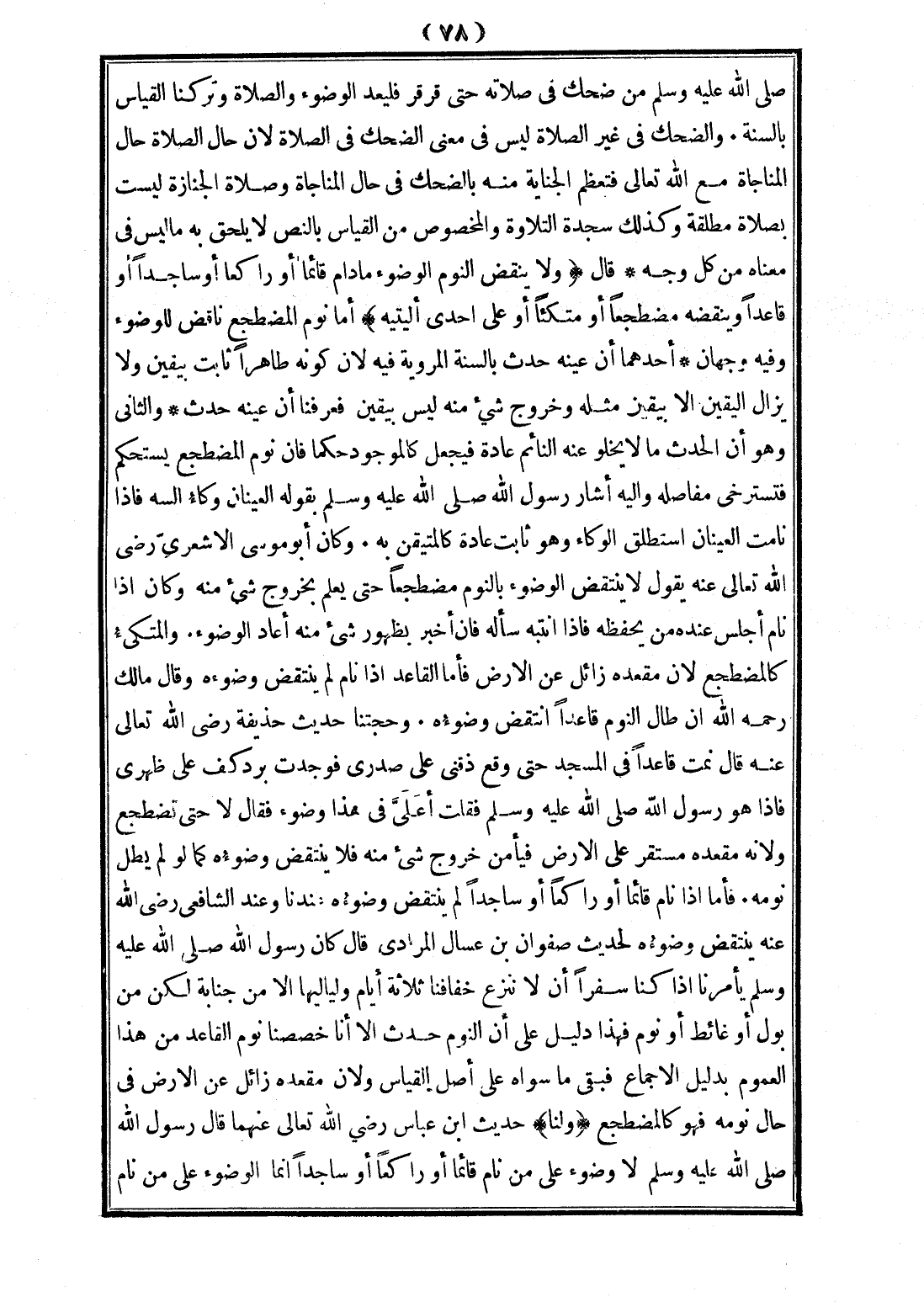 - صَلَّى اللَّهُ عَلَيْهِ وَسَلَّمَ - «مَنْ ضَحِكَ فِي صَلَاتِهِ حَتَّى قَرْقَرَ فَلْيُعِدْ الْوُضُوءَ، وَالصَّلَاةَ»، وَتَرَكْنَا الْقِيَاسَ بِالسُّنَّةِ.، وَالضَّحِكُ فِي غَيْرِ الصَّلَاةِ لَيْسَ فِي مَعْنَى الضَّحِكِ فِي الصَّلَاةِ؛ لِأَنَّ حَالَ الصَّلَاةِ حَالَ الْمُنَاجَاةِ مَعَ اللَّهِ تَعَالَى فَتَعْظُمُ الْجِنَايَةُ مِنْهُ بِالضَّحِكِ فِي حَالِ الْمُنَاجَاةِ، وَصَلَاةُ الْجِنَازَةِ لَيْسَتْ بِصَلَاةٍ مُطْلَقَةٍ، وَكَذَلِكَ سَجْدَةُ التِّلَاوَةِ، وَالْمَخْصُوصُ مِنْ الْقِيَاسِ بِالنَّصِّ لَا يَلْحَقُ بِهِ مَا لَيْسَ فِي مَعْنَاهُ مِنْ كُلِّ وَجْهٍ.