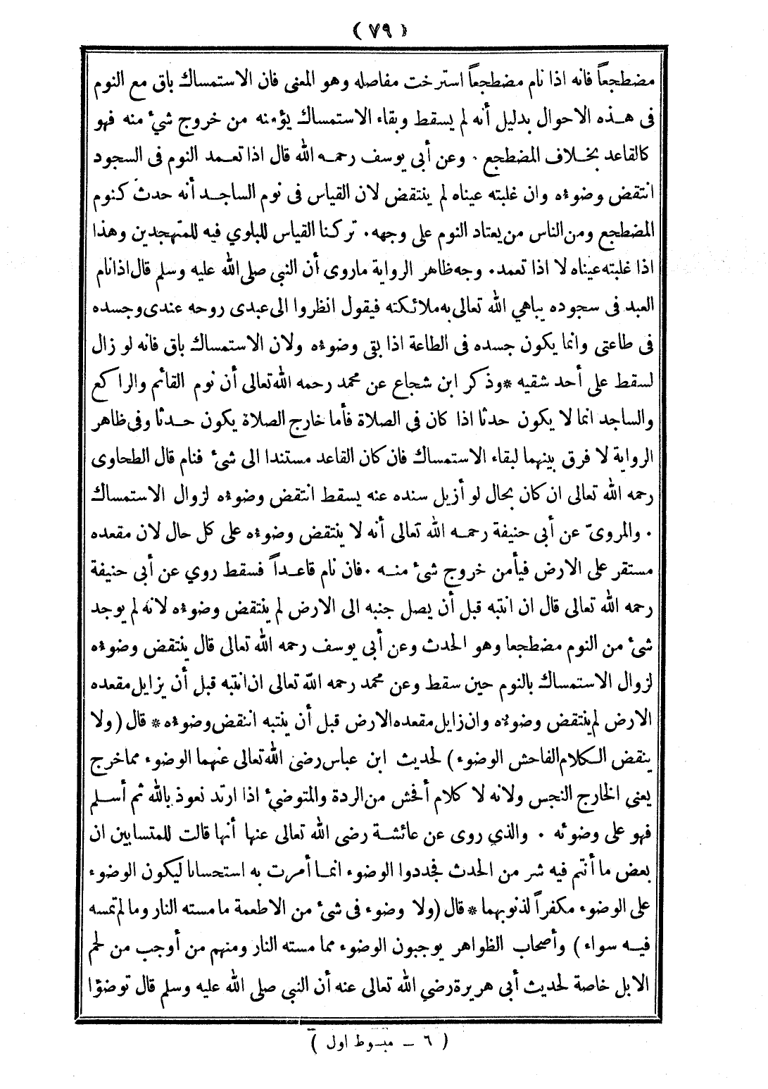مُضْطَجِعًا فَإِنَّهُ إذَا نَامَ مُضْطَجِعًا اسْتَرْخَتْ مَفَاصِلُهُ»، وَهُوَ الْمَعْنَى فَإِنَّ الِاسْتِمْسَاكَ بَاقٍ مَعَ النَّوْمِ فِي هَذِهِ الْأَحْوَالِ بِدَلِيلِ أَنَّهُ لَمْ يَسْقُطْ، وَبَقَاءُ الِاسْتِمْسَاكِ يُؤَمِّنُهُ مَنْ خُرُوجِ شَيْءٍ مِنْهُ فَهُوَ كَالْقَاعِدِ بِخِلَافِ الْمُضْطَجِعِ، وَعَنْ أَبِي يُوسُفَ - رَحِمَهُ اللَّهُ - قَالَ إذَا تَعَمَّدَ النَّوْمَ فِي السُّجُودِ اُنْتُقِضَ وُضُوءُهُ، وَإِنْ غَلَبْته عَيْنَاهُ لَمْ يُنْتَقَضْ؛ لِأَنَّ الْقِيَاسَ فِي نَوْمِ السَّاجِدِ أَنَّهُ حَدَثٌ كَنَوْمِ الْمُضْطَجِعِ، وَمِنْ النَّاسِ مَنْ يَعْتَادُ النَّوْمَ عَلَى وَجْهِهِ. تَرَكْنَا الْقِيَاسَ لِلْبَلْوَى فِيهِ لِلْمُجْتَهِدِينَ، وَهَذَا إذَا غَلَبَتْهُ عَيْنَاهُ لَا إذَا تَعَمَّدَ، وَجْهُ ظَاهِرِ الرِّوَايَةِ مَا رُوِيَ أَنَّ النَّبِيَّ - صَلَّى اللَّهُ عَلَيْهِ وَسَلَّمَ - قَالَ «إذَا نَامَ الْعَبْدُ فِي سُجُودِهِ يُبَاهِي اللَّهُ تَعَالَى بِهِ مَلَائِكَتَهُ فَيَقُولُ اُنْظُرُوا إلَى عَبْدِي رُوحُهُ عِنْدِي، وَجَسَدُهُ فِي طَاعَتِي»، وَإِنَّمَا يَكُونُ جَسَدُهُ فِي الطَّاعَةِ إذَا بَقِيَ وُضُوءُهُ، وَلِأَنَّ الِاسْتِمْسَاكَ بَاقٍ فَإِنَّهُ لَوْ زَالَ لَسَقَطَ عَلَى أَحَدِ شِقَّيْهِ، وَذَكَرَ ابْنُ شُجَاعٍ عَنْ مُحَمَّدٍ - رَحِمَهُ اللَّهُ تَعَالَى - أَنَّ نَوْمَ الْقَائِمِ، وَالرَّاكِعِ، وَالسَّاجِدِ إنَّمَا لَا يَكُونُ حَدَثًا إذَا كَانَ فِي الصَّلَاةِ فَأَمَّا خَارِجَ الصَّلَاةِ يَكُونُ حَدَثًا، وَفِي ظَاهِرِ الرِّوَايَةِ لَا فَرْقَ بَيْنَهُمَا لِبَقَاءِ الِاسْتِمْسَاكِ فَإِنْ كَانَ الْقَاعِدُ مُسْتَنِدًا إلَى شَيْءٍ فَنَامَ قَالَ الطَّحَاوِيُّ - رَحِمَهُ اللَّهُ تَعَالَى - إنْ كَانَ بِحَالٍ لَوْ أُزِيلَ سَنَدُهُ عَنْهُ يَسْقُطُ انْتَقَضَ وُضُوءُهُ لِزَوَالِ الِاسْتِمْسَاكِ، وَالْمَرْوِيُّ عَنْ أَبِي حَنِيفَةَ - رَحِمَهُ اللَّهُ تَعَالَى - أَنَّهُ لَا يُنْتَقَضُ وُضُوءُهُ عَلَى كُلِّ حَالٍ؛ لِأَنَّ مَقْعَدَهُ مُسْتَقِرٌّ عَلَى الْأَرْضِ فَيَأْمَنُ خُرُوجَ شَيْءٍ مِنْهُ. فَإِنْ نَامَ قَاعِدًا فَسَقَطَ، رُوِيَ عَنْ أَبِي حَنِيفَةَ - رَحِمَهُ اللَّهُ تَعَالَى - قَالَ إنْ انْتَبَهَ قَبْلَ أَنْ يَصِلَ جَنْبُهُ إلَى الْأَرْضِ لَمْ يُنْتَقَضْ وُضُوءُهُ؛ لِأَنَّهُ لَمْ يُوجَدْ شَيْءٌ مِنْ النَّوْمِ، وَهُوَ الْحَدَثُ، وَعَنْ أَبِي يُوسُفَ - رَحِمَهُ اللَّهُ تَعَالَى - قَالَ يُنْتَقَضُ وُضُوءُهُ لِزَوَالِ الِاسْتِمْسَاكِ بِالنَّوْمِ حِينَ سَقَطَ، وَعَنْ مُحَمَّدٍ - رَحِمَهُ اللَّهُ تَعَالَى - إنْ انْتَبَهَ قَبْلَ أَنْ يُزَايِلَ مَقْعَدُهُ الْأَرْضَ لَمْ يُنْتَقَضْ وُضُوءُهُ، وَإِنْ زَايَلَ مَقْعَدُهُ الْأَرْضَ قَبْلَ أَنْ يَنْتَبِهَ انْتَقَضَ وُضُوءُهُ.