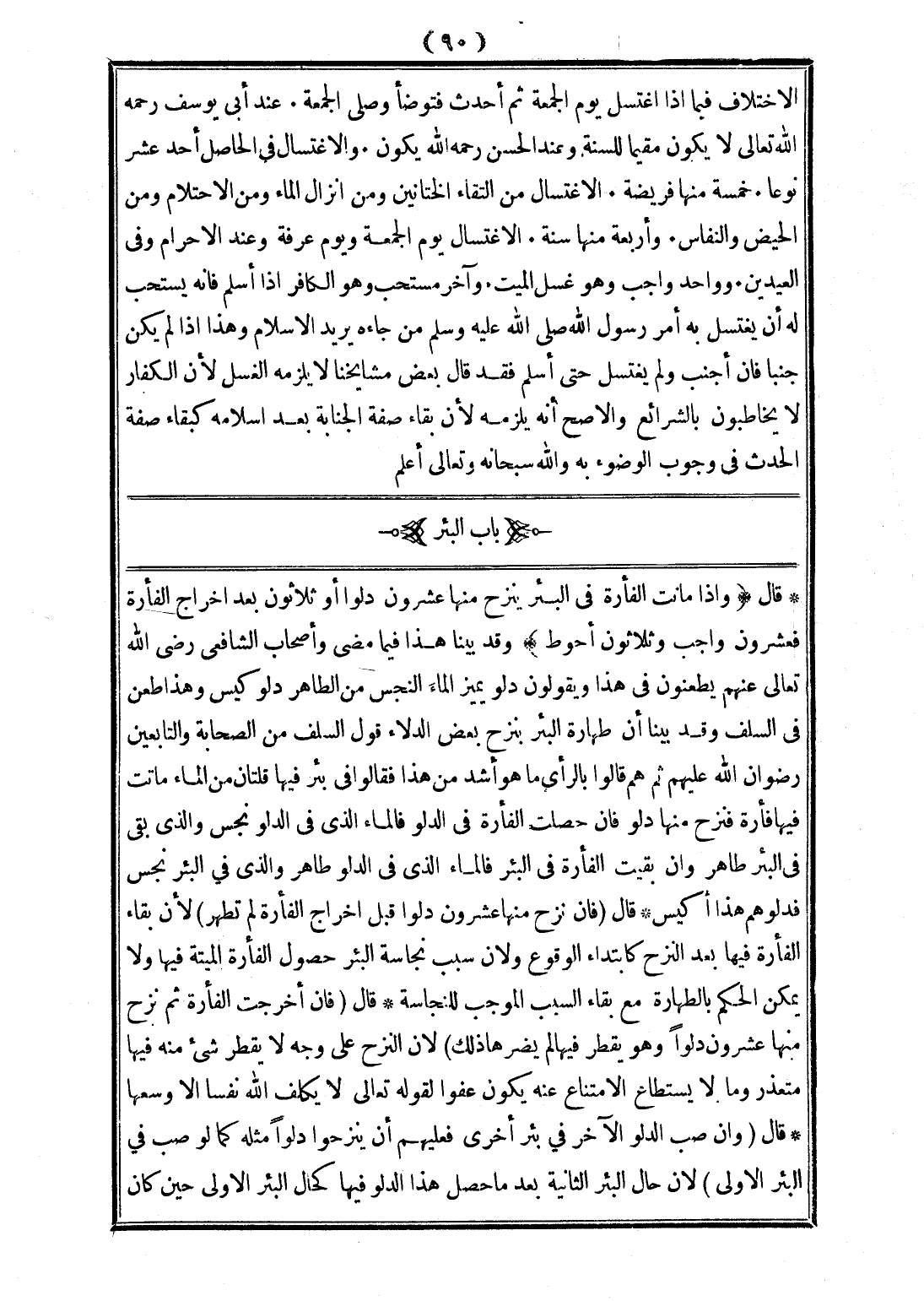 قَالَ (وَإِذَا مَاتَتْ الْفَأْرَةُ فِي الْبِئْرِ يُنْزَحُ مِنْهَا عِشْرُونَ دَلْوًا أَوْ ثَلَاثُونَ بَعْدَ إخْرَاجِ الْفَأْرَةِ فَعِشْرُونَ وَاجِبٌ وَثَلَاثُونَ أَحْوَطُ) وَقَدْ بَيَّنَّا هَذَا فِيمَا مَضَى، وَأَصْحَابُ الشَّافِعِيِّ - رَضِيَ اللَّهُ تَعَالَى عَنْهُمْ - يَطْعَنُونَ فِي هَذَا وَيَقُولُونَ: دَلْوٌ يُمَيِّزُ الْمَاءَ النَّجِسَ مِنْ الطَّاهِرِ دَلْوٌ كَيِّسٌ. وَهَذَا طَعْنٌ فِي السَّلَفِ وَقَدْ بَيَّنَّا أَنَّ طَهَارَةَ الْبِئْرِ بِنَزْحِ بَعْضِ الدِّلَاءِ قَوْلُ السَّلَفِ مِنْ الصَّحَابَةِ وَالتَّابِعِينَ - رِضْوَانُ اللَّهِ عَلَيْهِمْ - ثُمَّ هُمْ قَالُوا بِالرَّأْيِ مَا هُوَ أَشَدُّ مِنْ هَذَا فَقَالُوا فِي بِئْرٍ فِيهَا قُلَّتَانِ مِنْ الْمَاءِ مَاتَتْ فِيهَا فَأْرَةٌ فَنُزِحَ مِنْهَا دَلْوٌ فَإِنْ حَصَلَتْ الْفَأْرَةُ فِي الدَّلْوِ فَالْمَاءُ الَّذِي فِي الدَّلْوِ نَجِسٌ وَاَلَّذِي بَقِيَ فِي الْبِئْرِ طَاهِرٌ، وَإِنْ بَقِيَتْ الْفَأْرَةُ فِي الْبِئْرِ فَالْمَاءُ الَّذِي فِي الدَّلْوِ طَاهِرٌ وَاَلَّذِي فِي الْبِئْرِ نَجِسٌ فَدَلْوُهُمْ هَذَا أَكْيَسُ.