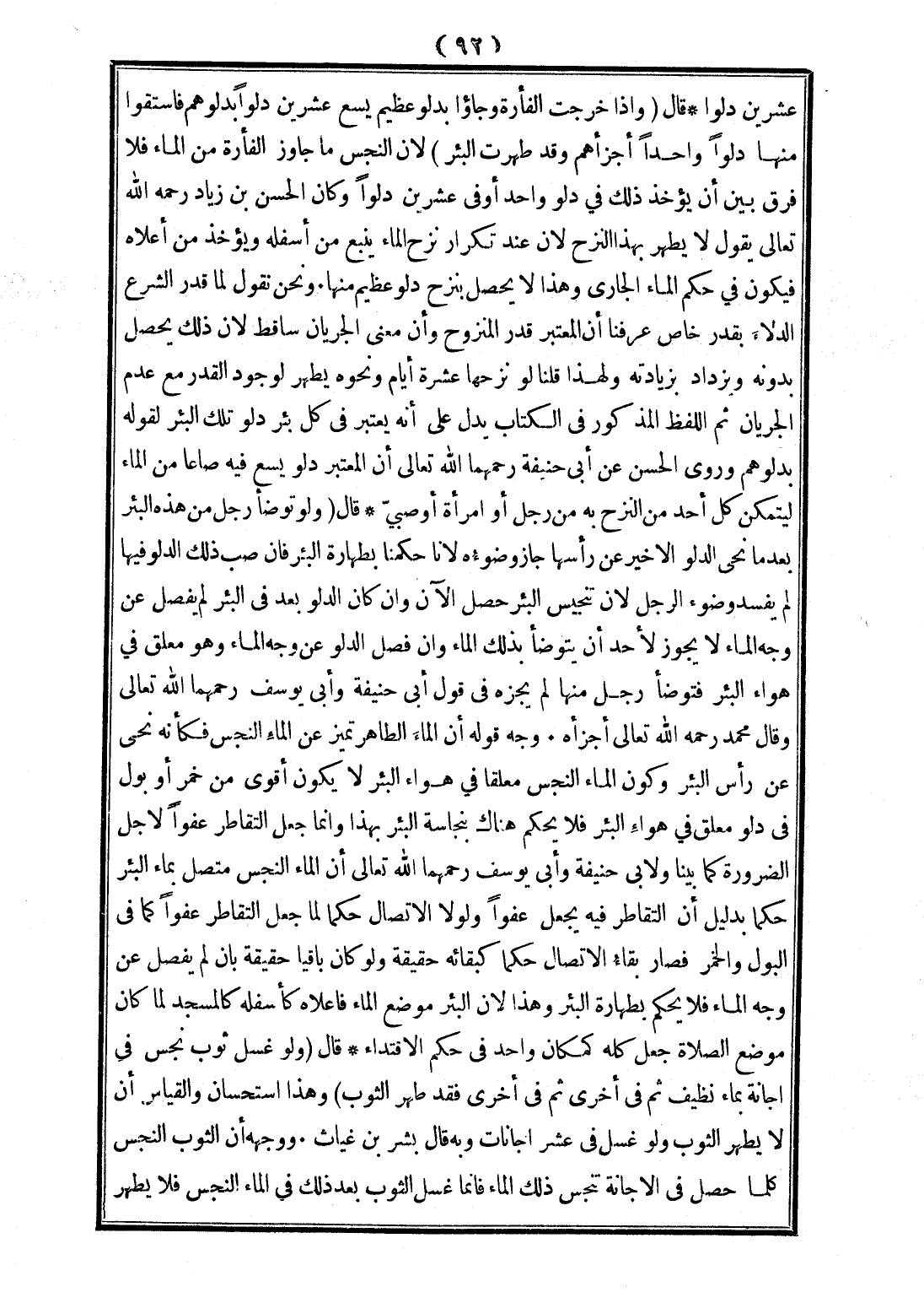 قَالَ (وَلَوْ تَوَضَّأَ رَجُلٌ مِنْ هَذِهِ الْبِئْرِ بَعْدَ مَا نَحَّى الدَّلْوَ الْأَخِيرَ عَنْ رَأْسِهَا جَازَ وُضُوءُهُ)؛ لِأَنَّا حَكَمْنَا بِطَهَارَةِ الْبِئْرِ فَإِنْ صُبَّ ذَلِكَ الدَّلْوُ فِيهَا لَمْ يَفْسُدْ وُضُوءُ الرَّجُلِ؛ لِأَنَّ تَنْجِيسَ الْبِئْرِ حَصَلَ الْآنَ وَإِنْ كَانَ الدَّلْوُ بَعْدُ فِي الْبِئْرِ لَمْ يُفْصَلْ عَنْ وَجْهِ الْمَاءِ لَا يَجُوزُ لِأَحَدٍ أَنْ يَتَوَضَّأَ بِذَلِكَ الْمَاءِ وَإِنْ فُصِلَ الدَّلْوُ عَنْ وَجْهِ الْمَاءِ وَهُوَ مُعَلَّقٌ فِي هَوَاءِ الْبِئْرِ فَتَوَضَّأَ رَجُلٌ مِنْهَا لَمْ يُجْزِهِ فِي قَوْلِ أَبِي حَنِيفَةَ وَأَبِي يُوسُفَ رَحِمَهُمَا اللَّهُ تَعَالَى، وَقَالَ مُحَمَّدٌ - رَحِمَهُ اللَّهُ تَعَالَى - أَجْزَأَهُ. وَجْهُ قَوْلِهِ أَنَّ الْمَاءَ الطَّاهِرَ تَمَيَّزَ عَنْ الْمَاءِ النَّجِسِ فَكَأَنَّهُ نُحِّيَ عَنْ رَأْسِ الْبِئْرِ وَكَوْنُ الْمَاءِ النَّجِسِ مُعَلَّقًا فِي هَوَاءِ الْبِئْرِ لَا يَكُونُ أَقْوَى مِنْ خَمْرٍ أَوْ بَوْلٍ فِي دَلْوٍ مُعَلَّقٍ فِي هَوَاءِ الْبِئْرِ فَلَا يُحْكَمُ هُنَاكَ بِنَجَاسَةِ الْبِئْرِ بِهَذَا وَإِنَّمَا جُعِلَ التَّقَاطُرُ عَفْوًا لِأَجَلِ الضَّرُورَةِ كَمَا بَيَّنَّا وَلِأَبِي حَنِيفَةَ وَأَبِي يُوسُفَ رَحِمهمَا اللَّهُ تَعَالَى أَنَّ الْمَاءَ النَّجِسَ مُتَّصِلٌ بِمَاءِ الْبِئْرِ حُكْمًا بِدَلِيلِ أَنَّ التَّقَاطُرَ فِيهِ يُجْعَلُ عَفْوًا وَلَوْلَا الِاتِّصَالُ حُكْمًا لَمَا جُعِلَ التَّقَاطُرُ عَفْوًا كَمَا فِي الْبَوْلِ وَالْخَمْرِ فَصَارَ بَقَاءُ الِاتِّصَالِ حُكْمًا كَبَقَائِهِ حَقِيقَةً وَلَوْ كَانَ بَاقِيًا حَقِيقَةً بِأَنْ لَمْ يُفْصَلْ عَنْ وَجْهِ الْمَاءِ فَلَا يُحْكَمُ بِطَهَارَةِ الْبِئْرِ، وَهَذَا لِأَنَّ الْبِئْرَ مَوْضِعُ الْمَاءِ فَأَعْلَاهُ كَأَسْفَلِهِ كَالْمَسْجِدِ لَمَّا كَانَ مَوْضِعَ الصَّلَاةِ جُعِلَ كُلُّهُ كَمَكَانٍ وَاحِدٍ فِي حُكْمِ الِاقْتِدَاءِ