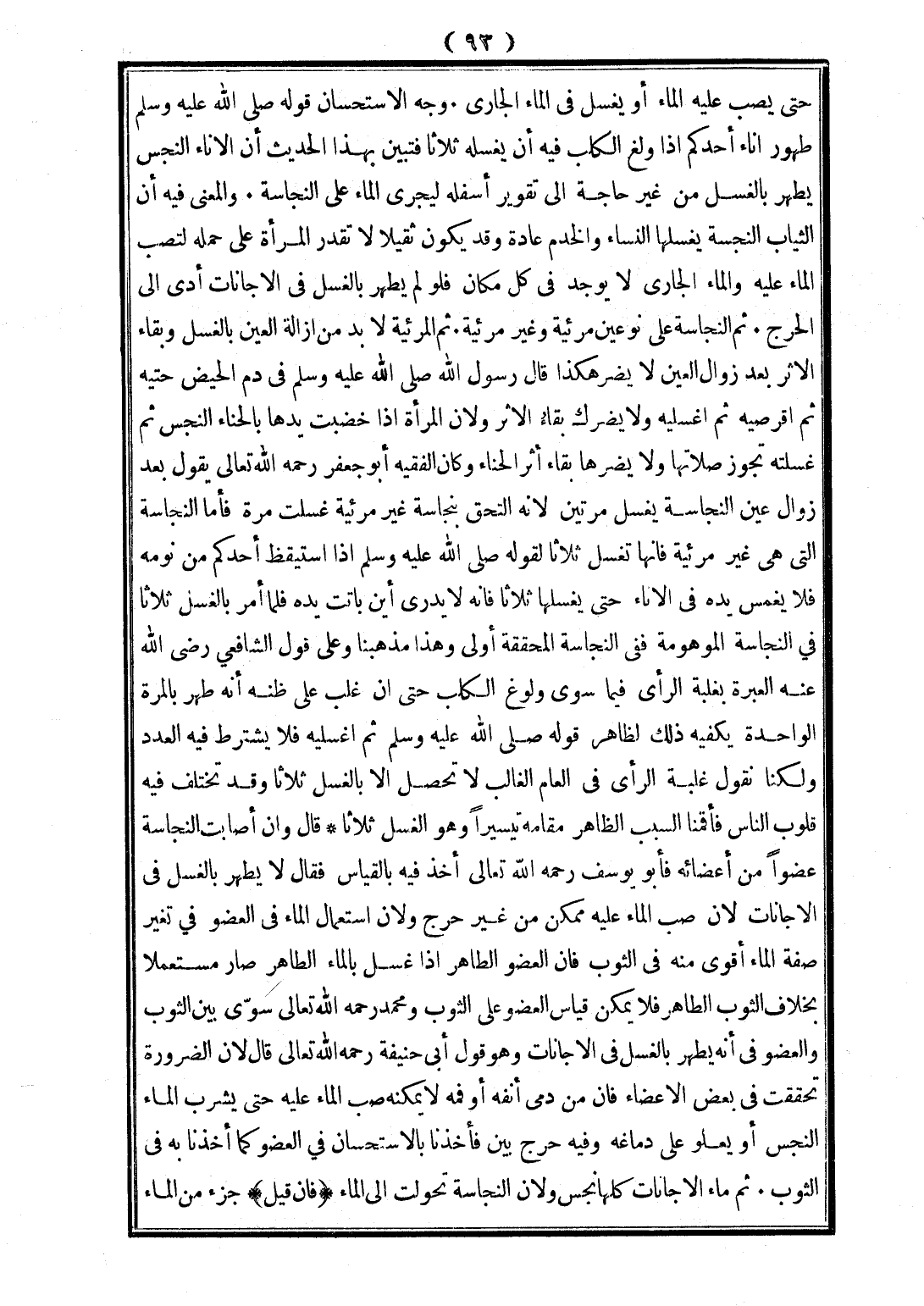 ثُمَّ النَّجَاسَةُ عَلَى نَوْعَيْنِ: مَرْئِيَّةٌ وَغَيْرُ مَرْئِيَّةٍ، ثُمَّ الْمَرْئِيَّةُ لَا بُدَّ مِنْ إزَالَةِ الْعَيْنِ بِالْغَسْلِ، وَبَقَاءُ الْأَثَرِ بَعْدَ زَوَالِ الْعَيْنِ لَا يَضُرُّ هَكَذَا «قَالَ رَسُولُ اللَّهِ - صَلَّى اللَّهُ عَلَيْهِ وَسَلَّمَ - فِي دَمِ الْحَيْضِ حُتِّيهِ ثُمَّ اُقْرُصِيهِ ثُمَّ اغْسِلِيهِ وَلَا يَضُرُّكِ بَقَاءُ الْأَثَرِ» وَلِأَنَّ الْمَرْأَةَ إذَا خَضَّبَتْ يَدَهَا بِالْحِنَّاءِ النَّجِسِ ثُمَّ غَسَلَتْهُ تَجُوزُ صَلَاتُهَا وَلَا يَضُرُّهَا بَقَاءُ أَثَرِ الْحِنَّاءِ، وَكَانَ الْفَقِيهُ أَبُو جَعْفَرٍ - رَحِمَهُ اللَّهُ تَعَالَى - يَقُولُ بَعْدَ زَوَالِ عَيْنِ النَّجَاسَةِ يُغْسَلُ مَرَّتَيْنِ؛ لِأَنَّهُ الْتَحَقَ بِنَجَاسَةٍ غَيْرِ مَرْئِيَّةٍ غُسِلَتْ مَرَّةً فَأَمَّا النَّجَاسَةُ الَّتِي هِيَ غَيْرُ مَرْئِيَّةٍ فَإِنَّهَا تُغْسَلُ ثَلَاثًا لِقَوْلِهِ - صَلَّى اللَّهُ عَلَيْهِ وَسَلَّمَ - «إذَا اسْتَيْقَظَ أَحَدُكُمْ مِنْ نَوْمِهِ فَلَا يَغْمِسْ يَدَهُ فِي الْإِنَاءِ حَتَّى يَغْسِلَهَا ثَلَاثًا فَإِنَّهُ لَا يَدْرِي أَيْنَ بَاتَتْ يَدُهُ» فَلَمَّا أَمَرَ بِالْغَسْلِ ثَلَاثًا فِي النَّجَاسَةِ الْمَوْهُومَةِ فَفِي النَّجَاسَةِ الْمُحَقَّقَةِ أَوْلَى وَهَذَا مَذْهَبُنَا وَعَلَى قَوْلِ الشَّافِعِيِّ - رَضِيَ اللَّهُ عَنْهُ - الْعِبْرَةُ بِغَلَبَةِ الرَّأْيِ فِيمَا سِوَى وُلُوغِ الْكَلْبِ حَتَّى إنْ غَلَبَ عَلَى ظَنِّهِ أَنَّهُ طَهُرَ بِالْمَرَّةِ الْوَاحِدَةِ يَكْفِيهِ ذَلِكَ لِظَاهِرِ قَوْلِهِ - صَلَّى اللَّهُ عَلَيْهِ وَسَلَّمَ - ثُمَّ اغْسِلِيهِ فَلَا يُشْتَرَطُ فِيهِ الْعَدَدُ، وَلَكِنَّا نَقُولُ غَلَبَةُ الرَّأْيِ فِي الْعَامِّ الْغَالِبِ لَا يَحْصُلُ إلَّا بِالْغَسْلِ ثَلَاثًا، وَقَدْ تَخْتَلِفُ فِيهِ قُلُوبُ النَّاسِ فَأَقَمْنَا السَّبَبَ الظَّاهِرَ مَقَامَهُ تَيْسِيرًا وَهُوَ الْغَسْلُ ثَلَاثًا. قَالَ: وَإِنْ أَصَابَتْ النَّجَاسَةُ عُضْوًا مِنْ أَعْضَائِهِ فَأَبُو يُوسُفَ - رَحِمَهُ اللَّهُ تَعَالَى - أَخَذَ فِيهِ بِالْقِيَاسِ فَقَالَ لَا يَطْهُرُ بِالْغَسْلِ فِي الْإِجَّانَاتِ؛ لِأَنَّ صَبَّ الْمَاءِ عَلَيْهِ مُمْكِنٌ مِنْ غَيْرِ حَرَجٍ وَلِأَنَّ اسْتِعْمَالَ الْمَاءِ فِي الْعُضْوِ فِي تَغَيُّرِ صِفَةِ الْمَاءِ أَقْوَى مِنْهُ فِي الثَّوْبِ فَإِنَّ الْعُضْوَ الطَّاهِرَ إذَا غُسِلَ بِالْمَاءِ الطَّاهِرِ صَارَ مُسْتَعْمَلًا بِخِلَافِ الثَّوْبِ الطَّاهِرِ فَلَا يُمْكِنُ قِيَاسُ الْعُضْوِ عَلَى الثَّوْبِ وَمُحَمَّدٌ - رَحِمَهُ اللَّهُ تَعَالَى - سَوَّى بَيْنَ الثَّوْبِ وَالْعُضْوِ فِي أَنَّهُ يَطْهُرُ بِالْغَسْلِ فِي الْإِجَّانَاتِ وَهُوَ قَوْلُ أَبِي حَنِيفَةَ - رَحِمَهُ اللَّهُ تَعَالَى - قَالَ: لِأَنَّ الضَّرُورَةَ تَحَقَّقَتْ فِي بَعْضِ الْأَعْضَاءِ فَإِنَّ مَنْ دَمِيَ أَنْفُهُ أَوَفَمُهُ لَا يُمْكِنُهُ صَبُّ الْمَاءِ عَلَيْهِ حَتَّى يَشْرَبَ الْمَاءَ النَّجِسَ أَوْ يَعْلُوَ عَلَى دِمَاغِهِ وَفِيهِ حَرَجٌ بَيِّنٌ فَأَخَذْنَا بِالِاسْتِحْسَانِ فِي الْعُضْوِ كَمَا أَخَذْنَا بِهِ فِي الثَّوْبِ. ثُمَّ مَاءُ الْإِجَّانَاتِ كُلِّهَا نَجِسٌ، وَلِأَنَّ النَّجَاسَةَ تَحَوَّلَتْ إلَى الْمَاءِ (فَإِنْ قِيلَ) جُزْءٌ مِنْ الْمَاءِ