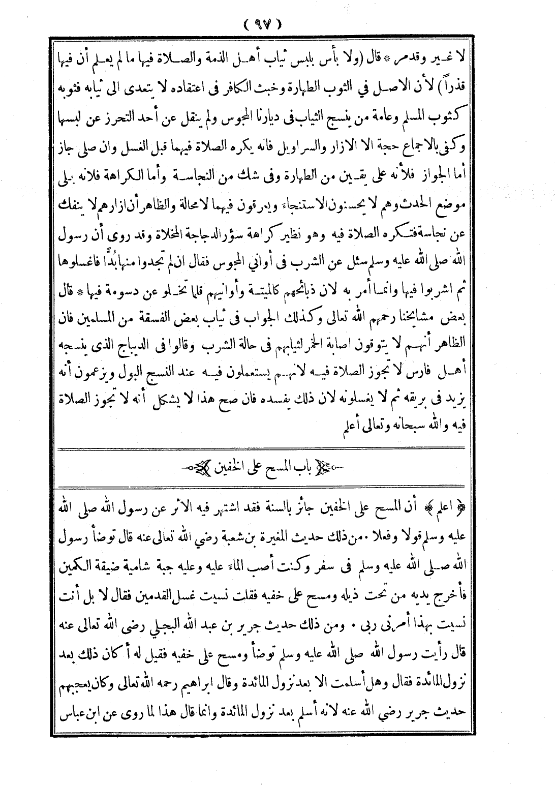 (اعْلَمْ) أَنَّ الْمَسْحَ عَلَى الْخُفَّيْنِ جَائِزٌ بِالسُّنَّةِ فَقَدْ اُشْتُهِرَ فِيهِ الْأَثَرُ عَنْ رَسُولِ اللَّهِ - صَلَّى اللَّهُ عَلَيْهِ وَسَلَّمَ - قَوْلًا وَفِعْلًا. مِنْ ذَلِكَ حَدِيثُ الْمُغِيرَةِ بْنِ شُعْبَةَ - رَضِيَ اللَّهُ تَعَالَى عَنْهُ - قَالَ «تَوَضَّأَ رَسُولُ اللَّهِ - صَلَّى اللَّهُ عَلَيْهِ وَسَلَّمَ - فِي سَفَرٍ وَكُنْت أَصُبُّ الْمَاءَ عَلَيْهِ وَعَلَيْهِ جُبَّةٌ شَامِيَّةٌ ضَيِّقَةُ الْكُمَّيْنِ فَأَخْرُج يَدَيْهِ مِنْ تَحْتِ ذَيْلِهِ وَمَسَحَ عَلَى خُفَّيْهِ فَقُلْت نَسِيتَ غَسَلَ الْقَدَمَيْنِ فَقَالَ لَا بَلْ أَنْتَ نَسِيتَ بِهَذَا أَمَرَنِي رَبِّي». وَمِنْ ذَلِكَ حَدِيثُ «جَرِيرِ بْنِ عَبْدِ اللَّهِ الْبَجَلِيِّ - رَضِيَ اللَّهُ تَعَالَى عَنْهُ - قَالَ رَأَيْت رَسُولَ اللَّهِ - صَلَّى اللَّهُ عَلَيْهِ وَسَلَّمَ - تَوَضَّأَ وَمَسَحَ عَلَى خُفَّيْهِ فَقِيلَ لَهُ أَكَانَ ذَلِكَ بَعْد نُزُولِ الْمَائِدَةِ فَقَالَ وَهَلْ أَسْلَمْت إلَّا بَعْدَ نُزُولِ الْمَائِدَةِ» وَقَالَ إبْرَاهِيمُ: - رَحِمَهُ اللَّهُ تَعَالَى - وَكَانَ يُعْجِبُهُمْ حَدِيثُ جَرِيرٍ - رَضِيَ اللَّهُ عَنْهُ - لِأَنَّهُ أَسْلَمَ بَعْدَ نُزُولِ الْمَائِدَةِ وَإِنَّمَا قَالَ: هَذَا لِمَا رُوِيَ عَنْ ابْنِ عَبَّاسٍ.
