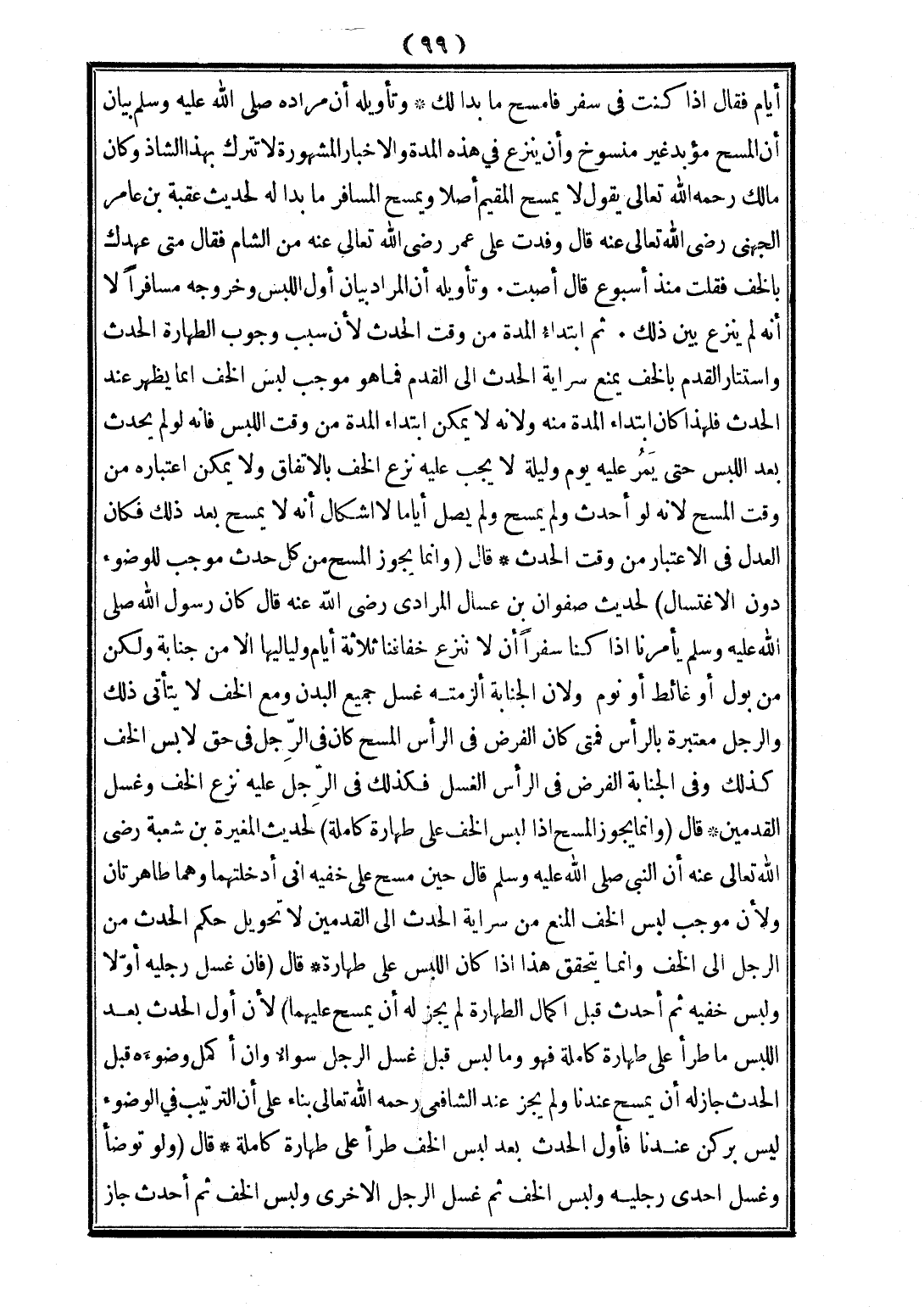 أَيَّامٍ فَقَالَ: إذَا كُنْتَ فِي سَفَرٍ فَامْسَحْ مَا بَدَا لَك» وَتَأْوِيلُهُ أَنَّ مُرَادَهُ - صَلَّى اللَّهُ عَلَيْهِ وَسَلَّمَ - بَيَانُ أَنَّ الْمَسْحَ مُؤَبَّدٌ غَيْرُ مَنْسُوخٍ وَأَنْ يُنْزَعَ فِي هَذِهِ الْمُدَّةِ وَالْأَخْبَارُ الْمَشْهُورَةُ لَا تُتْرَكُ بِهَذَا الشَّاذِّ وَكَانَ مَالِكٌ - رَحِمَهُ اللَّهُ تَعَالَى - يَقُولُ: لَا يَمْسَحُ الْمُقِيمُ أَصْلًا وَيَمْسَحُ الْمُسَافِرُ مَا بَدَا لَهُ لِحَدِيثِ عُقْبَةَ بْنِ عَامِرٍ الْجُهَنِيِّ - رَضِيَ اللَّهُ تَعَالَى عَنْهُ - قَالَ: وَفَدْت عَلَى عُمَرَ - رَضِيَ اللَّهُ تَعَالَى عَنْهُ - مِنْ الشَّامِ فَقَالَ: مَتَى عَهْدُك بِالْخُفِّ؟ فَقُلْت مُنْذُ أُسْبُوعٍ. قَالَ: أَصَبْت. وَتَأْوِيلُهُ أَنَّ الْمُرَادَ بَيَانُ أَوَّلِ اللُّبْسِ وَخُرُوجِهِ مُسَافِرًا لَا أَنَّهُ لَمْ يَنْزِعْ بَيْنَ ذَلِكَ. ثُمَّ ابْتِدَاءُ الْمُدَّةِ مِنْ وَقْتِ الْحَدَثِ؛ لِأَنَّ سَبَبَ وُجُوبِ الطَّهَارَةِ الْحَدَثُ وَاسْتِتَارُ الْقَدَمِ بِالْخُفِّ يَمْنَعُ سِرَايَة الْحَدَثِ إلَى الْقَدَمِ فَمَا هُوَ مُوجِبُ لُبْسِ الْخُفِّ إنَّمَا يَظْهَرُ عِنْدَ الْحَدَثِ فَلِهَذَا كَانَ ابْتِدَاءُ الْمُدَّةِ مِنْهُ، وَلِأَنَّهُ لَا يُمْكِنُ ابْتِدَاءُ الْمُدَّةِ مِنْ وَقْتِ اللُّبْسِ فَإِنَّهُ لَوْ لَمْ يُحْدِثْ بَعْدَ اللُّبْسِ حَتَّى يَمُرَّ عَلَيْهِ يَوْمٌ وَلَيْلَةٌ لَا يَجِبُ عَلَيْهِ نَزْعُ الْخُفِّ بِالِاتِّفَاقِ وَلَا يُمْكِنُ اعْتِبَارُهُ مِنْ وَقْتِ الْمَسْحِ؛ لِأَنَّهُ لَوْ أَحْدَثَ وَلَمْ يَمْسَحْ وَلَمْ يُصَلِّ أَيَّامًا لَا إشْكَالَ أَنَّهُ لَا يَمْسَحُ بَعْدَ ذَلِكَ فَكَانَ الْعَدْلُ فِي الِاعْتِبَارِ مِنْ وَقْتِ الْحَدَثِ.