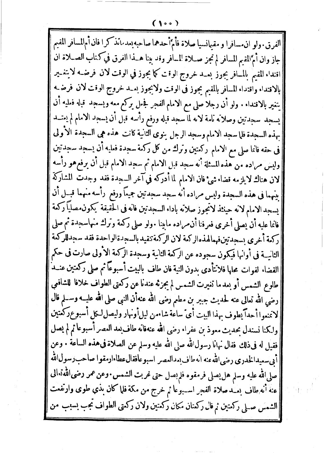 فَإِنْ طَافَ بِالْبَيْتِ أُسْبُوعًا ثُمَّ صَلَّى رَكْعَتَيْنِ عِنْدَ طُلُوعِ الشَّمْسِ أَوْ بَعْدَمَا تَغَيَّرَتْ الشَّمْسُ لَمْ يُجْزِئْهُ عِنْدَنَا عَنْ رَكْعَتَيْ الطَّوَافِ خِلَافًا لِلشَّافِعِيِّ - رَضِيَ اللَّهُ تَعَالَى عَنْهُ - لِحَدِيثِ جُبَيْرِ بْنِ مُطْعِمٍ - رَضِيَ اللَّهُ عَنْهُ - أَنَّ النَّبِيَّ - صَلَّى اللَّهُ عَلَيْهِ وَسَلَّمَ - قَالَ: «لَا تَمْنَعُوا أَحَدًا يَطُوفُ بِهَذَا الْبَيْتِ أَيَّ سَاعَةٍ شَاءَ مِنْ لَيْلٍ أَوْ نَهَارٍ وَلْيُصَلِّ لِكُلِّ أُسْبُوعٍ رَكْعَتَيْنِ» وَلَكِنَّا نَسْتَدِلُّ بِحَدِيثِ «مُعَوِّذِ ابْنِ عَفْرَاءَ - رَضِيَ اللَّهُ عَنْهُ - فَإِنَّهُ طَافَ بَعْدَ الْعَصْرِ أُسْبُوعًا ثُمَّ لَمْ يُصَلِّ فَقِيلَ لَهُ فِي ذَلِكَ فَقَالَ: نَهَانَا رَسُولُ اللَّهِ - صَلَّى اللَّهُ عَلَيْهِ وَسَلَّمَ - عَنْ الصَّلَاةِ فِي هَذِهِ السَّاعَةِ» وَعَنْ أَبِي سَعِيدٍ الْخُدْرِيِّ - رَضِيَ اللَّهُ عَنْهُ - أَنَّهُ طَافَ بَعْدَ الْعَصْرِ أُسْبُوعًا فَقَالَ: عَطَاءٌ: اُرْمُقُوا صَاحِبَ رَسُولِ اللَّهِ - صَلَّى اللَّهُ عَلَيْهِ وَسَلَّمَ - هَلْ يُصَلِّي؟ فَرَمَقُوهُ فَلَمْ يُصَلِّ حَتَّى غَرَبَتْ الشَّمْسُ وَعَنْ عُمَرَ - رَضِيَ اللَّهُ تَعَالَى عَنْهُ - أَنَّهُ طَافَ بَعْدَ صَلَاةِ الْفَجْرِ أُسْبُوعًا ثُمَّ خَرَجَ مِنْ مَكَّةَ فَلَمَّا كَانَ بِذِي طُوًى وَارْتَفَعَتْ الشَّمْسُ صَلَّى رَكْعَتَيْنِ ثُمَّ قَالَ: رَكْعَتَانِ مَكَانُ رَكْعَتَيْنِ؛ وَلِأَنَّ رَكْعَتَيْ الطَّوَافِ تَجِبُ بِسَبَبٍ مِنْ
