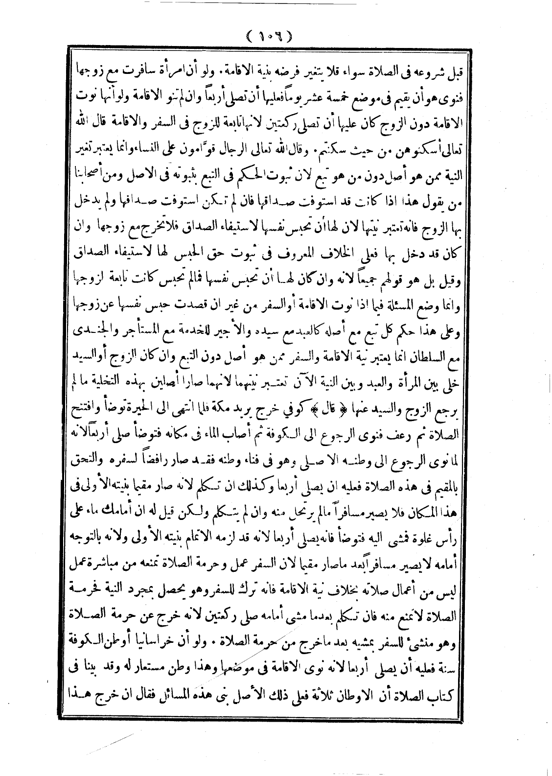 وَلَوْ أَنَّهَا نَوَتْ الْإِقَامَةَ دُونَ الزَّوْجِ كَانَ عَلَيْهَا أَنْ تُصَلِّيَ رَكْعَتَيْنِ؛ لِأَنَّهَا تَابِعَةٌ لِلزَّوْجِ فِي السَّفَرِ وَالْإِقَامَةِ قَالَ اللَّهُ تَعَالَى {أَسْكِنُوهُنَّ مِنْ حَيْثُ سَكَنْتُمْ} [الطلاق: 6]. وَقَالَ اللَّهُ تَعَالَى {الرِّجَالُ قَوَّامُونَ عَلَى النِّسَاءِ} [النساء: 34]، وَإِنَّمَا يُعْتَبَرُ تَغَيُّرُ النِّيَّةِ مِمَّنْ هُوَ أَصْلٌ دُونَ مَنْ هُوَ تَبَعٌ؛ لِأَنَّ ثُبُوتَ الْحُكْمِ فِي التَّبَعِ بِثُبُوتِهِ فِي الْأَصْلِ وَمِنْ أَصْحَابِنَا مَنْ يَقُولُ هَذَا إذَا كَانَتْ قَدْ اسْتَوْفَتْ صَدَاقَهَا فَإِنْ لَمْ تَكُنْ اسْتَوْفَتْ صَدَاقَهَا وَلَمْ يَدْخُلْ بِهَا الزَّوْجُ فَإِنَّهَا تَعْتَبِرُ نِيَّتَهَا؛ لِأَنَّ لَهَا أَنْ تَحْبِسَ نَفْسَهَا لِاسْتِيفَاءِ الصَّدَاقِ فَلَا تَخْرُجُ مَعَ زَوْجِهَا، وَإِنْ كَانَ قَدْ دَخَلَ بِهَا فَعَلَى الْخِلَافِ الْمَعْرُوفِ فِي ثُبُوتِ حَقِّ الْحَبْسِ لَهَا لِاسْتِيفَاءِ الصَّدَاقِ، وَقِيلَ بَلْ هُوَ قَوْلُهُمْ جَمِيعًا؛ لِأَنَّهُ، وَإِنْ كَانَ لَهَا أَنْ تَحْبِسَ نَفْسَهَا فَمَا لَمْ تَحْبِسْ كَانَتْ تَابِعَةً لِزَوْجِهَا، وَإِنَّمَا وَضَعَ الْمَسْأَلَةَ فِيمَا إذَا نَوَتْ الْإِقَامَةَ أَوْ السَّفَرَ مِنْ غَيْرِ أَنْ قَصَدَتْ حَبْسَ نَفْسِهَا عَنْ زَوْجِهَا وَعَلَى هَذَا حُكْمُ كُلِّ تَبَعٍ مَعَ أَصْلِهِ كَالْعَبْدِ مَعَ سَيِّدِهِ وَالْأَجِيرِ لِلْخِدْمَةِ مَعَ الْمُسْتَأْجِرِ وَالْجُنْدِيِّ مَعَ السُّلْطَانِ إنَّمَا يُعْتَبَرُ نِيَّةُ الْإِقَامَةِ وَالسَّفَرِ مِمَّنْ هُوَ أَصْلٌ دُونَ التَّبَعِ، وَإِنْ كَانَ الزَّوْجُ أَوْ السَّيِّدُ خَلَّى بَيْنَ الْمَرْأَةِ وَالْعَبْدِ وَبَيْنَ النِّيَّةِ الْآنَ تُعْتَبَرُ نِيَّتُهُمَا؛ لِأَنَّهُمَا صَارَا أَصْلَيْنِ بِهَذِهِ التَّخْلِيَةِ مَا لَمْ يَرْجِعْ الزَّوْجُ، وَالسَّيِّدُ عَنْهَا