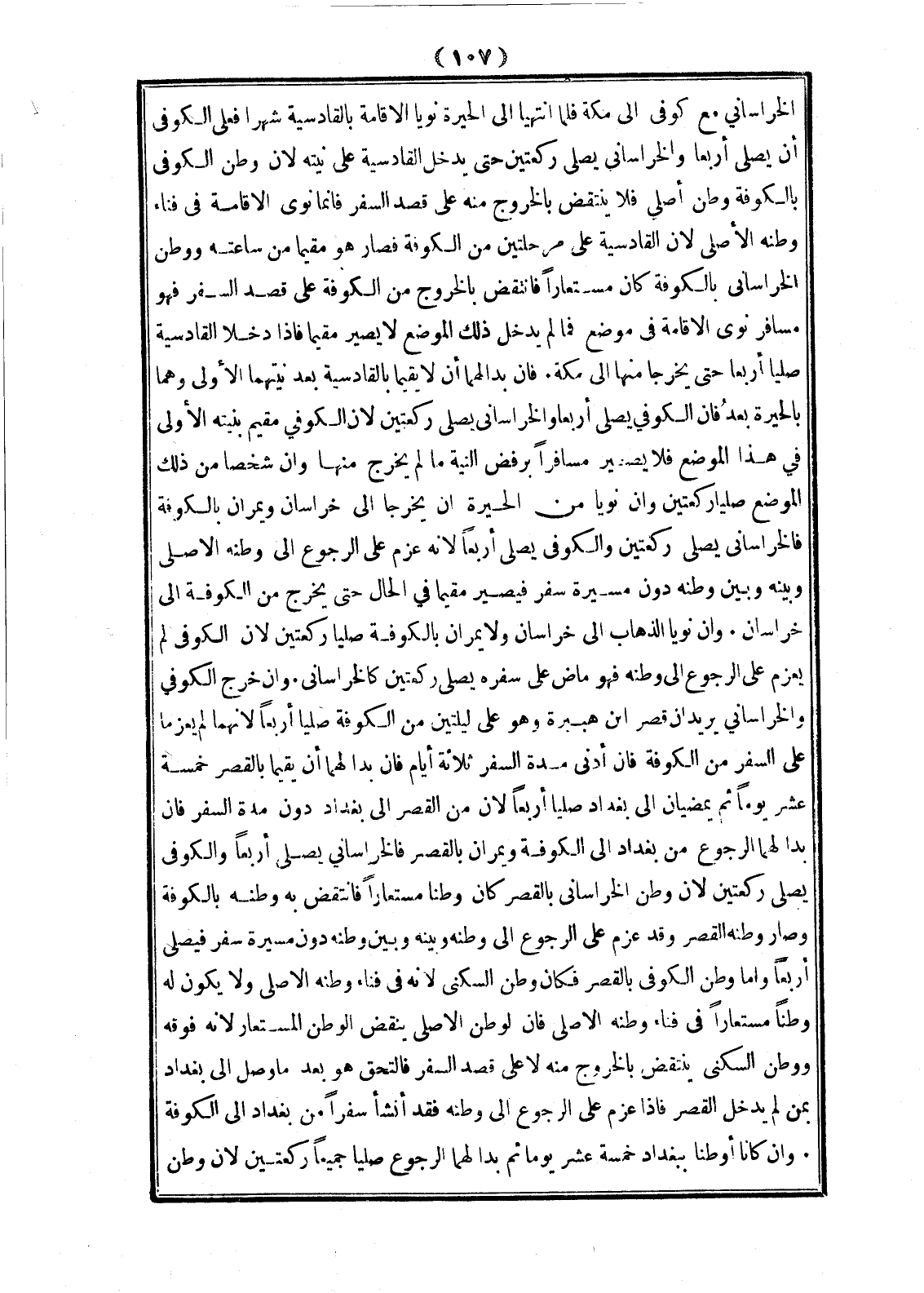 وَإِنْ خَرَجَ الْكُوفِيُّ وَالْخُرَاسَانِيُّ يُرِيدَانِ قَصْرَ ابْنِ هُبَيْرَةَ وَهُوَ عَلَى لَيْلَتَيْنِ مِنْ الْكُوفَةِ صَلَّيَا أَرْبَعًا؛ لِأَنَّهُمَا لَمْ يَعْزِمَا عَلَى السَّفَرِ مِنْ الْكُوفَةِ فَإِنَّ أَدْنَى مُدَّةِ السَّفَرِ ثَلَاثَةُ أَيَّامٍ فَإِنْ بَدَا لَهُمَا أَنْ يُقِيمَا بِالْقَصْرِ خَمْسَةَ عَشَرَ يَوْمًا ثُمَّ يَمْضِيَانِ إلَى بَغْدَادَ صَلَّيَا أَرْبَعًا؛ لِأَنَّ مِنْ الْقَصْرِ إلَى بَغْدَادَ دُونَ مُدَّةِ السَّفَرِ فَإِنْ بَدَا لَهُمَا الرُّجُوعُ مِنْ بَغْدَادَ إلَى الْكُوفَةِ وَيَمُرَّانِ بِالْقَصْرِ فَالْخُرَاسَانِيُّ يُصَلِّي أَرْبَعًا وَالْكُوفِيُّ يُصَلِّي رَكْعَتَيْنِ؛ لِأَنَّ وَطَنَ الْخُرَاسَانِيِّ بِالْقَصْرِ كَانَ وَطَنًا مُسْتَعَارًا فَانْتُقِضَ بِهِ وَطَنُهُ بِالْكُوفَةِ وَصَارَ وَطَنُهُ الْقَصْرَ، وَقَدْ عَزَمَ عَلَى الرُّجُوعِ إلَى وَطَنِهِ وَبَيْنَهُ وَبَيْنَ وَطَنِهِ دُونَ مَسِيرَةِ سَفَرٍ فَيُصَلِّي أَرْبَعًا، وَأَمَّا وَطَنُ الْكُوفِيِّ بِالْقَصْرِ فَكَانَ وَطَنَ السُّكْنَى؛ لِأَنَّهُ فِي فِنَاءِ وَطَنِهِ الْأَصْلِيِّ وَلَا يَكُونُ لَهُ وَطَنًا مُسْتَعَارًا فِي فِنَاءِ وَطَنِهِ الْأَصْلِيِّ فَإِنَّ الْوَطَنَ الْأَصْلِيَّ يَنْقُضُ الْوَطَنَ الْمُسْتَعَارَ؛ لِأَنَّهُ فَوْقَهُ وَوَطَنُ السُّكْنَى يُنْتَقَضُ بِالْخُرُوجِ مِنْهُ لَا عَلَى قَصْدِ السَّفَرِ فَالْتَحَقَ هُوَ بَعْدَمَا وَصَلَ إلَى بَغْدَادَ بِمَنْ لَمْ يَدْخُلْ الْقَصْرَ فَإِذَا عَزَمَ عَلَى الرُّجُوعِ إلَى وَطَنِهِ فَقَدْ أَنْشَأَ سَفَرًا مِنْ بَغْدَادَ إلَى الْكُوفَةِ، وَإِنْ كَانَا أَوْطَنَا بِبَغْدَادَ خَمْسَةَ عَشَرَ يَوْمًا ثُمَّ بَدَا لَهُمَا الرُّجُوعُ صَلَّيَا جَمِيعًا رَكْعَتَيْنِ؛ لِأَنَّ وَطَنَ