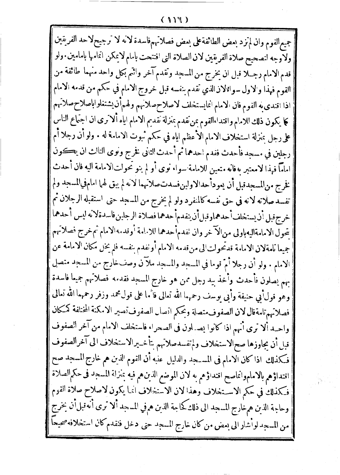 وَلَوْ أَنَّ رَجُلًا أَمَّ قَوْمًا فِي الْمَسْجِدِ وَالْمَسْجِدُ مَلْآنُ وَصَفٌّ خَارِجٌ مِنْ الْمَسْجِدِ مُتَّصِلٌ بِهِمْ يُصَلُّونَ فَأَحْدَثَ وَأَخَذَ بِيَدِ رَجُلٍ مِمَّنْ هُوَ خَارِجُ الْمَسْجِدِ فَقَدَّمَهُ فَصَلَاتُهُمْ جَمِيعًا فَاسِدَةٌ وَهُوَ قَوْلُ أَبِي حَنِيفَةَ وَأَبِي يُوسُفَ رَحِمَهُمَا اللَّهُ تَعَالَى فَأَمَّا عَلَى قَوْلِ مُحَمَّدٍ وَزُفَرَ رَحِمَهُمَا اللَّهُ تَعَالَى فَصَلَاتُهُمْ تَامَّةٌ قَالَ؛ لِأَنَّ الصُّفُوفَ مُتَّصِلَةٌ وَبِحُكْمِ اتِّصَالِ الصُّفُوفِ تَصِيرُ الْأَمْكِنَةُ الْمُخْتَلِفَةُ كَمَكَانٍ وَاحِدٍ.