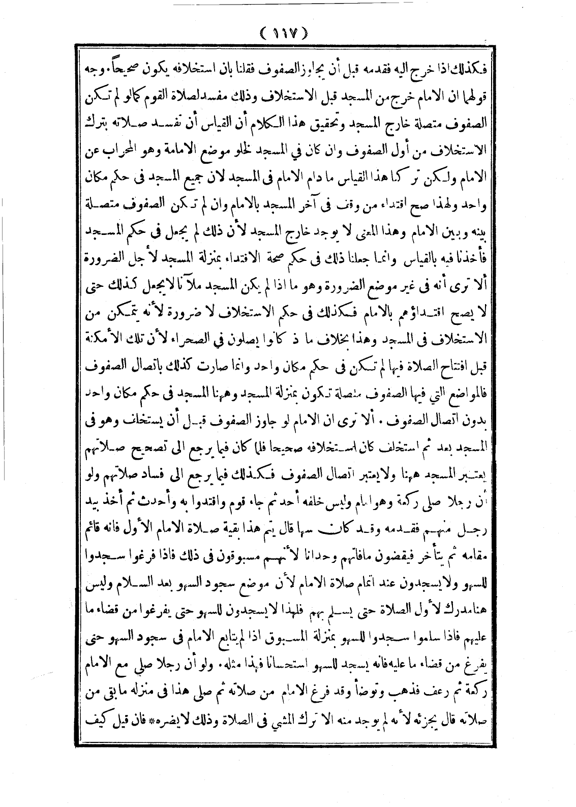 وَتَحْقِيقُ هَذَا الْكَلَامِ أَنَّ الْقِيَاسَ أَنْ تَفْسُدَ صَلَاتُهُ بِتَرْكِ الِاسْتِخْلَافِ مِنْ أَوَّلِ الصُّفُوفِ، وَإِنْ كَانَ فِي الْمَسْجِدِ لِخُلُوِّ مَوْضِعِ الْإِمَامَةِ وَهُوَ الْمِحْرَابُ عَنْ الْإِمَامِ وَلَكِنْ تَرَكْنَا هَذَا الْقِيَاسَ مَا دَامَ الْإِمَامُ فِي الْمَسْجِدِ؛ لِأَنَّ جَمِيعَ الْمَسْجِدِ فِي حُكْمِ مَكَان وَاحِدٍ؛ وَلِهَذَا صَحَّ اقْتِدَاءُ مَنْ وَقَفَ فِي آخِرِ الْمَسْجِدِ بِالْإِمَامِ، وَإِنْ لَمْ تَكُنْ الصُّفُوفُ مُتَّصِلَةً بَيْنَهُ وَبَيْنَ الْإِمَامِ، وَهَذَا الْمَعْنَى لَا يُوجَدُ خَارِجَ الْمَسْجِدِ؛ لِأَنَّ ذَلِكَ لَمْ يُجْعَلْ فِي حُكْمِ الْمَسْجِدِ فَأَخَذْنَا فِيهِ بِالْقِيَاسِ وَإِنَّمَا جَعَلْنَا ذَلِكَ فِي حُكْمِ صِحَّةِ الِاقْتِدَاءِ بِمَنْزِلَةِ الْمَسْجِدِ لِأَجْلِ الضَّرُورَةِ أَلَا تَرَى أَنَّهُ فِي غَيْرِ مَوْضِعِ الضَّرُورَةِ وَهُوَ مَا إذَا لَمْ يَكُنْ الْمَسْجِدُ مَلْآنًا لَا يَجْعَلُ كَذَلِكَ حَتَّى لَا يَصِحُّ اقْتِدَاؤُهُمْ بِالْإِمَامِ فَكَذَلِكَ فِي حُكْمِ الِاسْتِخْلَافِ لَا ضَرُورَةَ؛ لِأَنَّهُ يَتَمَكَّنُ مِنْ الِاسْتِخْلَافِ فِي الْمَسْجِدِ، وَهَذَا بِخِلَافِ مَا إذَا كَانُوا يُصَلُّونَ فِي الصَّحْرَاءِ؛ لِأَنَّ تِلْكَ الْأَمْكِنَةَ قَبْلَ افْتِتَاحِ الصَّلَاةِ فِيهَا لَمْ تَكُنْ فِي حُكْمِ مَكَان وَاحِدٍ، وَإِنَّمَا صَارَتْ كَذَلِكَ بِاتِّصَالِ الصُّفُوفِ فَالْمَوَاضِعُ الَّتِي فِيهَا الصُّفُوفُ مُتَّصِلَةٌ تَكُونُ بِمَنْزِلَةِ الْمَسْجِدِ، وَهَهُنَا الْمَسْجِدُ فِي حُكْمِ مَكَان وَاحِدٍ بِدُونِ اتِّصَالِ الصُّفُوفِ. أَلَا تَرَى أَنَّ الْإِمَامَ لَوْ جَاوَزَ الصُّفُوفَ قَبْلَ أَنْ يَسْتَخْلِفَ وَهُوَ فِي الْمَسْجِدِ بَعْدُ ثُمَّ اسْتَخْلَفَ كَانَ اسْتِخْلَافُهُ صَحِيحًا فَلَمَّا كَانَ فِيمَا يَرْجِعُ إلَى تَصْحِيحِ صَلَاتِهِمْ يُعْتَبَرُ الْمَسْجِدُ هَهُنَا وَلَا يُعْتَبَرُ اتِّصَالُ الصُّفُوفِ فَكَذَلِكَ فِيمَا يَرْجِعُ إلَى فَسَادِ صَلَاتِهِمْ