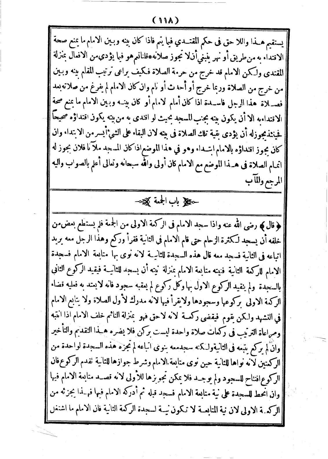 (بَابُ الْجُمُعَةِ) (قَالَ) - رَضِيَ اللَّهُ عَنْهُ - وَإِذَا سَجَدَ الْإِمَامُ فِي الرَّكْعَةِ الْأُولَى مِنْ الْجُمُعَةِ فَلَمْ يَسْتَطِعْ بَعْضُ مَنْ خَلْفَهُ أَنْ يَسْجُدَ لِكَثْرَةِ الزِّحَامِ حَتَّى قَامَ الْإِمَامُ فِي الثَّانِيَةِ فَقَرَأَ وَرَكَعَ وَهَذَا الرَّجُلُ مَعَهُ يُرِيدُ اتِّبَاعَهُ فِي الثَّانِيَةِ فَسَجَدَ مَعَهُ قَالَ هَذِهِ السَّجْدَةُ لِلثَّانِيَةِ؛ لِأَنَّهُ نَوَى بِهَا مُتَابَعَةَ الْإِمَامِ فَسَجْدَةُ الْإِمَامِ لِلرَّكْعَةِ الثَّانِيَةِ فَنِيَّتُهُ مُتَابَعَةَ الْإِمَامِ بِمَنْزِلَةِ نِيَّتِهِ أَنْ يَسْجُدَ لِلثَّانِيَةِ فَيُقَيَّدُ الرُّكُوعُ الثَّانِي بِالسَّجْدَةِ وَلَمْ يَتَقَيَّدْ الرُّكُوعُ الْأَوَّلُ بِهَا وَكُلُّ رُكُوعٍ لَمْ يَعْقُبْهُ سُجُودٌ فَإِنَّهُ لَا يُعْتَدُّ بِهِ فَعَلَيْهِ قَضَاءُ الرَّكْعَةِ الْأُولَى بِرُكُوعِهَا وَسُجُودِهَا وَلَا يَقْرَأُ فِيهَا؛ لِأَنَّهُ مُدْرِكٌ لِأَوَّلِ الصَّلَاةِ، وَلَا يُتَابِعُ الْإِمَامَ فِي التَّشَهُّدِ وَلَكِنْ يَقُومُ فَيَقْضِي رَكْعَةً؛ لِأَنَّهُ لَاحِقٌ فَهُوَ بِمَنْزِلَةِ النَّائِمِ خَلْفَ الْإِمَامِ إذَا انْتَبَهَ.