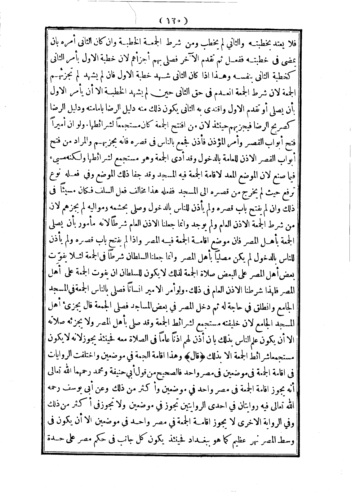 (قَالَ) وَهَذَا إقَامَةُ الْجُمُعَةِ فِي مَوْضِعَيْنِ: وَاخْتَلَفَتْ الرِّوَايَاتُ فِي إقَامَةِ الْجُمُعَةِ فِي مَوْضِعَيْنِ فِي مِصْرٍ وَاحِدٍ فَالصَّحِيحُ مِنْ قَوْلِ أَبِي حَنِيفَةَ وَمُحَمَّدٍ رَحِمَهُمَا اللَّهُ تَعَالَى أَنَّهُ يَجُوزُ إقَامَةُ الْجُمُعَةِ فِي مِصْرٍ وَاحِدٍ فِي مَوْضِعَيْنِ وَأَكْثَرَ مِنْ ذَلِكَ وَعَنْ أَبِي يُوسُفَ - رَحِمَهُ اللَّهُ تَعَالَى - فِيهِ رِوَايَتَانِ فِي إحْدَى الرِّوَايَتَيْنِ تَجُوزُ فِي مَوْضِعَيْنِ وَلَا تَجُوزُ فِي أَكْثَرَ مِنْ ذَلِكَ وَفِي الرِّوَايَةِ الْأُخْرَى لَا يَجُوزُ إقَامَةُ الْجُمُعَةِ فِي مِصْرٍ وَاحِدٍ فِي مَوْضِعَيْنِ إلَّا أَنْ يَكُونَ فِي وَسَطِ الْمِصْرِ نَهْرٌ عَظِيمٌ كَمَا هُوَ بِبَغْدَادَ فَحِينَئِذٍ يَكُونُ كُلُّ جَانِبٍ فِي حُكْمٍ مِصْرٍ عَلَى حِدَةٍ