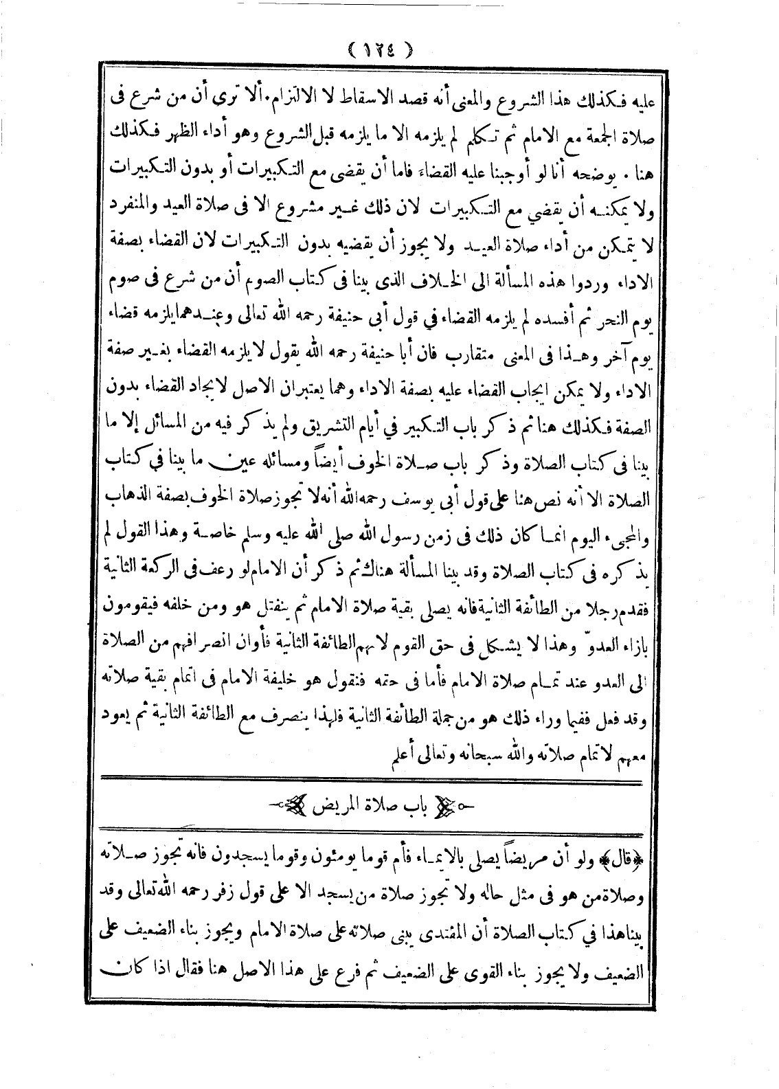 عَلَيْهِ فَكَذَلِكَ هَذَا الشُّرُوعُ وَالْمَعْنَى أَنَّهُ قَصَدَ الْإِسْقَاطَ لَا الِالْتِزَامَ. أَلَا تَرَى أَنَّ مَنْ شَرَعَ فِي صَلَاةِ الْجُمُعَةِ مَعَ الْإِمَامِ ثُمَّ تَكَلَّمَ لَمْ يَلْزَمْهُ إلَّا مَا يَلْزَمُهُ قَبْلَ الشُّرُوعِ وَهُوَ أَدَاءُ الظُّهْرِ فَكَذَلِكَ هُنَا. يُوَضِّحُهُ أَنَّا لَوْ أَوْجَبْنَا عَلَيْهِ الْقَضَاءَ فَإِمَّا أَنْ يَقْضِيَ مَعَ التَّكْبِيرَاتِ أَوْ بِدُونِ التَّكْبِيرَاتِ وَلَا يُمْكِنُهُ أَنْ يَقْضِيَ مَعَ التَّكْبِيرَاتِ؛ لِأَنَّ ذَلِكَ غَيْرُ مَشْرُوعٍ إلَّا فِي صَلَاةِ الْعِيدِ، وَالْمُنْفَرِدُ لَا يَتَمَكَّنُ مِنْ أَدَاءِ صَلَاةِ الْعِيدِ وَلَا يَجُوزُ أَنْ يَقْضِيَهُ بِدُونِ التَّكْبِيرَاتِ؛ لِأَنَّ الْقَضَاءَ بِصِفَةِ الْأَدَاءِ، وَرَدُّوا هَذِهِ الْمَسْأَلَةَ إلَى الْخِلَافِ الَّذِي بَيَّنَّا فِي كِتَابِ الصَّوْمِ أَنَّ مَنْ شَرَعَ فِي صَوْمِ يَوْمِ النَّحْرِ ثُمَّ أَفْسَدَهُ لَمْ يَلْزَمْهُ الْقَضَاءُ فِي قَوْلِ أَبِي حَنِيفَةَ - رَحِمَهُ اللَّهُ تَعَالَى - وَعِنْدَهُمَا يَلْزَمُهُ قَضَاءُ يَوْمٍ آخَرَ وَهَذَا فِي الْمَعْنَى مُتَقَارِبٌ فَإِنَّ أَبَا حَنِيفَةَ - رَحِمَهُ اللَّهُ - يَقُولُ لَا يَلْزَمُهُ الْقَضَاءُ بِغَيْرِ صِفَةِ الْأَدَاءِ وَلَا يُمْكِنُ إيجَابُ الْقَضَاءِ عَلَيْهِ بِصِفَةِ الْأَدَاءِ وَهُمَا يَعْتَبِرَانِ الْأَصْلَ لِإِيجَادِ الْقَضَاءِ بِدُونِ الصِّفَةِ فَكَذَلِكَ هُنَا ثُمَّ ذَكَرَ بَابَ التَّكْبِيرِ فِي أَيَّامِ التَّشْرِيقِ وَلَمْ يَذْكُرْ فِيهِ مِنْ الْمَسَائِلِ إلَّا مَا بَيَّنَّا فِي كِتَابِ الصَّلَاةِ