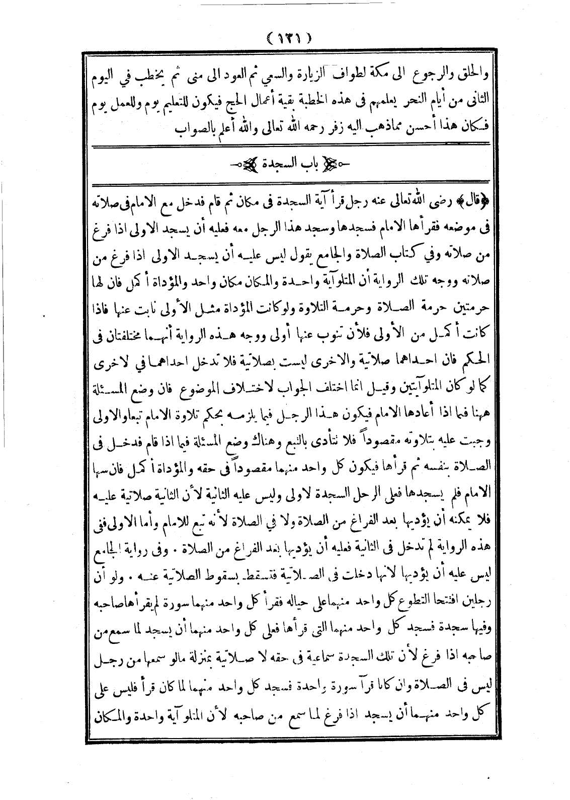 (بَابُ السَّجْدَةِ) (قَالَ) - رَضِيَ اللَّهُ تَعَالَى عَنْهُ - رَجُلٌ قَرَأَ آيَةَ السَّجْدَةِ فِي مَكَان ثُمَّ قَامَ فَدَخَلَ مَعَ الْإِمَامِ فِي صَلَاتِهِ فِي مَوْضِعِهِ فَقَرَأَهَا الْإِمَامُ فَسَجَدَهَا وَسَجَدَ هَذَا الرَّجُلُ مَعَهُ فَعَلَيْهِ أَنْ يَسْجُدَ الْأُولَى إذَا فَرَغَ مِنْ صَلَاتِهِ وَفِي كِتَابِ الصَّلَاةِ وَالْجَامِعِ يَقُولُ لَيْسَ عَلَيْهِ أَنْ يَسْجُدَ الْأُولَى إذَا فَرَغَ مِنْ صَلَاتِهِ وَوَجْهُ تِلْكَ الرِّوَايَةِ أَنَّ الْمَتْلُوَّ آيَةٌ وَاحِدَةٌ وَالْمَكَانَ مَكَانٌ وَاحِدٌ وَالْمُؤَدَّاةَ أَكْمَلُ فَإِنَّ لَهَا حُرْمَتَيْنِ حُرْمَةُ الصَّلَاةِ وَحُرْمَةُ التِّلَاوَةِ، وَلَوْ كَانَتْ الْمُؤَدَّاةُ مِثْلَ الْأُولَى نَابَتْ عَنْهَا فَإِذَا كَانَتْ أَكْمَلَ مِنْ الْأُولَى فَلَأَنْ تَنُوبَ عَنْهَا أَوْلَى وَوَجْهُ هَذِهِ الرِّوَايَةِ أَنَّهُمَا مُخْتَلِفَتَانِ فِي الْحُكْمِ فَإِنَّ إحْدَاهُمَا صَلَاتِيَّةٌ وَالْأُخْرَى لَيْسَتْ بِصَلَاتِيَّةٍ فَلَا تَدْخُلُ إحْدَاهُمَا فِي الْأُخْرَى كَمَا لَوْ كَانَ الْمَتْلُوُّ آيَتَيْنِ وَقِيلَ إنَّمَا اخْتَلَفَ الْجَوَابُ لِاخْتِلَافِ الْمَوْضُوعِ فَإِنَّ وَضْعَ الْمَسْأَلَةِ هَهُنَا فِيمَا إذَا أَعَادَهَا الْإِمَامُ فَيَكُونُ هَذَا الرَّجُلُ فِيمَا يَلْزَمُهُ بِحُكْمِ تِلَاوَةِ الْإِمَامِ تَبَعًا، وَالْأُولَى وَجَبَتْ عَلَيْهِ بِتِلَاوَتِهِ مَقْصُودًا فَلَا تَتَأَدَّى بِالتَّبَعِ وَهُنَاكَ وَضْعُ الْمَسْأَلَةِ فِيمَا إذَا قَامَ فَدَخَلَ فِي الصَّلَاةِ بِنَفْسِهِ ثُمَّ قَرَأَهَا فَيَكُونُ كُلُّ وَاحِدٍ مِنْهُمَا مَقْصُودًا فِي حَقِّهِ وَالْمُؤَدَّاةُ أَكْمَلُ، فَإِنْ سَهَا الْإِمَامُ فَلَمْ يَسْجُدْهَا فَعَلَى الرَّجُلِ السَّجْدَةُ الْأُولَى وَلَيْسَ عَلَيْهِ الثَّانِيَةُ؛ لِأَنَّ الثَّانِيَةَ صَلَاتِيَّةٌ عَلَيْهِ فَلَا يُمْكِنُهُ أَنْ يُؤَدِّيَهَا بَعْدَ الْفَرَاغِ مِنْ الصَّلَاةِ وَلَا فِي الصَّلَاةِ؛ لِأَنَّهُ تَبَعٌ لِلْإِمَامِ، وَأَمَّا الْأُولَى فَفِي هَذِهِ الرِّوَايَةِ لَمْ تَدْخُلْ فِي الثَّانِيَةِ فَعَلَيْهِ أَنْ يُؤَدِّيَهَا بَعْدَ الْفَرَاغِ مِنْ الصَّلَاةِ. وَفِي رِوَايَةِ الْجَامِعِ لَيْسَ عَلَيْهِ أَنْ يُؤَدِّيَهَا؛ لِأَنَّهَا دَخَلَتْ فِي الصَّلَاتِيَّةِ فَتَسْقُطُ بِسُقُوطِ الصَّلَاتِيَّةِ عَنْهُ.