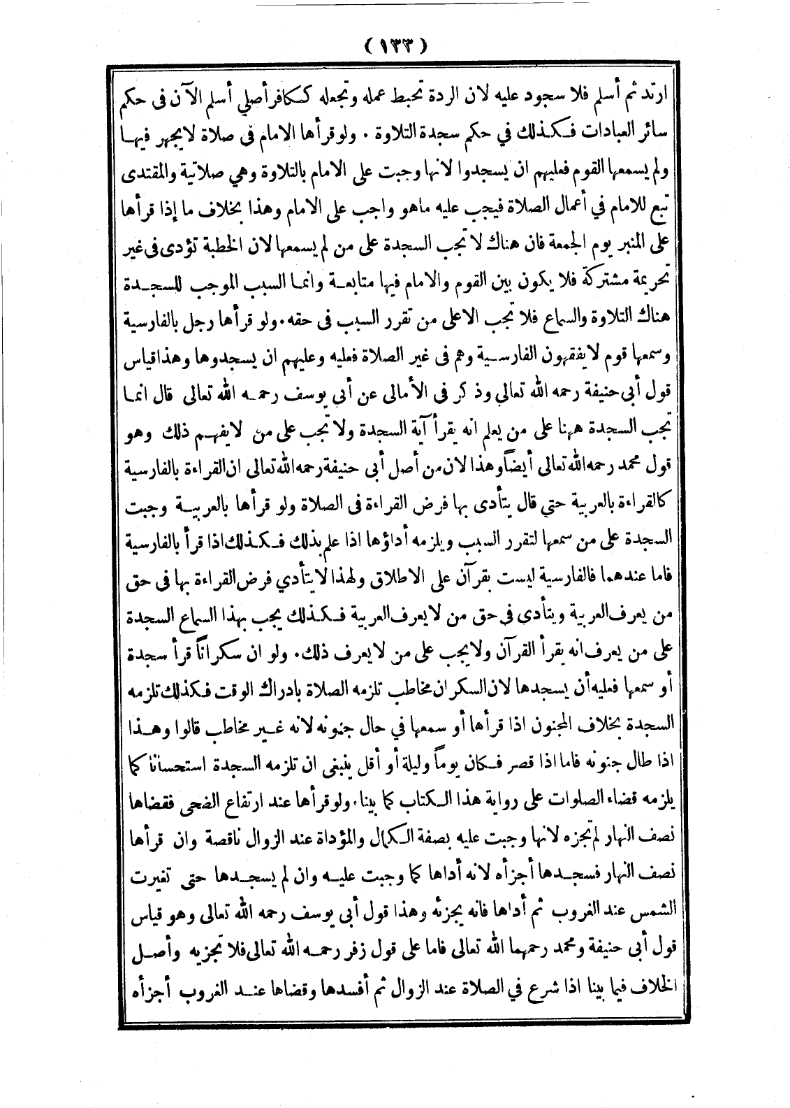 وَلَوْ قَرَأَهَا رَجُلٌ بِالْفَارِسِيَّةِ وَسَمِعَهَا قَوْمٌ لَا يَفْقَهُونَ الْفَارِسِيَّةَ وَهُمْ فِي غَيْرِ الصَّلَاةِ فَعَلَيْهِ وَعَلَيْهِمْ أَنْ يَسْجُدُوهَا وَهَذَا قِيَاسُ قَوْلِ أَبِي حَنِيفَةَ - رَحِمَهُ اللَّهُ تَعَالَى -، وَذَكَرَ فِي الْأَمَالِي عَنْ أَبِي يُوسُفَ - رَحِمَهُ اللَّهُ تَعَالَى - قَالَ إنَّمَا تَجِبُ السَّجْدَةُ هَهُنَا عَلَى مَنْ يَعْلَمُ أَنَّهُ يَقْرَأُ آيَةَ السَّجْدَةِ وَلَا تَجِبُ عَلَى مَنْ لَا يَفْهَمُ ذَلِكَ وَهُوَ قَوْلُ مُحَمَّدٍ - رَحِمَهُ اللَّهُ تَعَالَى - أَيْضًا وَهَذَا لِأَنَّ مِنْ أَصْلِ أَبِي حَنِيفَةَ - رَحِمَهُ اللَّهُ تَعَالَى - أَنَّ الْقِرَاءَةَ بِالْفَارِسِيَّةِ كَالْقِرَاءَةِ بِالْعَرَبِيَّةِ حَتَّى قَالَ يَتَأَدَّى بِهَا فَرْضُ الْقِرَاءَةِ فِي الصَّلَاةِ وَلَوْ قَرَأَهَا بِالْعَرَبِيَّةِ وَجَبَتْ السَّجْدَةُ عَلَى مَنْ سَمِعَهَا لِتَقَرُّرِ السَّبَبِ وَيَلْزَمُهُ أَدَاؤُهَا إذَا عَلِمَ بِذَلِكَ فَكَذَلِكَ إذَا قَرَأَ بِالْفَارِسِيَّةِ، فَأَمَّا عِنْدَهُمَا فَالْفَارِسِيَّةُ لَيْسَتْ بِقُرْآنٍ عَلَى الْإِطْلَاقِ وَلِهَذَا لَا يَتَأَدَّى فَرْضُ الْقِرَاءَةِ بِهَا فِي حَقِّ مَنْ يَعْرِفُ الْعَرَبِيَّةَ وَيَتَأَدَّى فِي حَقِّ مَنْ لَا يَعْرِفُ الْعَرَبِيَّةَ فَكَذَلِكَ يَجِبُ بِهَذَا السَّمَاعِ السَّجْدَةُ عَلَى مَنْ يَعْرِفْ أَنَّهُ يَقْرَأُ الْقُرْآنَ وَلَا يَجِبُ عَلَى مَنْ لَا يَعْرِفُ ذَلِكَ.