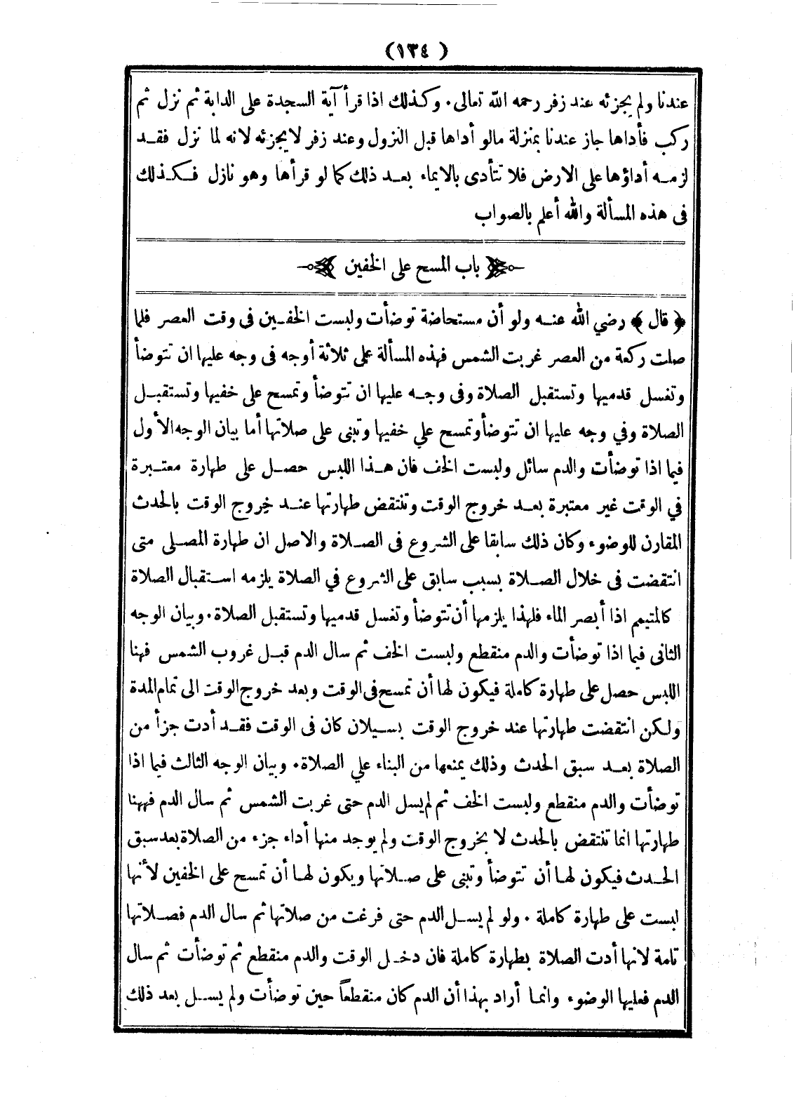 (بَابُ الْمَسْحِ عَلَى الْخُفَّيْنِ) (قَالَ) - رَضِيَ اللَّهُ عَنْهُ - وَلَوْ أَنَّ مُسْتَحَاضَةً تَوَضَّأَتْ وَلَبِسَتْ الْخُفَّيْنِ فِي وَقْتِ الْعَصْرِ فَلَمَّا صَلَّتْ رَكْعَةً مِنْ الْعَصْرِ غَرَبَتْ الشَّمْسُ فَهَذِهِ الْمَسْأَلَةُ عَلَى ثَلَاثَةِ أَوْجُهٍ: فِي وَجْهٍ عَلَيْهَا أَنْ تَتَوَضَّأَ وَتَغْسِلَ قَدَمَيْهَا وَتَسْتَقْبِلَ الصَّلَاة، وَفِي وَجْهٍ عَلَيْهَا أَنْ تَتَوَضَّأَ وَتَمْسَحَ عَلَى خُفَّيْهَا وَتَسْتَقْبِلَ الصَّلَاةَ، وَفِي وَجْهٍ عَلَيْهَا أَنْ تَتَوَضَّأَ وَتَمْسَحَ عَلَى خُفَّيْهَا وَتَبْنِيَ عَلَى صَلَاتِهَا، أَمَّا بَيَانُ الْوَجْهِ الْأَوَّلِ فِيمَا إذَا تَوَضَّأَتْ وَالدَّمُ سَائِلٌ وَلَبِسَتْ الْخُفُّ فَإِنَّ هَذَا اللُّبْسَ حَصَلَ عَلَى طَهَارَةٍ مُعْتَبَرَةٍ فِي الْوَقْتِ غَيْرِ مُعْتَبَرَةٍ بَعْدَ خُرُوجِ الْوَقْتِ وَتَنْتَقِضُ طَهَارَتُهَا عِنْدَ خُرُوجِ الْوَقْتِ بِالْحَدَثِ الْمُقَارِنِ لِلْوُضُوءِ وَكَانَ ذَلِكَ سَابِقًا عَلَى الشُّرُوعِ فِي الصَّلَاةِ.