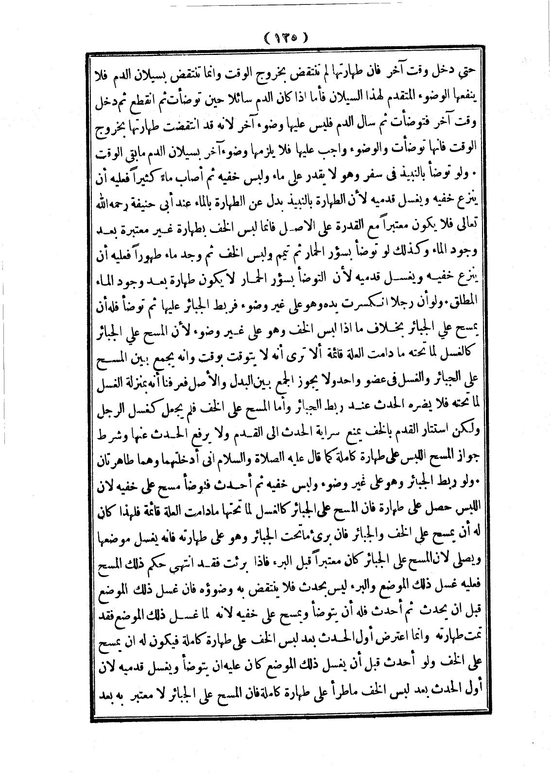 وَلَوْ رَبَطَ الْجَبَائِرَ وَهُوَ عَلَى غَيْرِ وُضُوءٍ وَلَبِسَ خُفَّيْهِ ثُمَّ أَحْدَثَ فَتَوَضَّأَ مَسَحَ عَلَى خُفَّيْهِ؛ لِأَنَّ اللُّبْسَ حَصَلَ عَلَى طَهَارَةٍ فَإِنَّ الْمَسْحَ عَلَى الْجَبَائِرِ كَالْغُسْلِ لِمَا تَحْتَهَا مَا دَامَتْ الْعِلَّةُ قَائِمَةً فَلِهَذَا كَانَ لَهُ أَنْ يَمْسَحَ عَلَى الْخُفِّ وَالْجَبَائِرِ، فَإِنْ بَرِئَ مَا تَحْتَ الْجَبَائِرِ وَهُوَ عَلَى طَهَارَتِهِ فَإِنَّهُ يَغْسِلُ مَوْضِعَهَا وَيُصَلِّي؛ لِأَنَّ الْمَسْحَ عَلَى الْجَبَائِرِ كَانَ مُعْتَبَرًا قَبْلَ الْبُرْءِ فَإِذَا بَرِئَتْ فَقَدْ انْتَهَى حُكْمُ ذَلِكَ الْمَسْحِ فَعَلَيْهِ غَسْلُ ذَلِكَ الْمَوْضِعِ، وَالْبُرْءُ لَيْسَ بِحَدَثٍ فَلَا يَنْتَقِضُ بِهِ وُضُوءُهُ فَإِنْ غَسَلَ ذَلِكَ الْمَوْضِعَ قَبْلَ أَنْ يُحْدِثَ ثُمَّ أَحْدَثَ فَلَهُ أَنْ يَتَوَضَّأَ وَيَمْسَحَ عَلَى خُفَّيْهِ؛ لِأَنَّهُ لَمَّا غَسَلَ ذَلِكَ الْمَوْضِعَ فَقَدْ تَمَّتْ طَهَارَتُهُ، وَإِنَّمَا اعْتَرَضَ أَوَّلُ الْحَدَثِ بَعْدَ لُبْسِ الْخُفِّ عَلَى طَهَارَةٍ كَامِلَةٍ فَيَكُونُ لَهُ أَنْ يَمْسَحَ عَلَى الْخُفِّ وَلَوْ أَحْدَثَ قَبْلَ أَنْ يَغْسِلَ ذَلِكَ الْمَوْضِعَ كَانَ عَلَيْهِ أَنْ يَتَوَضَّأَ وَيَغْسِلَ قَدَمَيْهِ؛ لِأَنَّ أَوَّلَ الْحَدَثِ بَعْدَ لُبْسِ الْخُفِّ مَا طَرَأَ عَلَى طَهَارَةٍ كَامِلَةٍ فَإِنَّ الْمَسْحَ عَلَى الْجَبَائِرِ لَا مُعْتَبَرَ بِهِ بَعْدَ