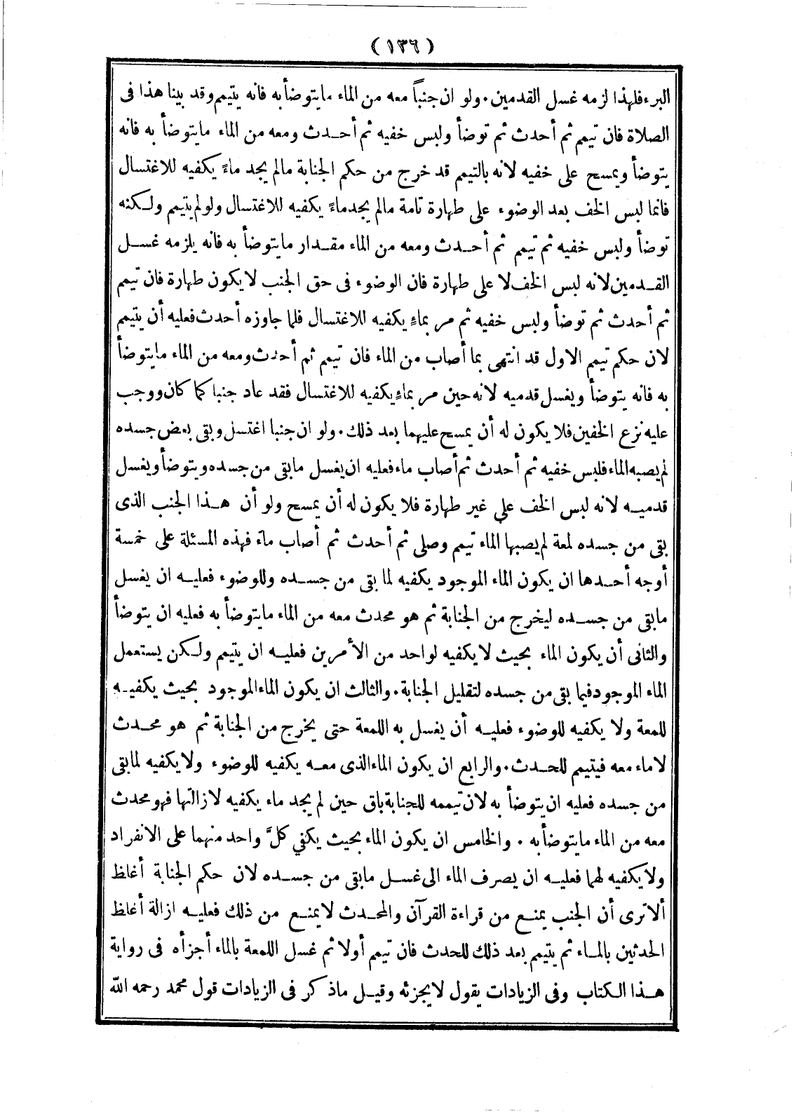 وَلَوْ أَنَّ جُنُبًا اغْتَسَلَ وَبَقِيَ بَعْضُ جَسَدِهِ لَمْ يُصِبْهُ الْمَاءُ فَلَبِسَ خُفَّيْهِ ثُمَّ أَحْدَثَ ثُمَّ أَصَابَ مَاءً فَعَلَيْهِ أَنْ يَغْسِلَ مَا بَقِيَ مِنْ جَسَدِهِ وَيَتَوَضَّأَ وَيَغْسِلَ قَدَمَيْهِ؛ لِأَنَّهُ لَبِسَ الْخُفَّ عَلَى غَيْرِ طَهَارَةٍ فَلَا يَكُونُ لَهُ أَنْ يَمْسَحَ وَلَوْ أَنَّ هَذَا الْجُنُبِ الَّذِي بَقِيَ مِنْ جَسَدِهِ لُمْعَةٌ لَمْ يُصِبْهَا الْمَاءُ تَيَمَّمَ وَصَلَّى ثُمَّ أَحْدَثَ ثُمَّ أَصَابَ مَاءً فَهَذِهِ الْمَسْأَلَةِ عَلَى خَمْسَةِ أَوْجُهٍ: