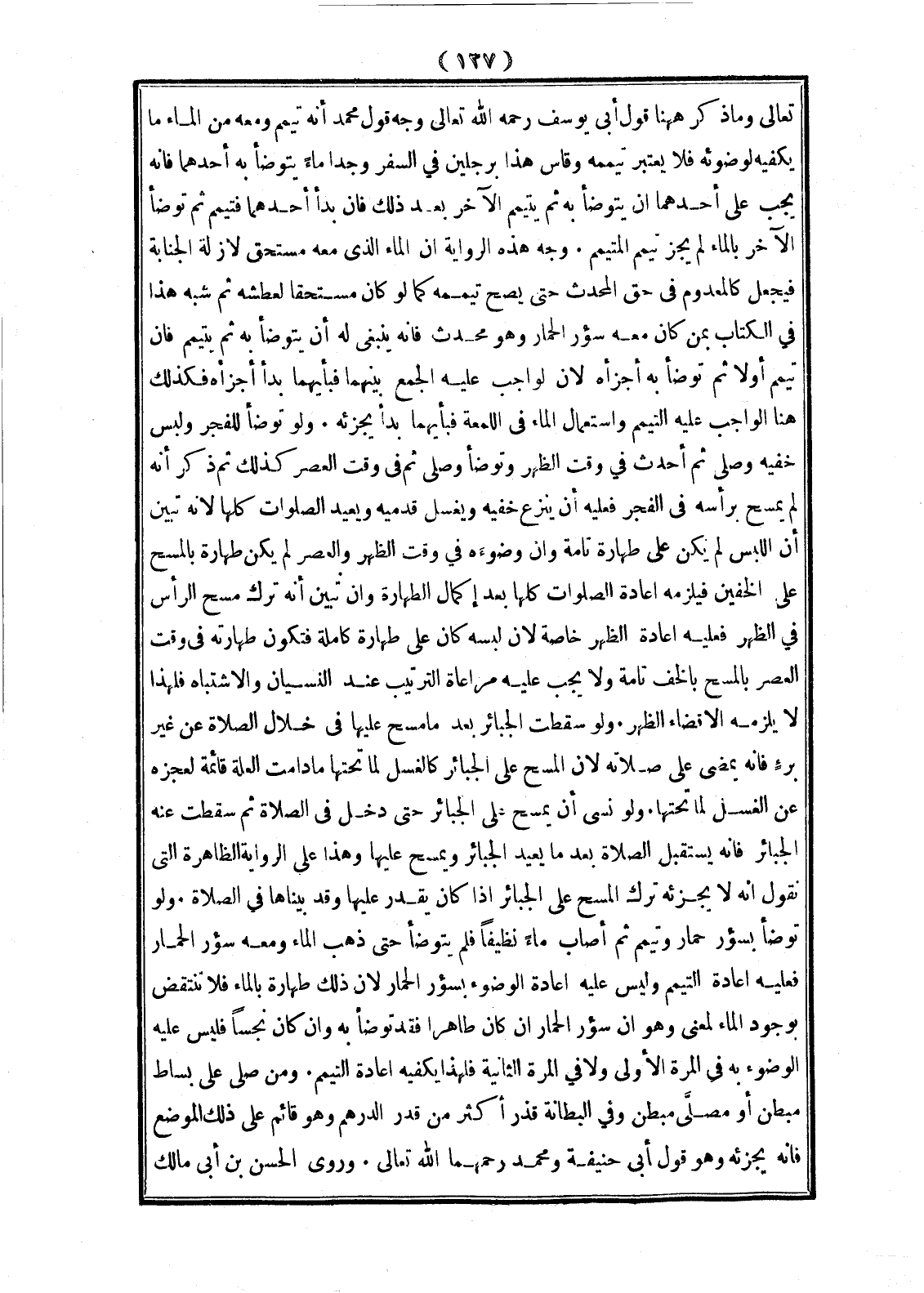 وَمَا ذُكِرَ هَهُنَا قَوْلُ أَبِي يُوسُفَ - رَحِمَهُ اللَّهُ تَعَالَى - وَجْهُ قَوْلِ مُحَمَّدٍ أَنَّهُ تَيَمَّمَ وَمَعَهُ مِنْ الْمَاءِ مَا يَكْفِيه لِوُضُوئِهِ فَلَا يُعْتَبَرُ تَيَمُّمُهُ وَقَاسَ هَذَا بِرَجُلَيْنِ فِي السَّفَرِ وَجَدَا مَاءً يَتَوَضَّأُ بِهِ أَحَدُهُمَا فَإِنَّهُ يَجِبُ عَلَى أَحَدِهِمَا أَنْ يَتَوَضَّأَ بِهِ ثُمَّ يَتَيَمَّمُ الْآخَرُ بَعْدَ ذَلِكَ فَإِنْ بَدَأَ أَحَدُهُمَا فَتَيَمَّمَ ثُمَّ تَوَضَّأَ الْآخَرُ بِالْمَاءِ لَمْ يَجُزْ تَيَمُّمُ الْمُتَيَمِّمِ. وَجْهُ هَذِهِ الرِّوَايَةِ أَنَّ الْمَاءَ الَّذِي مَعَهُ مُسْتَحَقٌّ لِإِزَالَةِ الْجَنَابَةِ فَيُجْعَلُ كَالْمَعْدُومِ فِي حَقِّ الْمُحْدِثِ حَتَّى يَصِحَّ تَيَمُّمُهُ كَمَا لَوْ كَانَ مُسْتَحَقًّا لِعَطَشِهِ، ثُمَّ شَبَّهَ هَذَا فِي الْكِتَابِ بِمَنْ كَانَ مَعَهُ سُؤْرُ الْحِمَارِ وَهُوَ مُحْدِثٌ فَإِنَّهُ يَنْبَغِي لَهُ أَنْ يَتَوَضَّأَ بِهِ ثُمَّ يَتَيَمَّمَ فَإِنْ تَيَمَّمَ أَوَّلًا ثُمَّ تَوَضَّأَ بِهِ أَجْزَأَهُ؛ لِأَنَّ الْوَاجِبَ عَلَيْهِ الْجَمْعُ بَيْنَهُمَا فَبِأَيِّهِمَا بَدَأَ أَجْزَأَهُ فَكَذَلِكَ هُنَا الْوَاجِبُ عَلَيْهِ التَّيَمُّمُ وَاسْتِعْمَالُ الْمَاءِ فِي اللُّمْعَةِ فَبِأَيِّهِمَا بَدَأَ يُجْزِئُهُ.