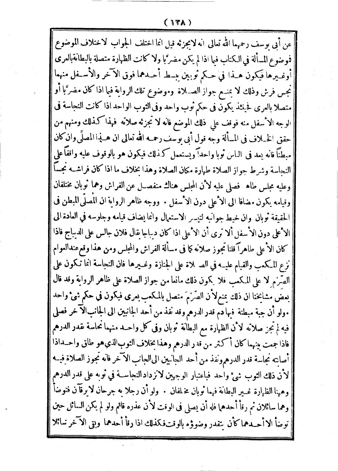عَنْ أَبِي يُوسُفَ رَحِمَهُمَا اللَّهُ تَعَالَى أَنَّهُ لَا يُجْزِئُهُ قِيلَ إنَّمَا اخْتَلَفَ الْجَوَابُ لِاخْتِلَافِ الْمَوْضُوعِ فَمَوْضُوعُ الْمَسْأَلَةِ فِي الْكِتَابِ فِيمَا إذَا لَمْ يَكُنْ مُضَرَّبًا وَلَا كَانَتْ الظِّهَارَةُ مُتَّصِلَةً بِالْبِطَانَةِ بِالْعُرَى أَوْ غَيْرِهَا فَيَكُونُ هَذَا فِي حُكْمِ ثَوْبَيْنِ يُبْسَطُ أَحَدُهُمَا فَوْقَ الْآخِرِ وَالْأَسْفَلُ مِنْهُمَا نَجِسُ فَرْشٍ وَذَلِكَ لَا يَمْنَعُ جَوَازَ الصَّلَاةِ وَمَوْضُوعُ تِلْكَ الرِّوَايَةِ فِيمَا إذَا كَانَ مُضَرَّبًا أَوْ مُتَّصِلًا بِالْعُرَى فَحِينَئِذٍ يَكُونُ فِي حُكْمِ ثَوْبٍ وَاحِدٍ وَفِي الثَّوْبِ الْوَاحِدِ إذَا كَانَتْ النَّجَاسَةُ فِي الْوَجْهِ الْأَسْفَلِ مِنْهُ فَوَقَفَ عَلَى ذَلِكَ الْمَوْضِعِ فَإِنَّهُ لَا تُجْزِئُهُ صَلَاتُهُ فَهَذَا كَذَلِكَ وَمِنْهُمْ مَنْ حَقَّقَ الْخِلَافَ فِي الْمَسْأَلَةِ.