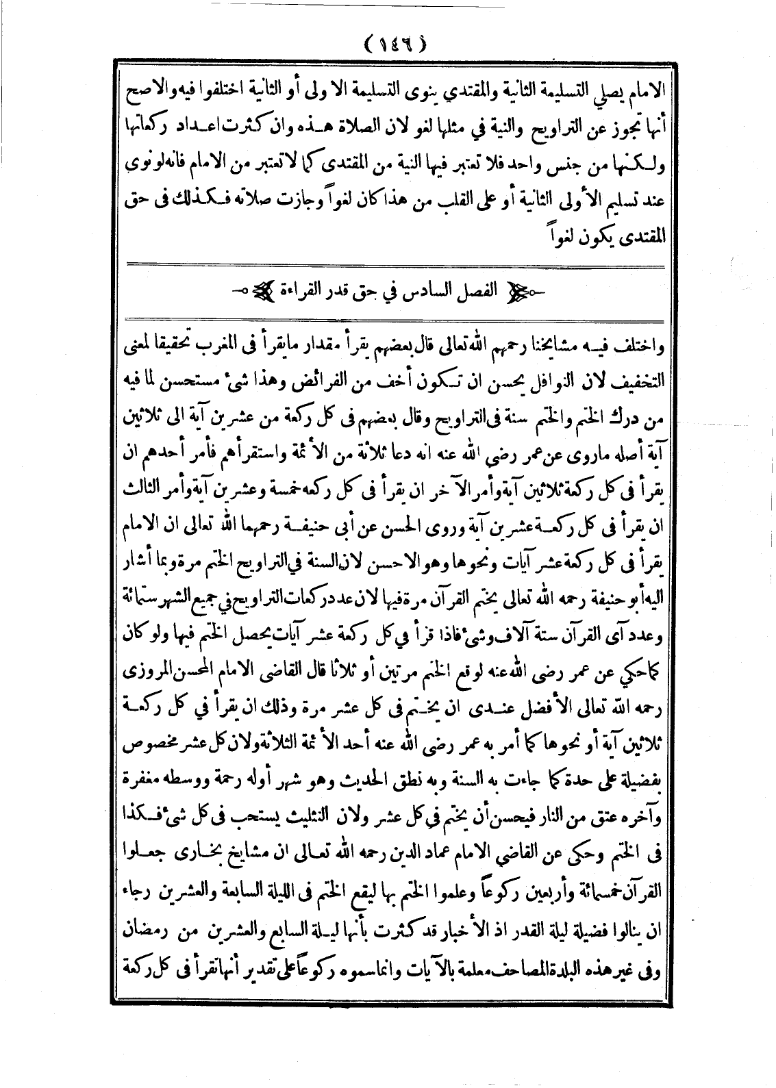 (الْفَصْلُ السَّادِسُ فِي حَقِّ قَدْرِ الْقِرَاءَةِ) وَاخْتَلَفَ فِيهِ مَشَايِخُنَا رَحِمَهُمْ اللَّهُ تَعَالَى قَالَ بَعْضُهُمْ يَقْرَأُ مِقْدَارَ مَا يَقْرَأُ فِي الْمَغْرِبِ تَحْقِيقًا لِمَعْنَى التَّخْفِيفِ؛ لِأَنَّ النَّوَافِلَ يَحْسُنُ أَنْ تَكُونَ أَخَفَّ مِنْ الْفَرَائِضِ وَهَذَا شَيْءٌ مُسْتَحْسَنٌ لِمَا فِيهِ مِنْ دَرْكِ الْخَتْمِ، وَالْخَتْمُ سُنَّةٌ فِي التَّرَاوِيحِ وَقَالَ بَعْضُهُمْ فِي كُلِّ رَكْعَةٍ مِنْ عِشْرِينَ آيَةً إلَى ثَلَاثِينَ آيَةً أَصْلُهُ مَا رُوِيَ عَنْ عُمَرَ - رَضِيَ اللَّهُ عَنْهُ - أَنَّهُ دَعَا ثَلَاثَةً مِنْ الْأَئِمَّةِ وَاسْتَقْرَأَهُمْ فَأَمَرَ أَحَدَهُمْ أَنْ يَقْرَأَ فِي كُلِّ رَكْعَةٍ ثَلَاثِينَ آيَةً وَأَمَرَ الْآخَرَ أَنْ يَقْرَأَ فِي كُلِّ رَكْعَةٍ خَمْسَةً وَعِشْرِينَ آيَةً وَأَمَرَ الثَّالِثَ أَنْ يَقْرَأَ فِي كُلِّ رَكْعَةٍ عِشْرِينَ آيَةً، وَرَوَى الْحَسَنُ عَنْ أَبِي حَنِيفَةَ رَحِمَهُمَا اللَّهُ تَعَالَى أَنَّ الْإِمَامَ يَقْرَأُ فِي كُلِّ رَكْعَةٍ عَشْرَ آيَاتٍ وَنَحْوَهَا وَهُوَ الْأَحْسَنُ؛ لِأَنَّ السُّنَّةَ فِي التَّرَاوِيحِ الْخَتْمُ مَرَّةً وَبِمَا أَشَارَ إلَيْهِ أَبُو حَنِيفَةَ - رَحِمَهُ اللَّهُ تَعَالَى - يُخْتَمُ الْقُرْآنُ مَرَّةً فِيهَا؛ لِأَنَّ عَدَدَ رَكَعَاتِ التَّرَاوِيحِ فِي جَمِيعِ الشَّهْرِ سِتُّمِائَةٍ وَعَدَدُ آيِ الْقُرْآنِ سِتَّةُ آلَافٍ وَشَيْءٍ فَإِذَا قَرَأَ فِي كُلِّ رَكْعَةٍ عَشْرَ آيَاتٍ يَحْصُلُ الْخَتْمُ فِيهَا، وَلَوْ كَانَ كَمَا حُكِيَ عَنْ عُمَرَ - رَضِيَ اللَّهُ عَنْهُ - لَوَقَعَ الْخَتْمُ مَرَّتَيْنِ أَوْ ثَلَاثًا قَالَ الْقَاضِي الْإِمَامُ الْمُحْسِنُ الْمَرْوَزِيُّ - رَحِمَهُ اللَّهُ تَعَالَى - الْأَفْضَلُ عِنْدِي أَنْ يَخْتِمَ فِي كُلِّ عَشْرٍ مَرَّةً وَذَلِكَ أَنْ يَقْرَأَ فِي كُلِّ رَكْعَةٍ ثَلَاثِينَ آيَةً أَوْ نَحْوَهَا كَمَا أَمَرَ بِهِ عُمَرُ - رَضِيَ اللَّهُ عَنْهُ - أَحَدَ الْأَئِمَّةِ الثَّلَاثَةِ وَلِأَنَّ كُلَّ عَشْرٍ مَخْصُوصٌ بِفَضِيلَةٍ عَلَى حِدَةٍ كَمَا جَاءَتْ بِهِ السُّنَّةُ وَبِهِ نَطَقَ الْحَدِيثُ وَهُوَ «شَهْرٌ أَوَّلُهُ رَحْمَةٌ وَوَسَطُهُ مَغْفِرَةٌ وَآخِرُهُ عِتْقٌ مِنْ النَّارِ» فَيَحْسُنُ أَنْ يَخْتِمَ فِي كُلِّ عَشْرٍ وَلِأَنَّ التَّثْلِيثَ يُسْتَحَبُّ فِي كُلِّ شَيْءٍ فَكَذَا فِي الْخَتْمِ وَحَكَى عَنْ الْقَاضِي الْإِمَامِ عِمَادِ الدِّينِ - رَحِمَهُ اللَّهُ تَعَالَى - أَنَّ مَشَايِخ بُخَارَى جَعَلُوا الْقُرْآنَ خَمْسَمِائَةٍ وَأَرْبَعِينَ رُكُوعًا وَعَلِمُوا الْخَتْمَ بِهَا لِيَقَعَ الْخَتْمُ فِي اللَّيْلَةِ السَّابِعَةِ وَالْعِشْرِينَ رَجَاءَ أَنْ يَنَالُوا فَضِيلَةَ لَيْلَةِ الْقَدْرِ إذْ الْأَخْبَارُ قَدْ كَثُرَتْ بِأَنَّهَا لَيْلَةَ السَّابِعِ وَالْعِشْرِينَ مِنْ رَمَضَانَ وَفِي غَيْرِ هَذِهِ الْبَلْدَةِ الْمَصَاحِفُ مُعَلَّمَةٌ بِالْآيَاتِ، وَإِنَّمَا سَمَّوْهُ رُكُوعًا عَلَى تَقْدِيرِ أَنَّهَا تُقْرَأَ فِي كُلِّ رَكْعَةٍ.