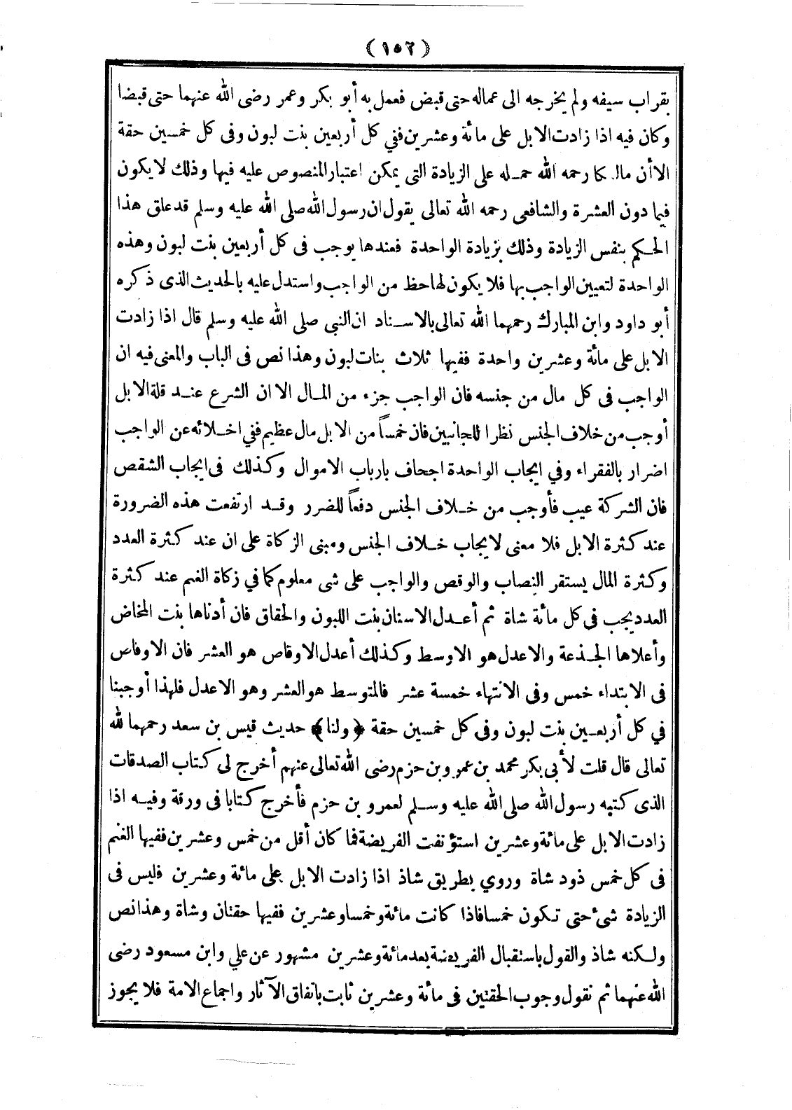 بِقِرَابِ سَيْفِهِ وَلَمْ يَخْرُجْهُ إلَى عُمَّالِهِ حَتَّى قُبِضَ فَعَمِلَ بِهِ أَبُو بَكْرٍ وَعُمَرُ - رَضِيَ اللَّهُ عَنْهُمَا - حَتَّى قُبِضَا وَكَانَ فِيهِ إذَا زَادَتْ الْإِبِلُ عَلَى مِائَةٍ وَعِشْرِينَ فَفِي كُلِّ أَرْبَعِينَ بِنْتُ لَبُونٍ وَفِي كُلِّ خَمْسِينَ حِقَّةٌ» إلَّا أَنَّ مَالِكًا - رَحِمَهُ اللَّهُ - حَمَلَهُ عَلَى الزِّيَادَةِ الَّتِي يُمْكِنُ اعْتِبَارُ الْمَنْصُوصِ عَلَيْهِ فِيهَا، وَذَلِكَ لَا يَكُونُ فِيمَا دُونَ الْعَشَرَةِ وَالشَّافِعِيُّ - رَحِمَهُ اللَّهُ تَعَالَى - يَقُولُ إنَّ رَسُولَ اللَّهِ - صَلَّى اللَّهُ عَلَيْهِ وَسَلَّمَ - قَدْ عَلَّقَ هَذَا الْحُكْمَ بِنَفْسِ الزِّيَادَةِ، وَذَلِكَ بِزِيَادَةِ الْوَاحِدَةِ فَعِنْدَهَا يُوجَبُ فِي كُلِّ أَرْبَعِينَ بِنْتُ لَبُونٍ وَهَذِهِ الْوَاحِدَةُ لِتَعْيِينِ الْوَاجِبِ بِهَا فَلَا يَكُونُ لَهَا حَظٌّ مِنْ الْوَاجِبِ. وَاسْتَدَلَّ عَلَيْهِ بِالْحَدِيثِ الَّذِي ذَكَرَهُ أَبُو دَاوُد وَابْنُ الْمُبَارَكِ - رَحِمَهُمَا اللَّهُ تَعَالَى - بِالْإِسْنَادِ أَنَّ النَّبِيَّ - صَلَّى اللَّهُ عَلَيْهِ وَسَلَّمَ - «إذَا زَادَتْ الْإِبِلُ عَلَى مِائَةٍ وَعِشْرِينَ وَاحِدَةً فَفِيهَا ثَلَاثُ بَنَاتِ لَبُونٍ» وَهَذَا نَصٌّ فِي الْبَابِ وَالْمَعْنَى فِيهِ أَنَّ الْوَاجِبَ فِي كُلِّ مَالٍ مِنْ جِنْسِهِ، فَإِنَّ الْوَاجِبَ جُزْءٌ مِنْ الْمَالِ إلَّا أَنَّ الشَّرْعَ عِنْدَ قِلَّةِ الْإِبِلِ أَوْجَبَ مِنْ خِلَافِ الْجِنْسِ نَظَرًا لِلْجَانِبَيْنِ، فَإِنَّ خَمْسًا مِنْ الْإِبِلِ مَالٌ عَظِيمٌ فَفِي إخْلَائِهِ عَنْ الْوَاجِبِ إضْرَارٌ بِالْفُقَرَاءِ، وَفِي إيجَابِ الْوَاحِدَةِ إجْحَافٌ بِأَرْبَابِ الْأَمْوَالِ، وَكَذَلِكَ فِي إيجَابِ الشِّقْصِ، فَإِنَّ الشَّرِكَةَ عَيْبٌ فَأَوْجَبَ مِنْ خِلَافِ الْجِنْسِ دَفْعًا لِلضَّرَرِ وَقَدْ ارْتَفَعَتْ هَذِهِ الضَّرُورَةُ عِنْدَ كَثْرَةِ الْإِبِلِ فَلَا مَعْنَى لِإِيجَابِ خِلَافِ الْجِنْسِ. وَمَبْنَى الزَّكَاةِ عَلَى أَنَّ عِنْدَ كَثْرَةِ الْعَدَدِ وَكَثْرَةِ الْمَالِ يَسْتَقِرُّ النِّصَابُ وَالْوَقَصُ وَالْوَاجِبُ عَلَى شَيْءٍ مَعْلُومٍ كَمَا فِي زَكَاةِ الْغَنَمِ عِنْدَ كَثْرَةِ الْعَدَدِ يَجِبُ فِي كُلِّ مِائَةِ شَاةٌ، ثُمَّ أَعْدَلُ الْأَسْنَانِ بِنْتُ اللَّبُونِ وَالْحِقَاقُ، فَإِنَّ أَدْنَاهَا بِنْتُ الْمَخَاضِ وَأَعْلَاهَا الْجَذَعَةُ وَالْأَعْدَلُ هُوَ الْأَوْسَطُ، وَكَذَلِكَ أَعْدَلُ الْأَوْقَاصِ هُوَ الْعَشْرُ، فَإِنَّ الْأَوْقَاصَ فِي الِابْتِدَاءِ خَمْسٌ، وَفِي الِانْتِهَاءِ خَمْسَةَ عَشْرَ فَالْمُتَوَسِّطُ هُوَ الْعَشْرُ وَهُوَ الْأَعْدَلُ فَلِهَذَا أَوْجَبْنَا فِي كُلِّ أَرْبَعِينَ بِنْتَ لَبُونٍ وَفِي كُلِّ خَمْسِينَ حِقَّةً.