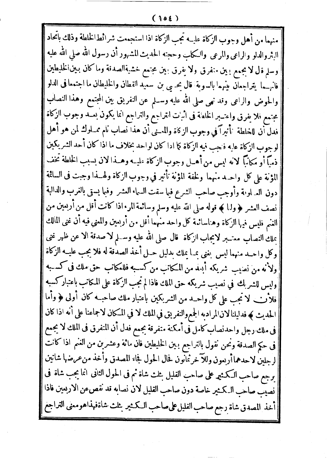مِنْهُمَا مِنْ أَهْلِ وُجُوبِ الزَّكَاةِ عَلَيْهِ تَجِبُ الزَّكَاةُ إذَا اُسْتُجْمِعَتْ شَرَائِطُ الْخُلْطَةِ، وَذَلِكَ بِاتِّحَادِ الْبِئْرِ وَالدَّلْوِ وَالرَّاعِي وَالْمَرْعَى وَالْكَلْبِ، وَحُجَّتُهُ الْحَدِيثُ الْمَشْهُورُ أَنَّ رَسُولَ اللَّهِ - صَلَّى اللَّهُ عَلَيْهِ وَسَلَّمَ - قَالَ «لَا يُجْمَعُ بَيْنَ مُتَفَرِّقٍ وَلَا يُفَرَّقُ بَيْنَ مُجْتَمِعٍ خَشْيَةَ الصَّدَقَةِ وَمَا كَانَ بَيْنَ الْخَلِيطَيْنِ، فَإِنَّهُمَا يَتَرَاجَعَانِ بَيْنَهُمَا بِالسَّوِيَّةِ» قَالَ يَحْيَى بْنُ سَعِيدٍ الْقَطَّانُ: وَالْخَلِيطَانِ مَا اجْتَمَعَا فِي الدَّلْوِ وَالْحَوْضِ وَالرَّاعِي وَقَدْ نَهَى - صَلَّى اللَّهُ عَلَيْهِ وَسَلَّمَ - عَنْ التَّفْرِيقِ بَيْنَ الْمُجْتَمِعِ، وَهَذَا النِّصَابُ مُجْتَمِعٌ فَلَا يُفَرَّقُ وَاعْتَبَرَ الْخُلْطَةَ فِي إثْبَاتِ التَّرَاجُعِ، وَالتَّرَاجُعُ إنَّمَا يَكُونُ بَعْدَ وُجُوبِ الزَّكَاةِ فَدَلَّ أَنَّ لِلْخُلْطَةِ تَأْثِيرًا فِي وُجُوبِ الزَّكَاةِ، وَالْمَعْنَى أَنَّ هَذَا نِصَابٌ تَامٌّ مَمْلُوكٌ لِمَنْ هُوَ أَهْلٌ لِوُجُوبِ الزَّكَاةِ عَلَيْهِ فَيَجِبُ فِيهِ الزَّكَاةُ كَمَا إذَا كَانَ لِوَاحِدٍ بِخِلَافِ مَا إذَا كَانَ أَحَدُ الشَّرِيكَيْنِ ذِمِّيًّا أَوْ مُكَاتَبًا؛ لِأَنَّهُ لَيْسَ مِنْ أَهْلِ وُجُوبِ الزَّكَاةِ عَلَيْهِ، وَهَذَا؛ لِأَنَّ بِسَبَبِ الْخُلْطَةِ تَخِفُّ الْمُؤْنَةُ عَلَى كُلِّ وَاحِدٍ مِنْهُمَا وَلِخِفَّةِ الْمُؤْنَةِ تَأْثِيرٌ فِي وُجُوبِ الزَّكَاةِ وَلِهَذَا وَجَبَتْ فِي السَّائِمَةِ دُونَ الْعَلُوفَةِ، وَأَوْجَبَ صَاحِبُ الشَّرْعِ فِيمَا سَقَتْ السَّمَاءُ الْعُشْرَ وَفِيمَا يُسْقَى بِالْغَرْبِ وَالدَّالِيَةِ نِصْفَ الْعُشْرِ.