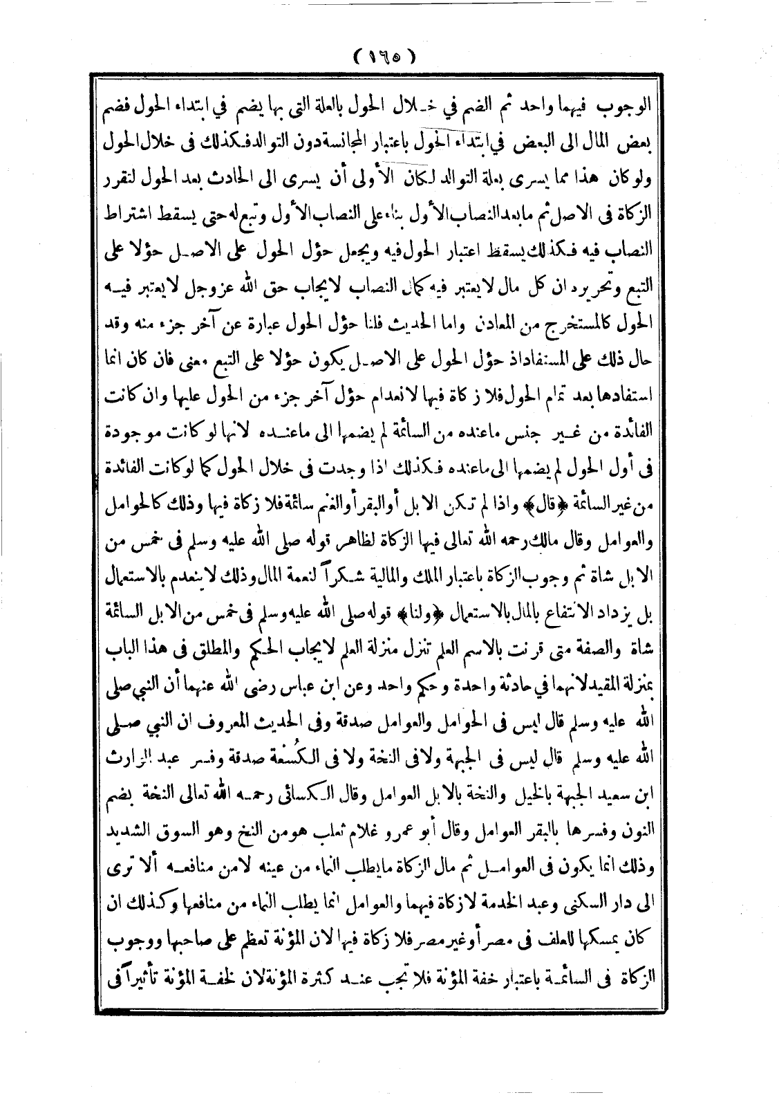 الْوُجُوبِ فِيهِمَا وَاحِدٌ، ثُمَّ الضَّمُّ فِي خِلَالِ الْحَوْلِ بِالْعِلَّةِ الَّتِي بِهَا يُضَمُّ فِي ابْتِدَاءِ الْحَوْلِ فَضَمُّ بَعْضِ الْمَالِ إلَى الْبَعْضِ فِي ابْتِدَاءِ الْحَوْلِ بِاعْتِبَارِ الْمُجَانَسَةِ دُونَ التَّوَالُدِ فَكَذَلِكَ فِي خِلَالِ الْحَوْلِ وَلَوْ كَانَ هَذَا مِمَّا يَسْرِي بِعِلَّةِ التَّوَالُدِ لَكَانَ الْأَوْلَى أَنْ يَسْرِيَ إلَى الْحَادِثِ بَعْدَ الْحَوْلِ لِتَقَرُّرِ الزَّكَاةِ فِي الْأَصْلِ، ثُمَّ مَا بَعْدَ النِّصَابِ الْأَوَّلِ بِنَاءٌ عَلَى النِّصَابِ الْأَوَّلِ وَتَبَعٌ لَهُ حَتَّى يَسْقُطَ اشْتِرَاطُ النِّصَابِ فِيهِ، فَكَذَلِكَ يَسْقُطُ اعْتِبَارُ الْحَوْلِ فِيهِ وَيُجْعَلُ حُؤُولُ الْحَوْلِ عَلَى الْأَصْلِ حُؤُولًا عَلَى التَّبَعِ وَتَحْرِيرُهُ أَنَّ كُلَّ مَالٍ لَا يُعْتَبَرُ فِيهِ كَمَالُ النِّصَابِ لِإِيجَابِ حَقِّ اللَّهِ عَزَّ وَجَلَّ لَا يُعْتَبَرُ فِيهِ الْحَوْلُ كَالْمُسْتَخْرَجِ مِنْ الْمَعَادِنِ. وَأَمَّا الْحَدِيثُ قُلْنَا حُؤُولُ الْحَوْلِ عِبَارَةٌ عَنْ آخِرِ جُزْءٍ مِنْهُ، وَقَدْ حَالَ ذَلِكَ عَلَى الْمُسْتَفَادِ؛ إذْ حُؤُولُ الْحَوْلِ عَلَى الْأَصْلِ يَكُونُ حُؤُولًا عَلَى التَّبَعِ مَعْنًى فَإِنْ كَانَ إنَّمَا اسْتَفَادَهَا بَعْدَ تَمَامِ الْحَوْلِ فَلَا زَكَاةَ فِيهَا لِانْعِدَامِ حُؤُولِ آخِرِ جُزْءٍ مِنْ الْحَوْلِ عَلَيْهَا، وَإِنْ كَانَتْ الْفَائِدَةُ مِنْ غَيْرِ جِنْسِ مَا عِنْدَهُ مِنْ السَّائِمَةِ لَمْ يَضُمَّهَا إلَى مَا عِنْدَهُ؛ لِأَنَّهَا لَوْ كَانَتْ مَوْجُودَةً فِي أَوَّلِ الْحَوْلِ لَمْ يَضُمَّهَا إلَى مَا عِنْدَهُ، فَكَذَلِكَ إذَا وُجِدَتْ فِي خِلَالِ الْحَوْلِ كَمَا لَوْ كَانَتْ الْفَائِدَةُ مِنْ غَيْرِ السَّائِمَةِ