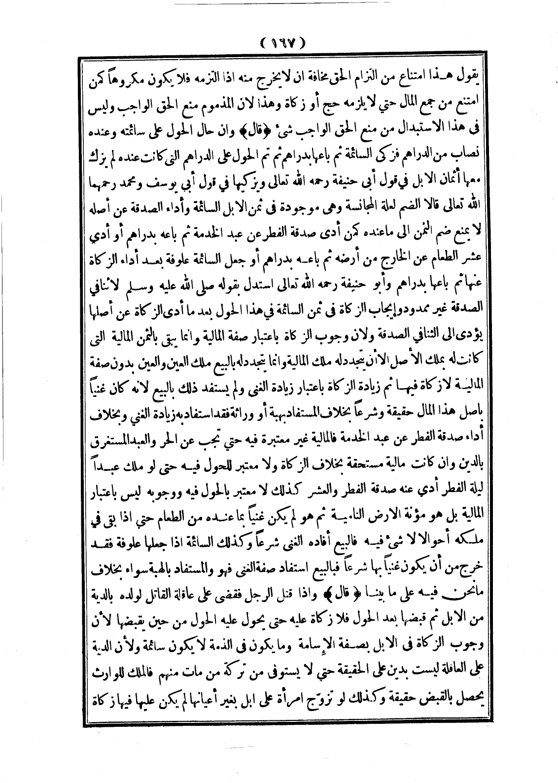 (قَالَ) وَإِنْ حَالَ الْحَوْلُ عَلَى سَائِمَتِهِ، وَعِنْدَهُ نِصَابٌ مِنْ الدَّرَاهِمِ فَزَكَّى السَّائِمَةَ، ثُمَّ بَاعَهَا بِدَرَاهِمَ ثُمَّ تَمَّ الْحَوْلُ عَلَى الدَّرَاهِمِ الَّتِي كَانَتْ عِنْدَهُ لَمْ يُزَكِّ مَعَهَا أَثْمَانَ الْإِبِلِ فِي قَوْلِ أَبِي حَنِيفَةَ - رَحِمَهُ اللَّهُ تَعَالَى - وَيُزَكِّيهَا فِي قَوْلِ أَبِي يُوسُفَ وَمُحَمَّدٍ - رَحِمَهُمَا اللَّهُ تَعَالَى - قَالَا: الضَّمُّ لِعِلَّةِ الْمُجَانَسَةِ وَهِيَ مَوْجُودَةٌ فِي ثَمَنِ الْإِبِلِ السَّائِمَةِ، وَأَدَاءُ الصَّدَقَةِ عَنْ أَصْلِهِ لَا يَمْنَعُ ضَمَّ الثَّمَنِ إلَى مَا عِنْدَهُ كَمَنْ أَدَّى صَدَقَةَ الْفِطْرِ عَنْ عَبْدِ الْخِدْمَةِ، ثُمَّ بَاعَهُ بِدَرَاهِمَ أَوْ أَدَّى عُشْرَ الطَّعَامِ عَنْ الْخَارِجِ مِنْ أَرْضِهِ، ثُمَّ بَاعَهُ بِدَرَاهِمَ أَوْ جَعَلَ السَّائِمَةَ عَلُوفَةً بَعْدَ أَدَاءِ الزَّكَاةِ عَنْهَا، ثُمَّ بَاعَهَا بِدَرَاهِمَ وَأَبُو حَنِيفَةَ - رَحِمَهُ اللَّهُ تَعَالَى - اسْتَدَلَّ بِقَوْلِهِ - صَلَّى اللَّهُ عَلَيْهِ وَسَلَّمَ - «لَا ثِنَا فِي الصَّدَقَةِ» غَيْرِ مَمْدُودٍ. وَإِيجَابُ الزَّكَاةِ فِي ثَمَنِ السَّائِمَةِ فِي هَذَا الْحَوْلِ بَعْدَ مَا أَدَّى الزَّكَاةَ عَنْ أَصْلِهَا يُؤَدِّي إلَى الثِّنَى فِي الصَّدَقَةِ وَلِأَنَّ وُجُوبَ الزَّكَاةِ بِاعْتِبَارِ صِفَةِ الْمَالِيَّةِ وَإِنَّمَا يَبْقَى بِالثَّمَنِ الْمَالِيَّةُ الَّتِي كَانَتْ لَهُ بِمِلْكِ الْأَصْلِ إلَّا أَنْ يَتَجَدَّدَ لَهُ مِلْكُ الْمَالِيَّةِ، وَإِنَّمَا يَتَجَدَّدُ لَهُ بِالْبَيْعِ مِلْكُ الْعَيْنِ وَالْعَيْنُ بِدُونِ صِفَةِ الْمَالِيَّةِ لَا زَكَاةَ فِيهَا، ثُمَّ زِيَادَةُ الزَّكَاةِ بِاعْتِبَارِ زِيَادَةِ الْغِنَى، وَلَمْ يُسْتَفَدْ ذَلِكَ بِالْبَيْعِ؛ لِأَنَّهُ كَانَ غَنِيًّا بِأَصْلِ هَذَا الْمَالِ حَقِيقَةً وَشَرْعًا بِخِلَافِ الْمُسْتَفَادِ بِهِبَةٍ أَوْ وِرَاثَةٍ فَقَدْ اسْتَفَادَ بِهِ زِيَادَةَ الْغِنَى وَبِخِلَافِ أَدَاءِ صَدَقَةِ الْفِطْرِ عَنْ عَبْدِ الْخِدْمَةِ فَالْمَالِيَّةُ غَيْرُ مُعْتَبَرَةٍ فِيهِ حَتَّى تَجِبَ عَنْ الْحُرِّ وَالْعَبْدِ الْمُسْتَغْرَقِ انْتَقَصَ بِالدَّيْنِ وَإِنْ كَانَتْ مَالِيَّةً مُسْتَحَقَّةً بِخِلَافِ الزَّكَاةِ وَلَا مُعْتَبَرَ لِلْحَوْلِ فِيهِ حَتَّى لَوْ مَلَكَ عَبْدًا لَيْلَةَ الْفِطْرِ أَدَّى عَنْهُ صَدَقَةَ الْفِطْرِ وَالْعُشْرَ كَذَلِكَ لَا مُعْتَبَرَ بِالْحَوْلِ فِيهِ وَوُجُوبُهُ لَيْسَ بِاعْتِبَارِ الْمَالِيَّةِ بَلْ هُوَ مُؤْنَةُ الْأَرْضِ النَّامِيَةِ، ثُمَّ هُوَ لَمْ يَكُنْ غَنِيًّا بِمَا عِنْدَهُ مِنْ الطَّعَامِ حَتَّى إذَا بَقِيَ فِي مِلْكِهِ أَحْوَالًا لَا شَيْءَ فِيهِ فَالْبَيْعُ أَفَادَهُ الْغِنَى شَرْعًا وَكَذَلِكَ السَّائِمَةُ إذَا جَعَلَهَا عَلُوفَةً فَقَدْ خَرَجَ مِنْ أَنْ يَكُونَ غَنِيًّا بِهَا شَرْعًا فَبِالْبَيْعِ اسْتَفَادَ صِفَةَ الْغِنَى فَهُوَ وَالْمُسْتَفَادُ بِالْهِبَةِ سَوَاءٌ بِخِلَافِ مَا نَحْنُ فِيهِ عَلَى مَا بَيَّنَّا