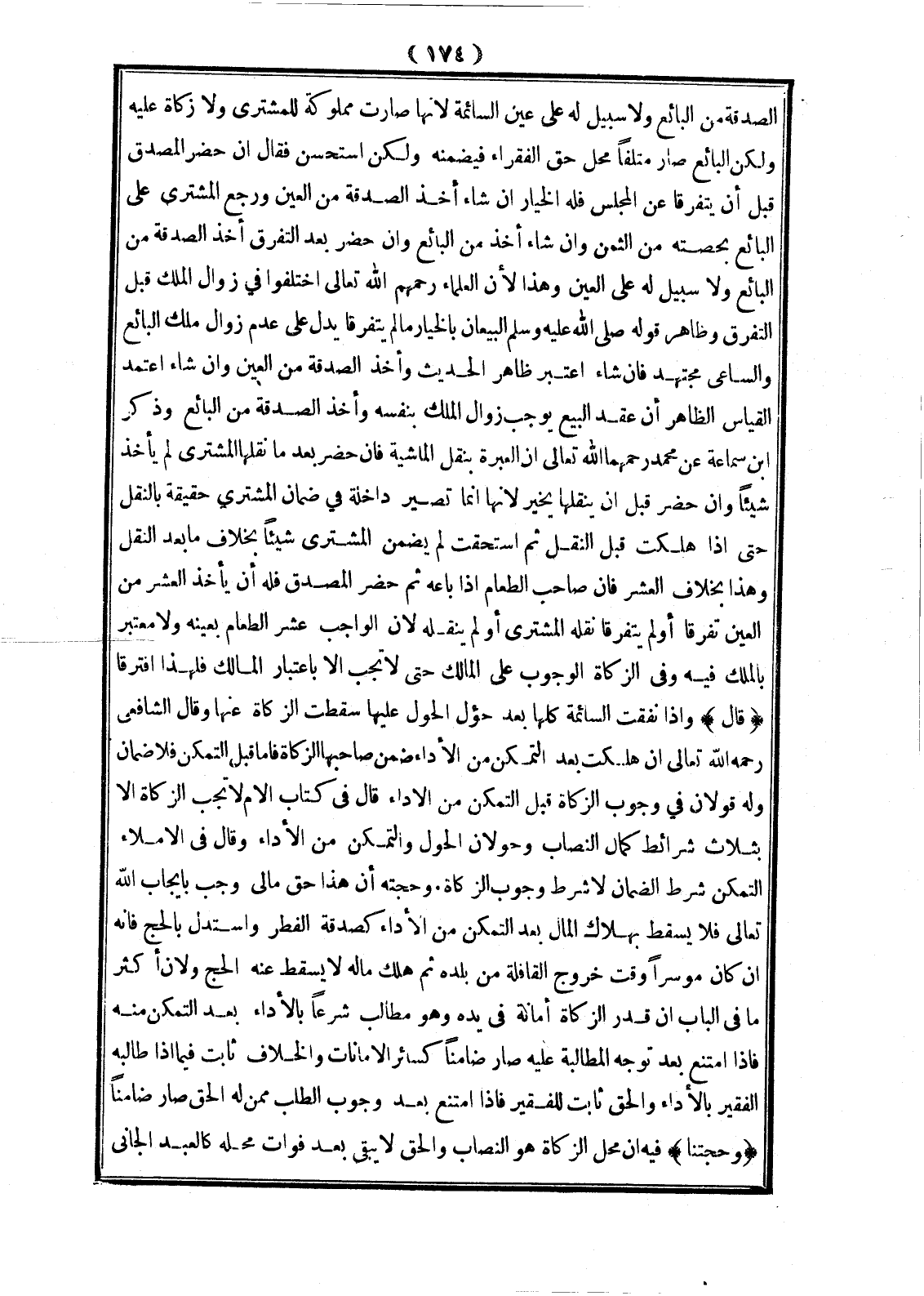 الصَّدَقَةَ مِنْ الْبَائِعِ وَلَا سَبِيلَ لَهُ عَلَى عَيْنِ السَّائِمَةِ؛ لِأَنَّهَا صَارَتْ مَمْلُوكَةً لِلْمُشْتَرِي وَلَا زَكَاةَ عَلَيْهِ وَلَكِنَّ الْبَائِعَ صَارَ مُتْلِفًا مَحَلَّ حَقِّ الْفُقَرَاءِ فَيَضْمَنُهُ وَلَكِنْ اسْتَحْسَنَ فَقَالَ: إنْ حَضَرَ الْمُصَدِّقُ قَبْلَ أَنْ يَتَفَرَّقَا عَنْ الْمَجْلِسِ فَلَهُ الْخِيَارُ إنْ شَاءَ أَخَذَ الصَّدَقَةَ مِنْ الْعَيْنِ وَرَجَعَ الْمُشْتَرِي عَلَى الْبَائِعِ بِحِصَّتِهِ مِنْ الثَّمَنِ، وَإِنْ شَاءَ أَخَذَ مِنْ الْبَائِعِ، وَإِنْ حَضَرَ بَعْدَ التَّفَرُّقِ أَخَذَ الصَّدَقَةَ مِنْ الْبَائِعِ وَلَا سَبِيلَ لَهُ عَلَى الْعَيْنِ، وَهَذَا؛ لِأَنَّ الْعُلَمَاءَ - رَحِمَهُمْ اللَّهُ تَعَالَى - اخْتَلَفُوا فِي زَوَالِ الْمِلْكِ قَبْلَ التَّفَرُّقِ وَظَاهِرُ قَوْلِهِ - صَلَّى اللَّهُ عَلَيْهِ وَسَلَّمَ - «الْبَيِّعَانِ بِالْخِيَارِ مَا لَمْ يَتَفَرَّقَا» يَدُلُّ عَلَى عَدَمِ زَوَالِ مِلْكِ الْبَائِعِ وَالسَّاعِي مُجْتَهِدٌ فَإِنْ شَاءَ اعْتَبَرَ ظَاهِرَ الْحَدِيثِ وَأَخَذَ الصَّدَقَةَ مِنْ الْعَيْنِ، وَإِنْ شَاءَ اعْتَمَدَ الْقِيَاسَ الظَّاهِرَ أَنَّ عَقْدَ الْبَيْعِ يُوجِبُ زَوَالَ الْمِلْكِ بِنَفْسِهِ وَأَخْذَ الصَّدَقَةِ مِنْ الْبَائِعِ، وَذَكَرَ ابْنُ سِمَاعَةَ عَنْ مُحَمَّدٍ - رَحِمَهُمَا اللَّهُ تَعَالَى - أَنَّ الْعِبْرَةَ بِنَقْلِ الْمَاشِيَةِ، فَإِنْ حَضَرَ بَعْدَ مَا نَقَلَهَا الْمُشْتَرِي لَمْ يَأْخُذْ شَيْئًا، وَإِنْ حَضَرَ قَبْلَ أَنْ يَنْقُلَهَا يُخَيَّرْ؛ لِأَنَّهَا إنَّمَا تَصِيرُ دَاخِلَةً فِي ضَمَانِ الْمُشْتَرِي حَقِيقَةً بِالنَّقْلِ حَتَّى إذَا هَلَكَتْ قَبْلَ النَّقْلِ ثُمَّ اُسْتُحِقَّتْ لَمْ يَضْمَنْ الْمُشْتَرِي شَيْئًا بِخِلَافِ مَا بَعْدَ النَّقْلِ، وَهَذَا بِخِلَافِ الْعُشْرِ، فَإِنَّ صَاحِبَ الطَّعَامِ إذَا بَاعَهُ، ثُمَّ حَضَرَ الْمُصَدِّقُ فَلَهُ أَنْ يَأْخُذَ الْعُشْرَ مِنْ الْعَيْنِ تَفَرَّقَا أَوْ لَمْ يَتَفَرَّقَا نَقَلَهُ الْمُشْتَرِي أَوْ لَمْ يَنْقُلْهُ؛ لِأَنَّ الْوَاجِبَ عُشْرُ الطَّعَامِ بِعَيْنِهِ وَلَا مُعْتَبَرَ بِالْمِلْكِ فِيهِ وَفِي الزَّكَاةِ الْوُجُوبُ عَلَى الْمَالِكِ حَتَّى لَا تَجِبَ إلَّا بِاعْتِبَارِ الْمَالِكِ فَلِهَذَا افْتَرَقَا