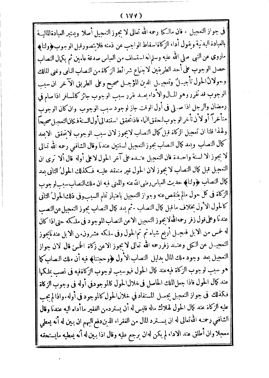 فِي جَوَازِ التَّعْجِيلِ، فَإِنَّ مَالِكًا - رَحِمَهُ اللَّهُ تَعَالَى - لَا يُجَوِّزُ التَّعْجِيلَ أَصْلًا وَيَعْتَبِرُ الْعِبَادَةَ الْمَالِيَّةَ بِالْعِبَادَةِ الْبَدَنِيَّةِ وَيَقُولُ أَدَاءُ الزَّكَاةِ إسْقَاطُ الْوَاجِبِ عَنْ ذِمَّتِهِ فَلَا يُتَصَوَّرُ قَبْلَ الْوُجُوبِ.