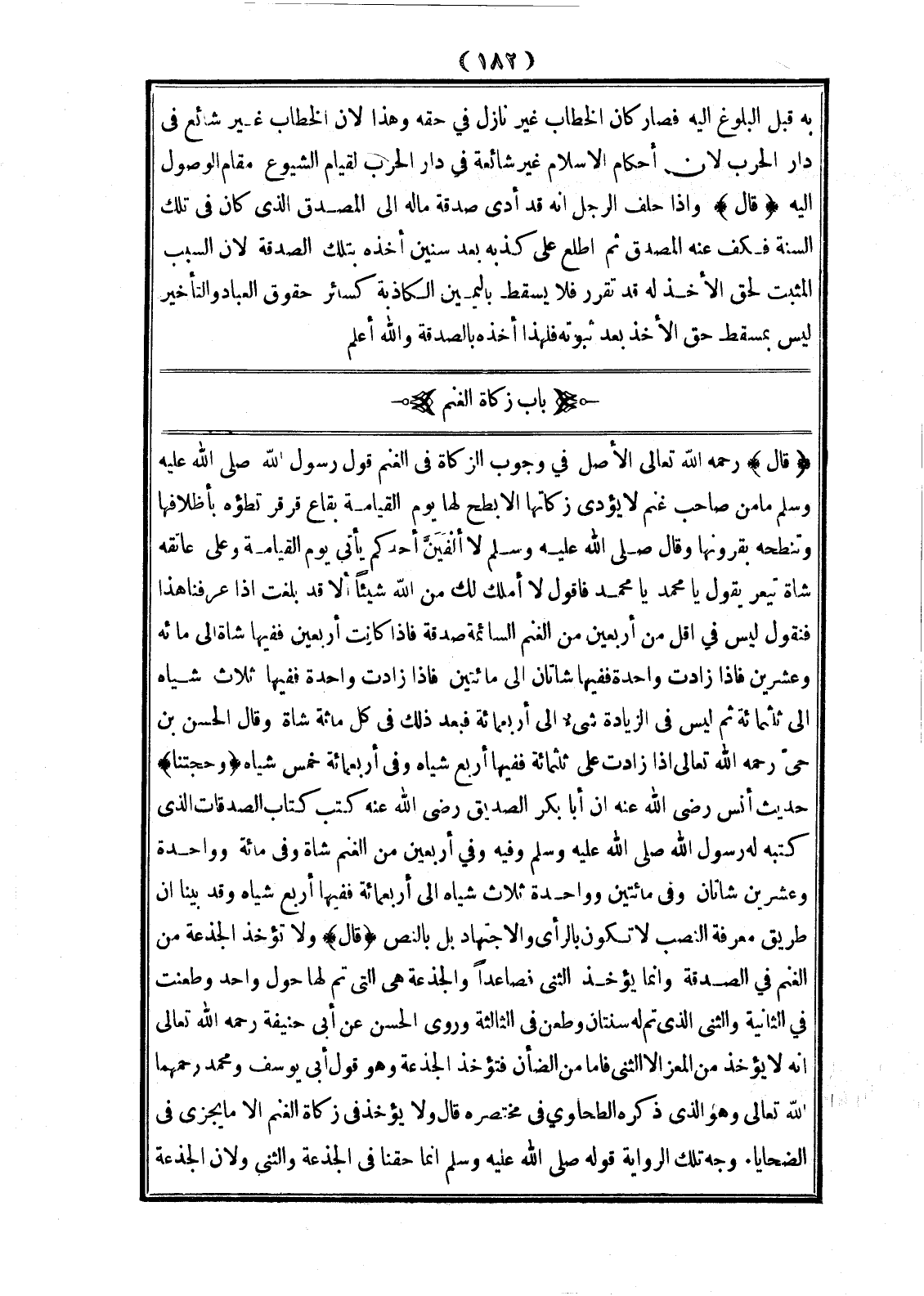 (قَالَ) - رَحِمَهُ اللَّهُ تَعَالَى -: الْأَصْلُ فِي وُجُوبِ الزَّكَاةِ فِي الْغَنَمِ قَوْلُ رَسُولِ اللَّهِ - صَلَّى اللَّهُ عَلَيْهِ وَسَلَّمَ - «مَا مِنْ صَاحِبِ غَنَمٍ لَا يُؤَدِّي زَكَاتَهَا إلَّا بُطِحَ لَهَا يَوْمَ الْقِيَامَةِ بِقَاعٍ قَرْقَرٍ تَطَؤُهُ بِأَظْلَافِهَا وَتَنْطَحُهُ بِقُرُونِهَا»، وَقَالَ - صَلَّى اللَّهُ عَلَيْهِ وَسَلَّمَ - «لَا أُلْفِيَنَّ أَحَدَكُمْ يَأْتِي يَوْمَ الْقِيَامَةِ وَعَلَى عَاتِقِهِ شَاةٌ تَيْعَرُ يَقُولُ يَا مُحَمَّدُ يَا مُحَمَّدُ فَأَقُولُ لَا أَمْلِكُ لَكَ مِنْ اللَّهِ شَيْئًا أَلَا قَدْ بَلَّغْتُ» إذَا عَرَفْنَا هَذَا فَنَقُولُ لَيْسَ فِي أَقَلَّ مِنْ أَرْبَعِينَ مِنْ الْغَنَمِ السَّائِمَةِ صَدَقَةٌ، فَإِذَا كَانَتْ أَرْبَعِينَ فَفِيهَا شَاةٌ إلَى مِائَةٍ وَعِشْرِينَ، فَإِذَا زَادَتْ وَاحِدَةً فَفِيهَا شَاتَانِ إلَى مِائَتَيْنِ، فَإِذَا زَادَتْ وَاحِدَةً فَفِيهَا ثَلَاثُ شِيَاهٍ إلَى ثَلَاثِمِائَةٍ، ثُمَّ لَيْسَ فِي الزِّيَادَةِ شَيْءٌ إلَى أَرْبَعِمِائَةٍ فَبَعْدَ ذَلِكَ فِي كُلِّ مِائَةٍ شَاةٌ، وَقَالَ الْحَسَنُ بْنُ حَيٍّ - رَحِمَهُ اللَّهُ تَعَالَى - إذَا زَادَتْ عَلَى ثَلَاثِمِائَةٍ فَفِيهَا أَرْبَعُ شِيَاهٍ، وَفِي أَرْبَعِمِائَةٍ خَمْسُ شِيَاهٍ. (وَحُجَّتُنَا) حَدِيثُ أَنَسٍ - رَضِيَ اللَّهُ عَنْهُ - «أَنَّ أَبَا بَكْرٍ الصِّدِّيقَ - رَضِيَ اللَّهُ عَنْهُ - كَتَبَ كِتَابَ الصَّدَقَاتِ الَّذِي كَتَبَهُ لَهُ رَسُولُ اللَّهِ - صَلَّى اللَّهُ عَلَيْهِ وَسَلَّمَ - وَفِيهِ وَفِي أَرْبَعِينَ مِنْ الْغَنَمِ شَاةٌ وَفِي مِائَةٍ وَوَاحِدَةٍ وَعِشْرِينَ شَاتَانِ، وَفِي مِائَتَيْنِ وَوَاحِدَةٍ ثَلَاثُ شِيَاهٍ إلَى أَرْبَعِمِائَةٍ فَفِيهَا أَرْبَعُ شِيَاهٍ»، وَقَدْ بَيَّنَّا أَنَّ طَرِيقَ مَعْرِفَةِ النُّصُبِ لَا تَكُونُ بِالرَّأْيِ وَالِاجْتِهَادِ بَلْ بِالنَّصِّ