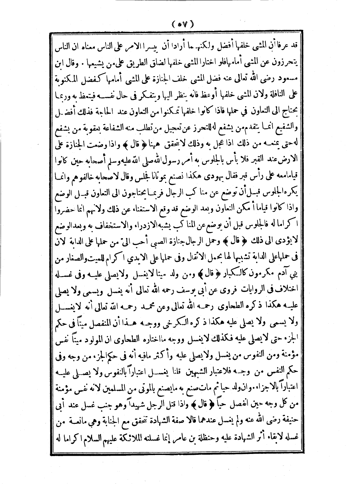 (قَالَ): وَمَنْ وُلِدَ مَيِّتًا لَا يُغَسَّلُ وَلَا يُصَلَّى عَلَيْهِ وَفِي غُسْلِهِ اخْتِلَافٌ فِي الرِّوَايَاتِ فَرُوِيَ عَنْ أَبِي يُوسُفَ - رَحِمَهُ اللَّهُ تَعَالَى - أَنَّهُ يُغَسَّلُ وَيُسَمَّى وَلَا يُصَلَّى عَلَيْهِ هَكَذَا ذَكَرَهُ الطَّحَاوِيُّ - رَحِمَهُ اللَّهُ تَعَالَى - وَعَنْ مُحَمَّدٍ - رَحِمَهُ اللَّهُ تَعَالَى - أَنَّهُ لَا يُغَسَّلُ وَلَا يُسَمَّى وَلَا يُصَلَّى عَلَيْهِ هَكَذَا ذَكَرَهُ الْكَرْخِيُّ وَوَجْهُ هَذَا أَنَّ الْمُنْفَصِلَ مَيِّتًا فِي حُكْمِ الْجُزْءِ حَتَّى لَا يُصَلَّى عَلَيْهِ فَكَذَلِكَ لَا يُغَسَّلُ وَوَجْهُ مَا اخْتَارَهُ الطَّحَاوِيُّ أَنَّ الْمَوْلُودَ مَيِّتًا نَفْسٌ مُؤْمِنَةٌ وَمِنْ النُّفُوسِ مَنْ يُغَسَّلُ وَلَا يُصَلِّي عَلَيْهِ وَأَكْثَرُ مَا فِيهِ أَنَّهُ فِي حُكْمِ الْجُزْءِ مِنْ وَجْهٍ وَفِي حُكْمِ النَّفْسِ مِنْ وَجْهٍ فَلِاعْتِبَارِ الشَّبَهَيْنِ قُلْنَا يُغَسَّلُ اعْتِبَارًا بِالنُّفُوسِ وَلَا يُصَلَّى عَلَيْهِ اعْتِبَارًا بِالْأَجْزَاءِ. وَإِنْ وُلِدَ حَيًّا ثُمَّ مَاتَ صُنِعَ بِهِ مَا يُصْنَعُ بِالْمَوْتَى مِنْ الْمُسْلِمِينَ لِأَنَّهُ نَفْسٌ مُؤْمِنَةٌ مِنْ كُلِّ وَجْهٍ حِينَ انْفَصَلَ حَيًّا