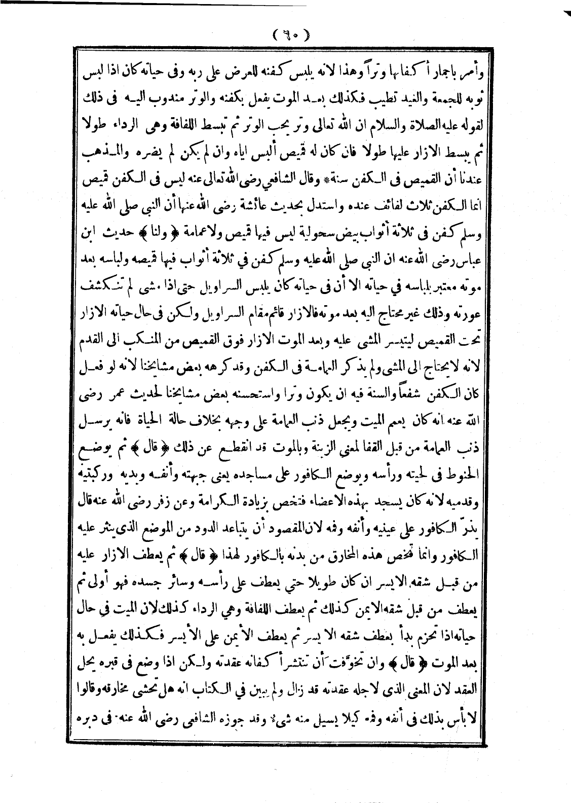 (وَلَنَا) حَدِيثُ ابْنِ عَبَّاسٍ - رَضِيَ اللَّهُ عَنْهُ - «أَنَّ النَّبِيَّ - صَلَّى اللَّهُ عَلَيْهِ وَسَلَّمَ - كُفِّنَ فِي ثَلَاثَةِ أَثْوَابٍ فِيهَا قَمِيصُهُ» وَلِبَاسُهُ بَعْدَ مَوْتِهِ مُعْتَبَرٌ بِلِبَاسِهِ فِي حَيَاتِهِ إلَّا أَنَّ فِي حَيَاتِهِ كَانَ يَلْبَسُ السَّرَاوِيلَ حَتَّى إذَا مَشَى لَمْ تَنْكَشِفْ عَوْرَتَهُ وَذَلِكَ غَيْرُ مُحْتَاجٍ إلَيْهِ بَعْدَ مَوْتِهِ فَالْإِزَارُ قَائِمٌ مَقَامَ السَّرَاوِيلِ وَلَكِنْ فِي حَالِ حَيَاتِهِ الْإِزَارُ تَحْتَ الْقَمِيصِ لِيَتَيَسَّرَ الْمَشْيُ عَلَيْهِ وَبَعْدَ الْمَوْتِ الْإِزَارُ فَوْقَ الْقَمِيصِ مِنْ الْمَنْكِبِ إلَى الْقَدَمِ لِأَنَّهُ لَا يَحْتَاجُ إلَى الْمَشْيِ وَلَمْ يَذْكُرْ الْعِمَامَةَ فِي الْكَفَنِ وَقَدْ كَرِهَهُ بَعْضُ مَشَايِخِنَا لِأَنَّهُ لَوْ فَعَلَ كَانَ الْكَفَنُ شَفْعًا وَالسُّنَّةُ فِيهِ أَنْ يَكُونَ وِتْرًا وَاسْتَحْسَنَهُ بَعْضُ مَشَايِخِنَا لِحَدِيثِ عُمَرَ - رَضِيَ اللَّهُ عَنْهُ - إنَّهُ كَانَ يُعَمِّمُ الْمَيِّتَ وَيَجْعَلُ ذَنَبَ الْعِمَامَةِ عَلَى وَجْهِهِ بِخِلَافِ حَالَةِ الْحَيَاةِ فَإِنَّهُ يُرْسِلُ ذَنَبَ الْعِمَامَةِ مِنْ قِبَلِ الْقَفَا لِمَعْنَى الزِّينَةِ وَبِالْمَوْتِ قَدْ انْقَطَعَ عَنْ ذَلِكَ