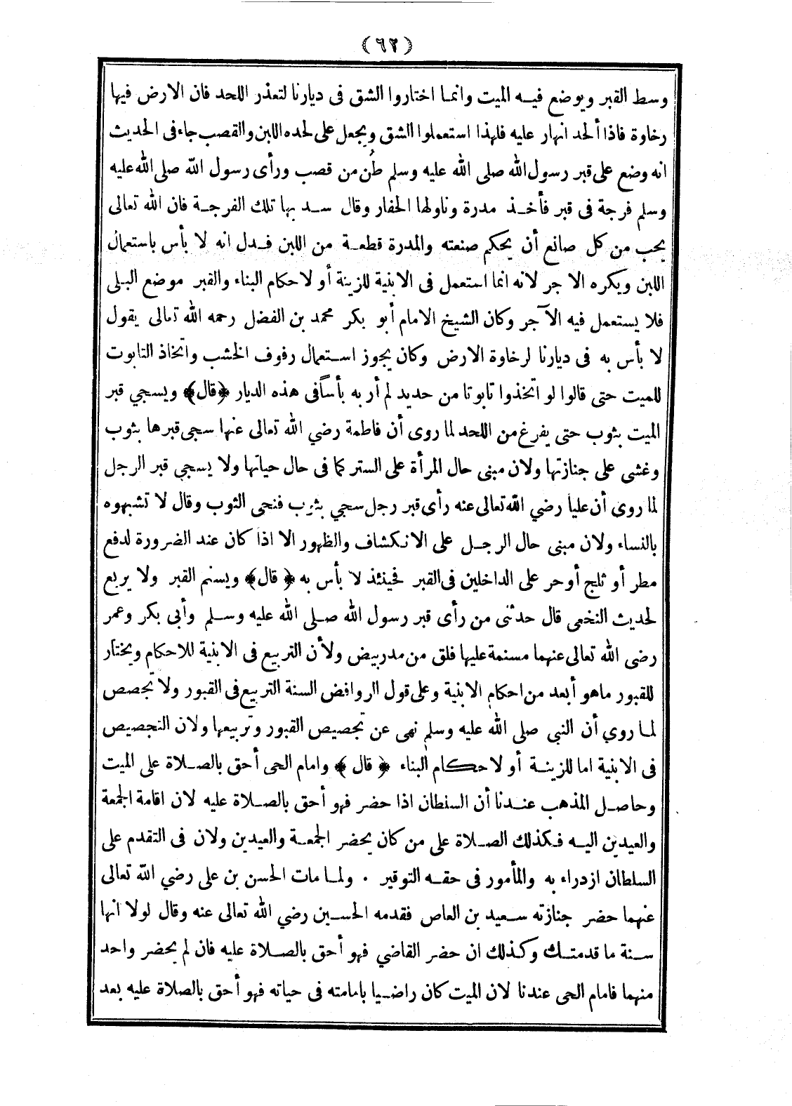 (قَالَ) وَيُسَنَّمُ الْقَبْرُ وَلَا يُرَبَّعُ لِحَدِيثِ «النَّخَعِيِّ قَالَ: حَدَّثَنِي مِنْ رَأَى قَبْرَ رَسُولِ اللَّهِ - صَلَّى اللَّهُ عَلَيْهِ وَسَلَّمَ - وَأَبِي بَكْرٍ وَعُمَرَ - رَضِيَ اللَّهُ تَعَالَى عَنْهُمَا - مُسَنَّمَةٌ عَلَيْهَا فَلْقٌ مِنْ مَدَرٍ بِيضٍ» وَلِأَنَّ التَّرْبِيعَ فِي الْأَبْنِيَةِ لِلْإِحْكَامِ وَيُخْتَارُ لِلْقُبُورِ مَا هُوَ أَبْعَدُ مِنْ إحْكَامِ الْأَبْنِيَةِ وَعَلَى قَوْلِ الرَّوَافِضِ السُّنَّةُ التَّرْبِيعُ فِي الْقُبُورِ وَلَا تُجَصَّصُ لِمَا رُوِيَ «أَنَّ النَّبِيَّ - صَلَّى اللَّهُ عَلَيْهِ وَسَلَّمَ - نَهَى عَنْ تَجْصِيصِ الْقُبُورِ وَتَرْبِيعِهَا» وَلِأَنَّ التَّجْصِيصَ فِي الْأَبْنِيَةِ إمَّا لِلزِّينَةِ أَوْ لِإِحْكَامِ الْبِنَاءِ