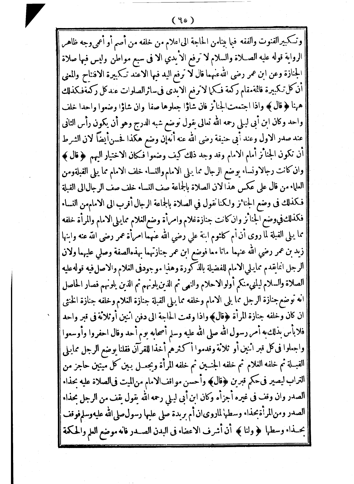 وَتَكْبِيرُ الْقُنُوتِ وَالْفِقْهُ فِيمَا بَيَّنَّا مِنْ الْحَاجَةِ إلَى إعْلَامِ مَنْ خَلْفَهُ مِنْ أَصَمَّ أَوْ أَعْمًى وَجْهُ ظَاهِرِ الرِّوَايَةِ قَوْلُهُ - عَلَيْهِ الصَّلَاةُ وَالسَّلَامُ -: «لَا تُرْفَعُ الْأَيْدِي إلَّا فِي سَبْعِ مَوَاطِنَ» وَلَيْسَ فِيهَا صَلَاةُ الْجِنَازَةِ وَعَنْ ابْنِ عُمَرَ - رَضِيَ اللَّهُ عَنْهُمَا - قَالَ: لَا تُرْفَعُ الْيَدُ فِيهَا إلَّا عِنْدَ تَكْبِيرَةِ الِافْتِتَاحِ وَالْمَعْنَى أَنَّ كُلَّ تَكْبِيرَةٍ قَائِمَةٌ مَقَامَ رَكْعَةٍ فَكَمَا لَا تُرْفَعُ الْأَيْدِي فِي سَائِرِ الصَّلَوَاتِ عِنْدَ كُلِّ رَكْعَةٍ فَكَذَلِكَ هَهُنَا
