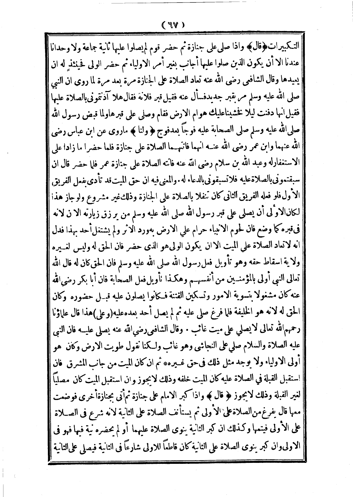 (وَلَنَا) مَا رُوِيَ عَنْ ابْنِ عَبَّاسٍ - رَضِيَ اللَّهُ عَنْهُمَا - وَابْنِ عُمَرَ - رَضِيَ اللَّهُ عَنْهُ - أَنَّهُمَا فَاتَتْهُمَا الصَّلَاةُ عَلَى جِنَازَةٍ فَلَمَّا حَضَرَا مَا زَادَا عَلَى الِاسْتِغْفَارِ لَهُ وَعَبْدُ اللَّهِ بْنُ سَلَامٍ - رَضِيَ اللَّهُ عَنْهُ - فَاتَتْهُ الصَّلَاةُ عَلَى جِنَازَةِ عُمَرَ فَلَمَّا حَضَرَ قَالَ: إنْ سَبَقْتُمُونِي بِالصَّلَاةِ عَلَيْهِ فَلَا تَسْبِقُونِي بِالدُّعَاءِ لَهُ. وَالْمَعْنَى فِيهِ أَنَّ حَقَّ الْمَيِّتِ قَدْ تَأَدَّى بِفِعْلِ الْفَرِيقِ الْأَوَّلِ فَلَوْ فَعَلَهُ الْفَرِيقُ الثَّانِي كَانَ تَنَفُّلًا بِالصَّلَاةِ عَلَى الْجِنَازَةِ وَذَلِكَ غَيْرُ مَشْرُوعٍ وَلَوْ جَازَ هَذَا لَكَانَ الْأَوْلَى أَنْ يُصَلِّيَ عَلَى قَبْرِ رَسُولِ اللَّهِ - صَلَّى اللَّهُ عَلَيْهِ وَسَلَّمَ - مَنْ يُرْزَقُ زِيَارَتُهُ الْآنَ لِأَنَّهُ فِي قَبْرِهِ كَمَا وُضِعَ فَإِنَّ لُحُومَ الْأَنْبِيَاءِ حَرَامٌ عَلَى الْأَرْضِ بِهِ وَرَدَ الْأَثَرُ وَلَمْ يَشْتَغِلْ أَحَدٌ بِهَذَا فَدَلَّ أَنَّهُ لَا تُعَادُ الصَّلَاةُ عَلَى الْمَيِّتِ إلَّا أَنْ يَكُونَ الْوَلِيُّ هُوَ الَّذِي حَضَرَ فَإِنَّ الْحَقَّ لَهُ وَلَيْسَ لِغَيْرِهِ وِلَايَةُ إسْقَاطِ حَقِّهِ وَهُوَ تَأْوِيلُ فِعْلِ رَسُولِ اللَّهِ - صَلَّى اللَّهُ عَلَيْهِ وَسَلَّمَ - فَإِنَّ الْحَقَّ كَانَ لَهُ قَالَ اللَّهُ تَعَالَى {النَّبِيُّ أَوْلَى بِالْمُؤْمِنِينَ مِنْ أَنْفُسِهِمْ} [الأحزاب: 6] وَهَكَذَا تَأْوِيلُ فِعْلِ الصَّحَابَةِ فَإِنَّ أَبَا بَكْرٍ - رَضِيَ اللَّهُ عَنْهُ - كَانَ مَشْغُولًا بِتَسْوِيَةِ الْأُمُورِ وَتَسْكِينِ الْفِتْنَةِ فَكَانُوا يُصَلُّونَ عَلَيْهِ قَبْلَ حُضُورِهِ وَكَانَ الْحَقُّ لَهُ لِأَنَّهُ هُوَ الْخَلِيفَةُ فَلَمَّا فَرَغَ صَلَّى عَلَيْهِ ثُمَّ لَمْ يُصَلِّ أَحَدٌ بَعْدَهُ عَلَيْهِ (وَعَلَى) هَذَا قَالَ عُلَمَاؤُنَا رَحِمَهُمْ اللَّهُ تَعَالَى لَا يُصَلَّى عَلَى مَيِّتٍ غَائِبٍ. وَقَالَ الشَّافِعِيُّ - رَضِيَ اللَّهُ عَنْهُ -: يُصَلَّى عَلَيْهِ فَإِنَّ «النَّبِيَّ - عَلَيْهِ الصَّلَاةُ وَالسَّلَامُ - صَلَّى عَلَى النَّجَاشِيِّ وَهُوَ غَائِبٌ» وَلَكِنَّا نَقُولُ: طُوِيَتْ الْأَرْضُ وَكَانَ هُوَ أَوْلَى الْأَوْلِيَاءِ وَلَا يُوجَدُ مِثْلُ ذَلِكَ فِي حَقِّ غَيْرِهِ ثُمَّ إنْ كَانَ الْمَيِّتُ مِنْ جَانِبِ الْمَشْرِقِ فَإِنْ اسْتَقْبَلَ الْقِبْلَةَ فِي الصَّلَاةِ عَلَيْهِ كَانَ الْمَيِّتُ خَلْفَهُ وَذَلِكَ لَا يَجُوزُ وَإِنْ اسْتَقْبَلَ الْمَيِّتَ كَانَ مُصَلِّيًا لِغَيْرِ الْقِبْلَةِ وَذَلِكَ لَا يَجُوزُ