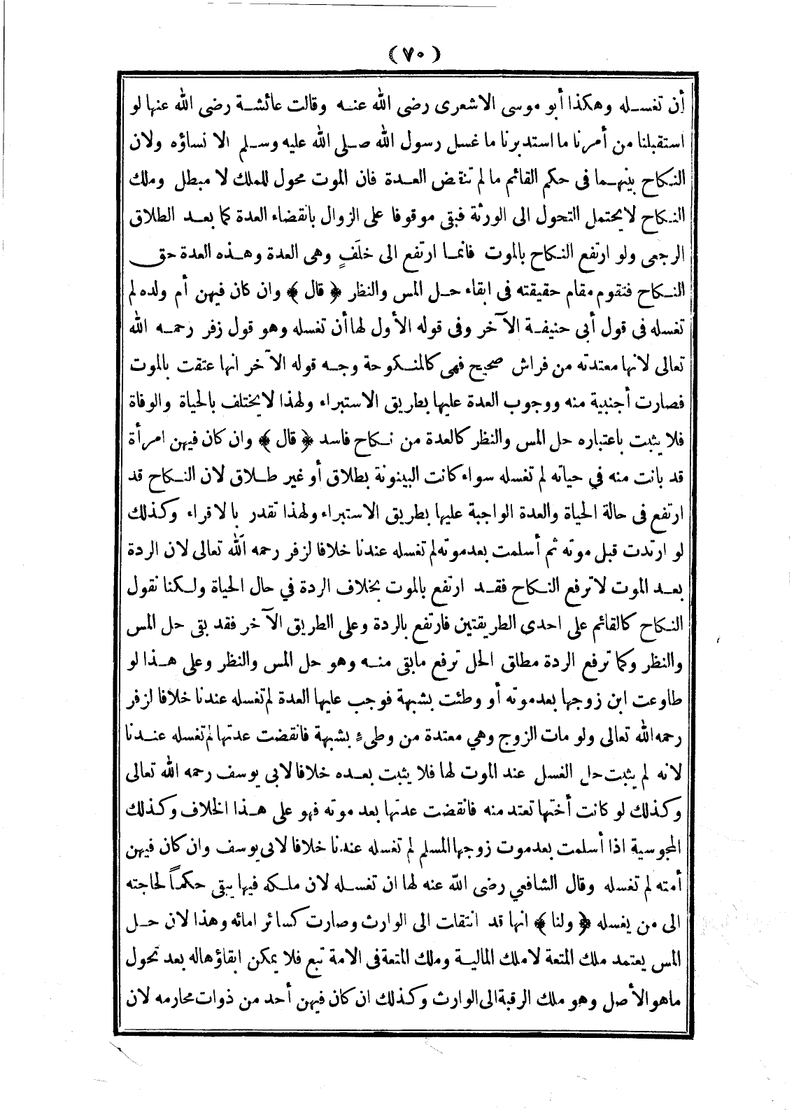 أَنْ تُغَسِّلَهُ وَهَكَذَا أَبُو مُوسَى الْأَشْعَرِيُّ - رَضِيَ اللَّهُ عَنْهُ - وَقَالَتْ عَائِشَةُ - رَضِيَ اللَّهُ عَنْهَا -: لَوْ اسْتَقْبَلْنَا مِنْ أَمْرِنَا مَا اسْتَدْبَرْنَا مَا غَسَّلَ رَسُولُ اللَّهِ - صَلَّى اللَّهُ عَلَيْهِ وَسَلَّمَ - إلَّا نِسَاءَهُ وَلِأَنَّ النِّكَاحَ بَيْنَهُمَا فِي حُكْمِ الْقَائِمِ مَا لَمْ تَنْقَضِ الْعِدَّةُ فَإِنَّ الْمَوْتَ مُحَوِّلٌ لِلْمِلْكِ لَا مُبْطِلٌ وَمِلْكُ النِّكَاحِ لَا يَحْتَمِلُ التَّحَوُّلَ إلَى الْوَرَثَةِ فَبَقِيَ مَوْقُوفًا عَلَى الزَّوَالِ بِانْقِضَاءِ الْعِدَّةِ كَمَا بَعْدَ الطَّلَاقِ الرَّجْعِيِّ وَلَوْ ارْتَفَعَ النِّكَاحُ بِالْمَوْتِ فَإِنَّمَا ارْتَفَعَ إلَى خَلْفٍ وَهِيَ الْعِدَّةُ وَهَذِهِ الْعِدَّةُ حَقُّ النِّكَاحِ فَتَقُومُ مَقَامَ حَقِيقَتِهِ فِي إبْقَاءِ حِلِّ الْمَسِّ وَالنَّظَرِ قَالَ: وَإِنْ كَانَ فِيهِنَّ أُمُّ وَلَدِهِ لَمْ تُغَسِّلْهُ فِي قَوْلِ أَبِي حَنِيفَةَ الْآخِرِ وَفِي قَوْلِهِ الْأَوَّلِ لَهَا أَنْ تُغَسِّلَهُ وَهُوَ قَوْلُ زُفَرَ - رَحِمَهُ اللَّهُ تَعَالَى - لِأَنَّهَا مُعْتَدَّتُهُ مِنْ فِرَاشٍ صَحِيحٍ فَهِيَ كَالْمَنْكُوحَةِ، وَجْهُ قَوْلِهِ الْآخِرِ إنَّهَا عَتَقَتْ بِالْمَوْتِ فَصَارَتْ أَجْنَبِيَّةً مِنْهُ وَوُجُوبُ الْعِدَّةِ عَلَيْهَا بِطَرِيقِ الِاسْتِبْرَاءِ وَلِهَذَا لَا يَخْتَلِفُ بِالْحَيَاةِ وَالْوَفَاةِ فَلَا يَثْبُتُ بِاعْتِبَارِهِ حِلُّ الْمَسِّ وَالنَّظَرِ كَالْعِدَّةِ مِنْ نِكَاحٍ فَاسِدٍ.