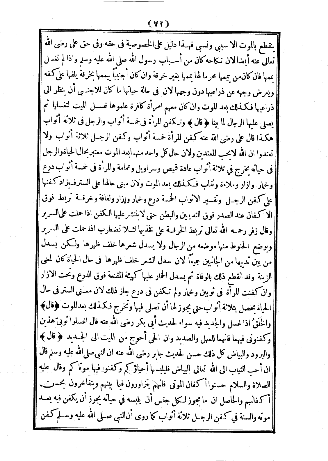 (قَالَ): وَتُكَفَّنُ الْمَرْأَةُ فِي خَمْسَةِ أَثْوَابٍ وَالرَّجُلُ فِي ثَلَاثَةِ أَثْوَابٍ هَكَذَا قَالَ عَلِيٌّ - رَضِيَ اللَّهُ عَنْهُ -: كَفَنُ الْمَرْأَةِ خَمْسَةُ أَثْوَابٍ وَكَفَنُ الرَّجُلِ ثَلَاثَةُ أَثْوَابٍ وَلَا تَعْتَدُوا إنَّ اللَّهَ لَا يُحِبُّ الْمُعْتَدِينَ وَلِأَنَّ حَالَ كُلِّ وَاحِدٍ مِنْهُمَا بَعْدَ الْمَوْتِ مُعْتَبَرٌ بِحَالِ الْحَيَاةِ وَالرَّجُلُ فِي حَيَاتِهِ يَخْرُجُ فِي ثَلَاثَةِ أَثْوَابٍ عَادَةً قَمِيصٍ وَسَرَاوِيلَ وَعِمَامَةٍ وَالْمَرْأَةُ فِي خَمْسَةِ أَثْوَابٍ دِرْعٍ وَخِمَارٍ وَإِزَارٍ وَمِلَاءَةٍ وَنِقَابٍ فَكَذَلِكَ بَعْدَ الْمَوْتِ وَلِأَنَّ مَبْنَى حَالِهَا عَلَى السَّتْرِ فَيُزَادُ كَفَنُهَا عَلَى كَفَنِ الرَّجُلِ وَتَفْسِيرُ الْأَثْوَابِ الْخَمْسَةِ دِرْعٌ وَخِمَارٌ وَإِزَارٌ وَلِفَافَةٌ وَخِرْقَةٌ تُرْبَطُ فَوْقَ الْأَكْفَانِ عِنْدَ الصَّدْرِ فَوْقَ الثَّدْيَيْنِ وَالْبَطْنِ حَتَّى لَا يَنْتَشِرَ عَلَيْهَا الْكَفَنُ إذَا حُمِلَتْ عَلَى السَّرِيرِ وَقَالَ زُفَرُ - رَحِمَهُ اللَّهُ تَعَالَى -: تُرْبَطُ الْخِرْقَةُ عَلَى فَخِذَيْهَا لِئَلَّا تَضْطَرِبَ إذَا حُمِلَتْ عَلَى السَّرِيرِ وَيُوضَعُ الْحَنُوطُ مِنْهَا مَوْضِعَهُ مِنْ الرِّجَالِ وَلَا يُسْدَلُ شَعْرُهَا خَلْفَ ظَهْرِهَا وَلَكِنْ يُسْدَلُ مِنْ بَيْنِ ثَدْيَيْهَا مِنْ الْجَانِبَيْنِ جَمِيعًا لِأَنَّ سَدْلَ الشَّعْرِ خَلْفَ ظَهْرِهَا فِي حَالِ الْحَيَاةِ كَانَ لِمَعْنَى الزِّينَةِ وَقَدْ انْقَطَعَ ذَلِكَ بِالْوَفَاةِ ثُمَّ يُسْدَلُ الْخِمَارُ عَلَيْهَا كَهَيْئَةِ الْمُقَنَّعَةِ فَوْقَ الدِّرْعِ وَتَحْتَ الْإِزَارِ وَإِنْ كُفِّنَتْ الْمَرْأَةُ فِي ثَوْبَيْنِ وَخِمَارٍ وَلَمْ تُكَفَّنْ فِي دِرْعٍ جَازَ ذَلِكَ لِأَنَّ مَعْنَى السِّتْرِ فِي حَالِ الْحَيَاةِ يَحْصُلُ بِثَلَاثَةِ أَثْوَابٍ حَتَّى يَجُوزَ لَهَا أَنْ تُصَلِّيَ فِيهَا وَتَخْرُجَ فَكَذَلِكَ بَعْدَ الْمَوْتِ