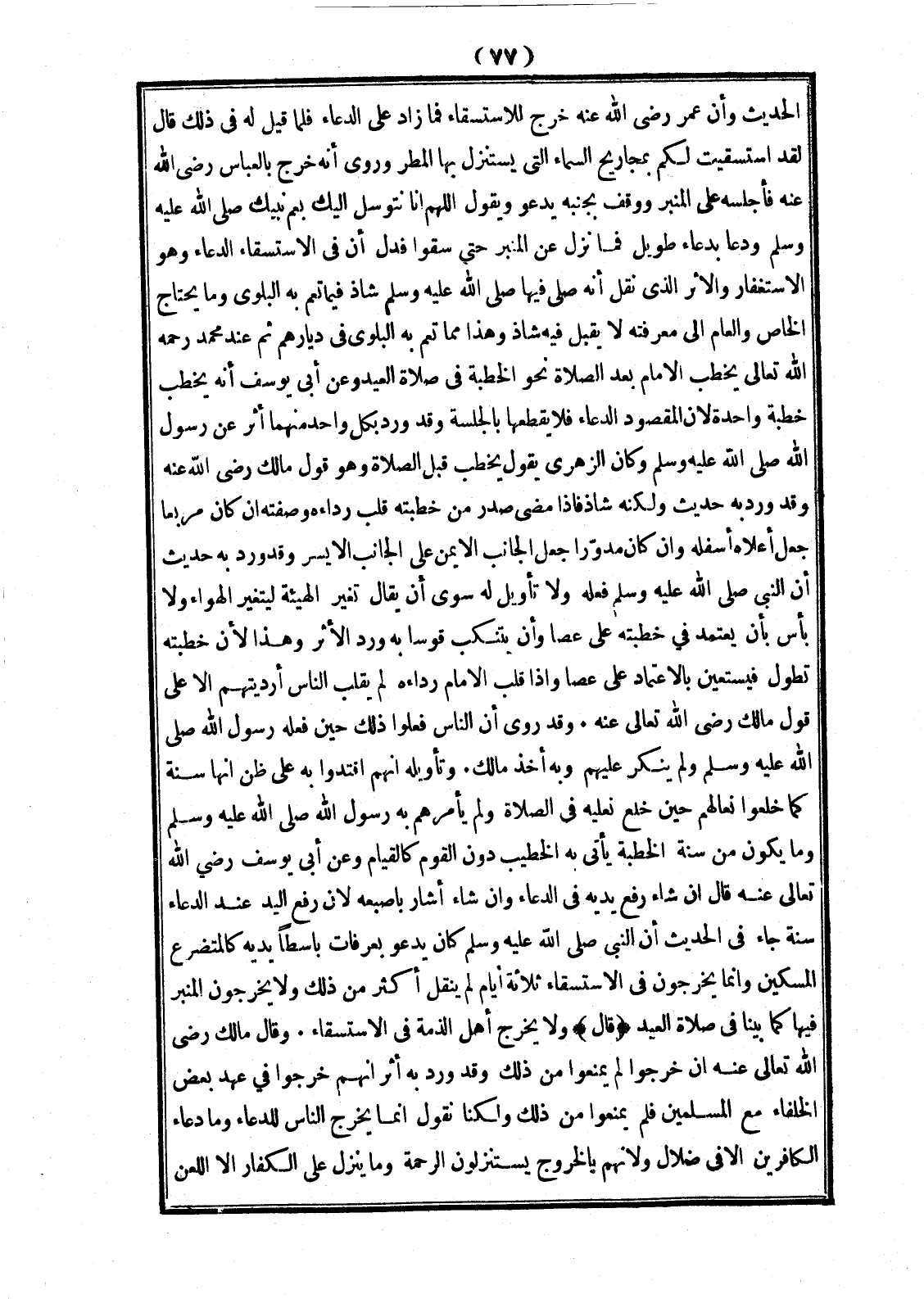 الْحَدِيثُ وَأَنَّ عُمَرَ - رَضِيَ اللَّهُ عَنْهُ - خَرَجَ لِلِاسْتِسْقَاءِ فَمَا زَادَ عَلَى الدُّعَاءِ فَلَمَّا قِيلَ لَهُ فِي ذَلِكَ قَالَ: لَقَدْ اسْتَسْقَيْت لَكُمْ بِمَجَادِيحِ السَّمَاءِ الَّتِي يَسْتَنْزِلُ بِهَا الْمَطَرُ وَرُوِيَ أَنَّهُ خَرَجَ بِالْعَبَّاسِ - رَضِيَ اللَّهُ عَنْهُ - فَأَجْلَسَهُ عَلَى الْمِنْبَرِ وَوَقَفَ بِجَنْبِهِ يَدْعُو وَيَقُولُ: اللَّهُمَّ إنَّا نَتَوَسَّلُ إلَيْك بِعَمِّ نَبِيِّك - صَلَّى اللَّهُ عَلَيْهِ وَسَلَّمَ - وَدَعَا بِدُعَاءٍ طَوِيلٍ فَمَا نَزَلَ عَنْ الْمِنْبَرِ حَتَّى سَقَوْا فَدَلَّ أَنَّ فِي الِاسْتِسْقَاءِ الدُّعَاءَ وَهُوَ الِاسْتِغْفَارُ وَالْأَثَرُ الَّذِي نُقِلَ أَنَّهُ صَلَّى فِيهَا - صَلَّى اللَّهُ عَلَيْهِ وَسَلَّمَ - شَاذٌّ فِيمَا تَعُمُّ بِهِ الْبَلْوَى وَمَا يَحْتَاجُ الْخَاصُّ وَالْعَامُّ إلَى مَعْرِفَتِهِ لَا يُقْبَلُ فِيهِ شَاذٌّ وَهَذَا مِمَّا تَعُمُّ بِهِ الْبَلْوَى فِي دِيَارِهِمْ ثُمَّ عِنْدَ مُحَمَّدٍ - رَحِمَهُ اللَّهُ تَعَالَى - يَخْطُبُ الْإِمَامُ بَعْدَ الصَّلَاةِ نَحْوَ الْخُطْبَةِ فِي صَلَاةِ الْعِيدِ.