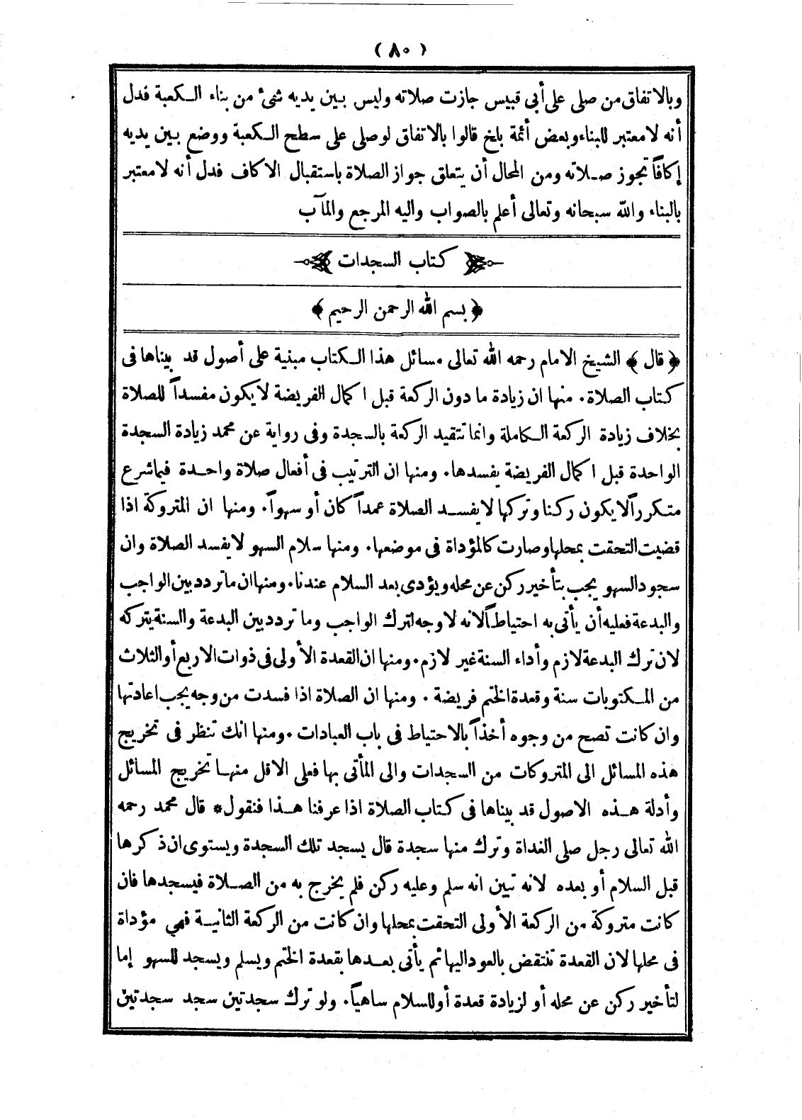 (بِسْمِ اللَّهِ الرَّحْمَنِ الرَّحِيمِ) (قَالَ) الشَّيْخُ الْإِمَامُ - رَحِمَهُ اللَّهُ تَعَالَى -: مَسَائِلُ هَذَا الْكِتَابِ مَبْنِيَّةٌ عَلَى أُصُولٍ قَدْ بَيَّنَّاهَا فِي كِتَابِ الصَّلَاةِ مِنْهَا أَنَّ زِيَادَةَ مَا دُونَ الرَّكْعَةِ قَبْلَ إكْمَالِ الْفَرِيضَةِ لَا يَكُونُ مُفْسِدًا لِلصَّلَاةِ بِخِلَافِ زِيَادَةِ الرَّكْعَةِ الْكَامِلَةِ، وَإِنَّمَا تَتَقَيَّدُ الرَّكْعَةُ بِالسَّجْدَةِ وَفِي رِوَايَةٍ عَنْ مُحَمَّدٍ زِيَادَةُ السَّجْدَةِ الْوَاحِدَةِ قَبْلَ إكْمَالِ الْفَرِيضَةِ يُفْسِدُهَا