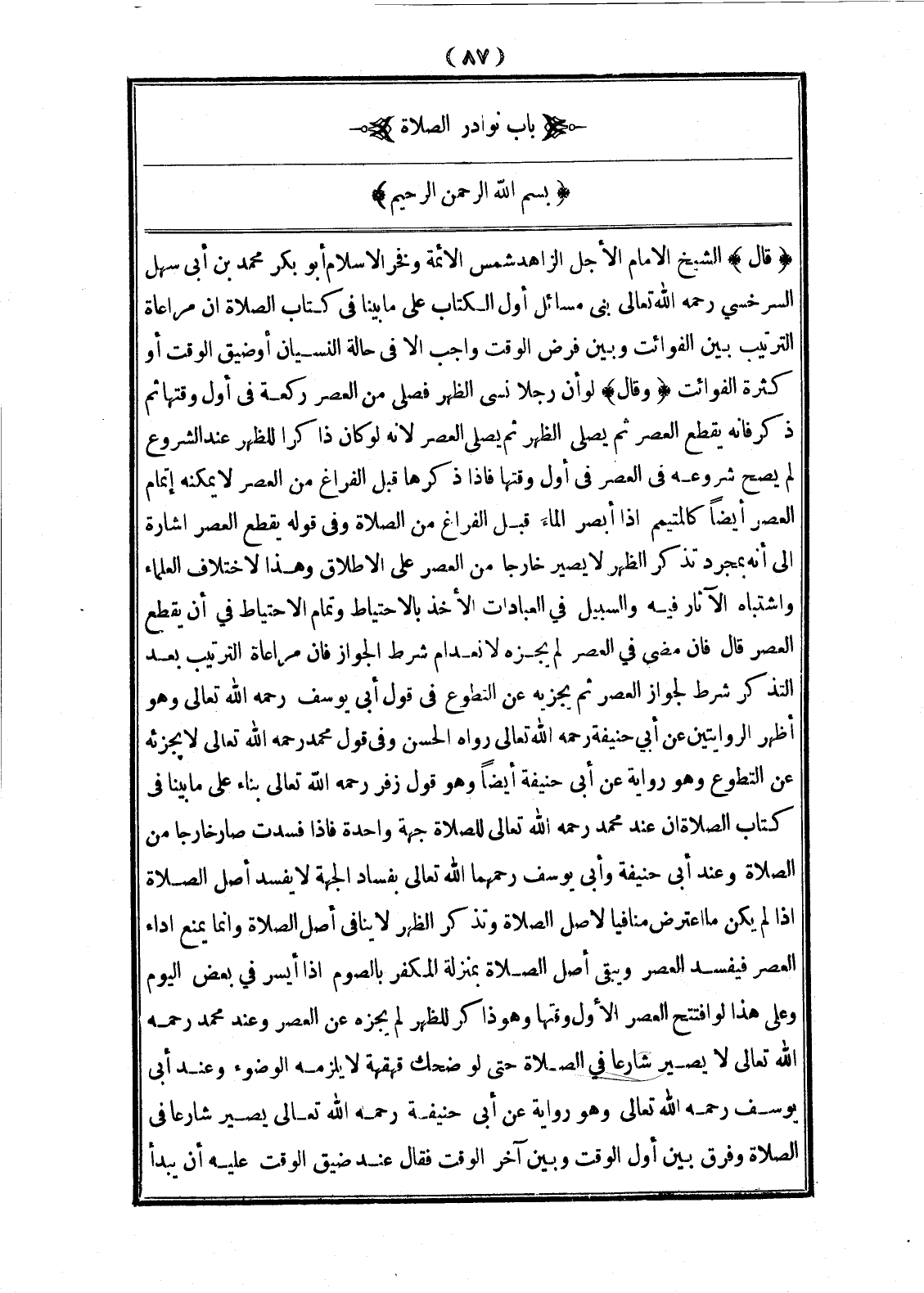 بِسْمِ اللَّهِ الرَّحْمَنِ الرَّحِيمِ) (قَالَ) الشَّيْخُ الْإِمَامُ الْأَجَلُّ الزَّاهِدُ شَمْسُ الْأَئِمَّةِ وَفَخْرُ الْإِسْلَامِ أَبُو بَكْرٍ مُحَمَّدُ بْنُ أَبِي سَهْلٍ السَّرَخْسِيُّ - رَحِمَهُ اللَّهُ تَعَالَى -: بُنِيَ مَسَائِلُ أَوَّلِ الْكِتَابِ عَلَى مَا بَيَّنَّا فِي كِتَابِ الصَّلَاةِ أَنَّ مُرَاعَاةَ التَّرْتِيبِ بَيْنَ الْفَوَائِتِ وَبَيْنَ فَرْضِ الْوَقْتِ وَاجِبٌ إلَّا فِي حَالَةِ النِّسْيَانِ أَوْ ضِيقِ الْوَقْتِ أَوْ كَثْرَةِ الْفَوَائِتِ (وَقَالَ): لَوْ أَنَّ رَجُلًا نَسِيَ الظُّهْرَ فَصَلَّى مِنْ الْعَصْرِ رَكْعَةً فِي أَوَّلِ وَقْتِهَا ثُمَّ ذَكَرَ فَإِنَّهُ يَقْطَعُ الْعَصْرَ ثُمَّ يُصَلِّي الظُّهْرَ ثُمَّ يُصَلِّي الْعَصْرَ؛ لِأَنَّهُ لَوْ كَانَ ذَاكِرًا لِلظُّهْرِ عِنْدَ الشُّرُوعِ لَمْ يَصِحَّ شُرُوعُهُ فِي الْعَصْرِ فِي أَوَّلِ وَقْتِهَا فَإِذَا ذَكَرَهَا قَبْلَ الْفَرَاغِ مِنْ الْعَصْرِ لَا يُمْكِنُهُ إتْمَامُ الْعَصْرِ أَيْضًا كَالْمُتَيَمِّمِ إذَا أَبْصَرَ الْمَاءَ قَبْلَ الْفَرَاغِ مِنْ الصَّلَاةِ وَفِي قَوْلِهِ: يَقْطَعُ الْعَصْرَ إشَارَةً إلَى أَنَّهُ بِمُجَرَّدِ تَذَكُّرِ الظُّهْرِ لَا يَصِيرُ خَارِجًا مِنْ الْعَصْرِ عَلَى الْإِطْلَاقِ، وَهَذَا لِاخْتِلَافِ الْعُلَمَاءِ وَاشْتِبَاهِ الْآثَارِ فِيهِ، وَالسَّبِيلُ فِي الْعِبَادَاتِ الْأَخْذُ بِالِاحْتِيَاطِ وَتَمَامُ الِاحْتِيَاطِ فِي أَنْ يَقْطَعَ الْعَصْرَ قَالَ: فَإِنْ مَضَى فِي الْعَصْرِ لَمْ يُجْزِئْهُ لِانْعِدَامِ شَرْطِ الْجَوَازِ فَإِنَّ مُرَاعَاةَ التَّرْتِيبِ بَعْدَ التَّذَكُّرِ شَرْطٌ لِجَوَازِ الْعَصْرِ ثُمَّ يُجْزِئُهُ عَنْ التَّطَوُّعِ فِي قَوْلِ أَبِي يُوسُفَ - رَحِمَهُ اللَّهُ تَعَالَى - وَهُوَ أَظْهَرُ الرِّوَايَتَيْنِ عَنْ أَبِي حَنِيفَةَ - رَحِمَهُ اللَّهُ تَعَالَى - رَوَاهُ الْحَسَنُ وَفِي قَوْلِ مُحَمَّدٍ - رَحِمَهُ اللَّهُ تَعَالَى -: لَا يُجْزِئُهُ عَنْ التَّطَوُّعِ وَهُوَ رِوَايَةٌ عَنْ أَبِي حَنِيفَةَ أَيْضًا وَهُوَ قَوْلُ زُفَرَ - رَحِمَهُ اللَّهُ تَعَالَى - بِنَاءً عَلَى مَا بَيَّنَّا فِي كِتَابِ الصَّلَاةِ إنَّ عِنْدَ مُحَمَّدٍ - رَحِمَهُ اللَّهُ تَعَالَى - لِلصَّلَاةِ جِهَةً وَاحِدَةً فَإِذَا فَسَدَتْ صَارَ خَارِجًا مِنْ الصَّلَاةِ، وَعِنْدَ أَبِي حَنِيفَةَ وَأَبِي يُوسُفَ رَحِمَهُمَا اللَّهُ تَعَالَى بِفَسَادِ الْجِهَةِ لَا يَفْسُدُ أَصْلُ الصَّلَاةِ إذَا لَمْ يَكُنْ مَا اعْتَرَضَ مُنَافِيًا لِأَصْلِ الصَّلَاةِ، وَتَذَكُّرُ الظُّهْرِ لَا يُنَافِي أَصْلَ الصَّلَاةِ وَإِنَّمَا يَمْنَعُ أَدَاءَ الْعَصْرِ فَيَفْسُدُ الْعَصْرُ وَيَبْقَى أَصْلُ الصَّلَاةِ بِمَنْزِلَةِ الْمُكَفِّرِ بِالصَّوْمِ إذَا أَيْسَرَ فِي بَعْضِ الْيَوْمِ، وَعَلَى هَذَا لَوْ افْتَتَحَ الْعَصْرَ لِأَوَّلِ وَقْتِهَا وَهُوَ ذَاكِرٌ لِلظُّهْرِ لَمْ يُجْزِئْهُ عَنْ الْعَصْرِ وَعِنْدَ مُحَمَّدٍ - رَحِمَهُ اللَّهُ تَعَالَى - لَا يَصِيرُ شَارِعًا فِي الصَّلَاةِ حَتَّى لَوْ ضَحِكَ قَهْقَهَةً لَا يَلْزَمُهُ الْوُضُوءُ وَعِنْدَ أَبِي يُوسُفَ - رَحِمَهُ اللَّهُ تَعَالَى - وَهُوَ رِوَايَةٌ عَنْ أَبِي حَنِيفَةَ - رَحِمَهُ اللَّهُ تَعَالَى - يَصِيرُ شَارِعًا فِي الصَّلَاةِ وَفَرَّقَ بَيْنَ أَوَّلِ الْوَقْتِ وَبَيْنَ آخِرِ الْوَقْتِ فَقَالَ عِنْدَ ضِيقِ الْوَقْتِ: عَلَيْهِ أَنْ يَبْدَأَ