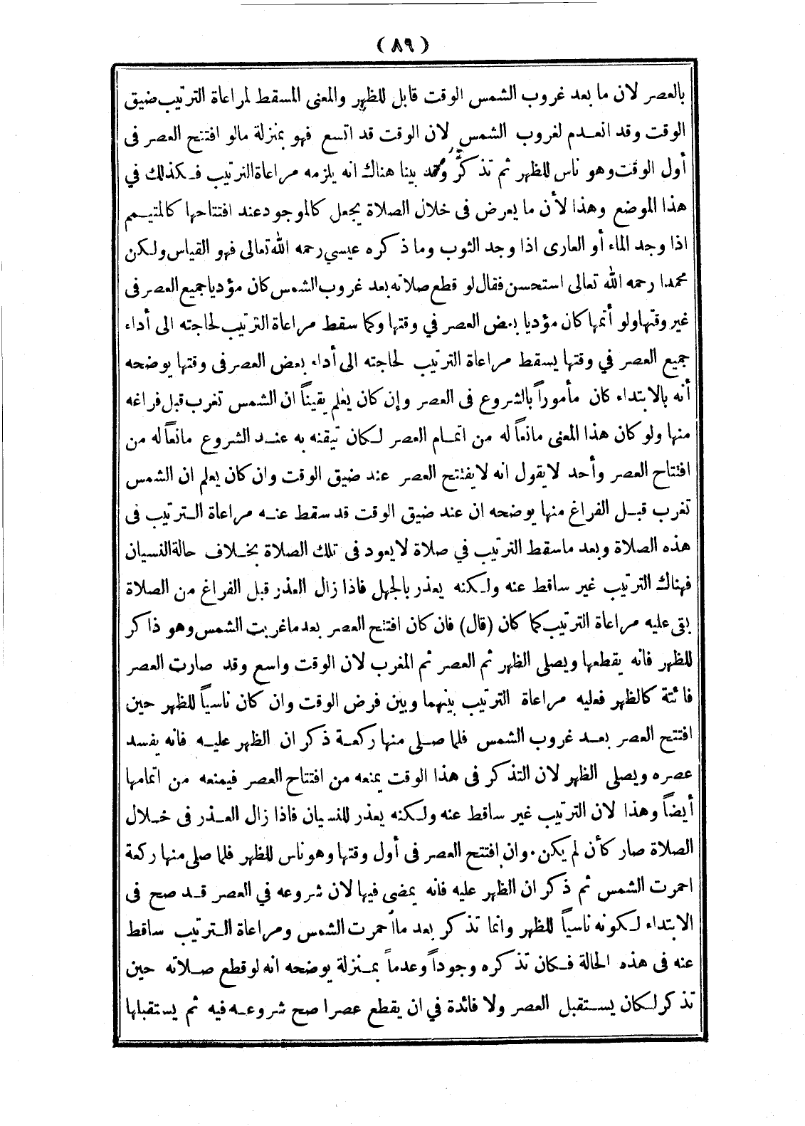 وَلَوْ كَانَ هَذَا الْمَعْنَى مَانِعًا لَهُ مِنْ إتْمَامِ الْعَصْرِ لَكَانَ تَيَقُّنُهُ بِهِ عِنْدَ الشُّرُوعِ مَانِعًا لَهُ مِنْ افْتِتَاحِ الْعَصْرِ، وَأَحَدٌ لَا يَقُولُ إنَّهُ لَا يُفْتَتَحُ الْعَصْرُ عِنْدَ ضِيقِ الْوَقْتِ، وَإِنْ كَانَ يَعْلَمُ أَنَّ الشَّمْسَ تَغْرُبُ قَبْلَ الْفَرَاغِ مِنْهَا يُوَضِّحُهُ أَنَّ عِنْدَ ضِيقِ الْوَقْتِ قَدْ سَقَطَ عَنْهُ مُرَاعَاةُ التَّرْتِيبِ فِي هَذِهِ الصَّلَاةِ وَبَعْدَمَا سَقَطَ التَّرْتِيبُ فِي صَلَاةٍ لَا يَعُودُ فِي تِلْكَ الصَّلَاةِ بِخِلَافِ حَالَةِ النِّسْيَانِ فَهُنَاكَ التَّرْتِيبُ غَيْرُ سَاقِطٍ عَنْهُ، وَلَكِنَّهُ يُعْذَرُ بِالْجَهْلِ فَإِذَا زَالَ الْعُذْرُ قَبْلَ الْفَرَاغِ مِنْ الصَّلَاةِ بَقِيَ عَلَيْهِ مُرَاعَاةُ التَّرْتِيبِ كَمَا كَانَ.
