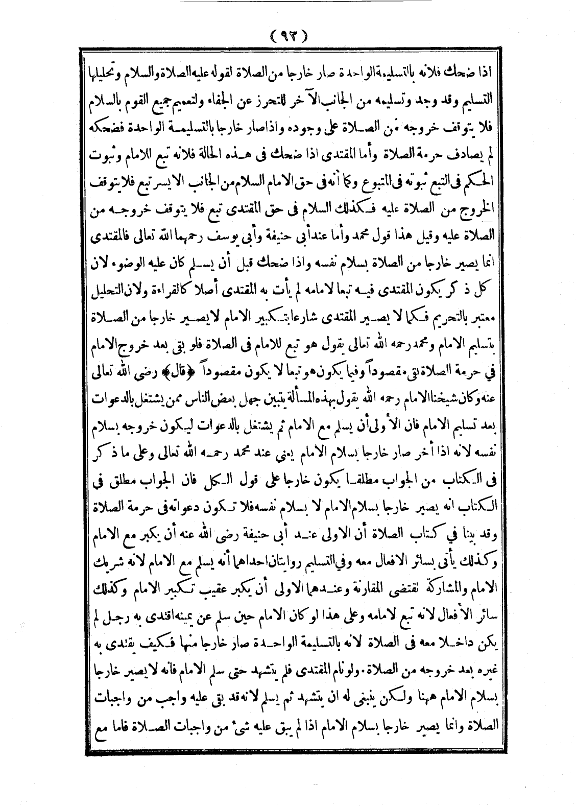 إذَا ضَحِكَ؛ فَلِأَنَّهُ بِالتَّسْلِيمَةِ الْوَاحِدَةِ صَارَ خَارِجًا مِنْ الصَّلَاةِ لِقَوْلِهِ - عَلَيْهِ الصَّلَاةُ وَالسَّلَامُ - «وَتَحْلِيلُهَا التَّسْلِيمُ»، وَقَدْ وُجِدَ وَتَسْلِيمُهُ مِنْ الْجَانِبِ الْآخَرِ لِلتَّحَرُّزِ عَنْ الْجَفَاءِ وَلِتَعْمِيمِ جَمِيعِ الْقَوْمِ بِالسَّلَامِ فَلَا يَتَوَقَّفُ خُرُوجُهُ مِنْ الصَّلَاةِ عَلَى وُجُودِهِ، وَإِذَا صَارَ خَارِجًا بِالتَّسْلِيمَةِ الْوَاحِدَةِ فَضِحْكُهُ لَمْ يُصَادِفْ حُرْمَةَ الصَّلَاةِ.