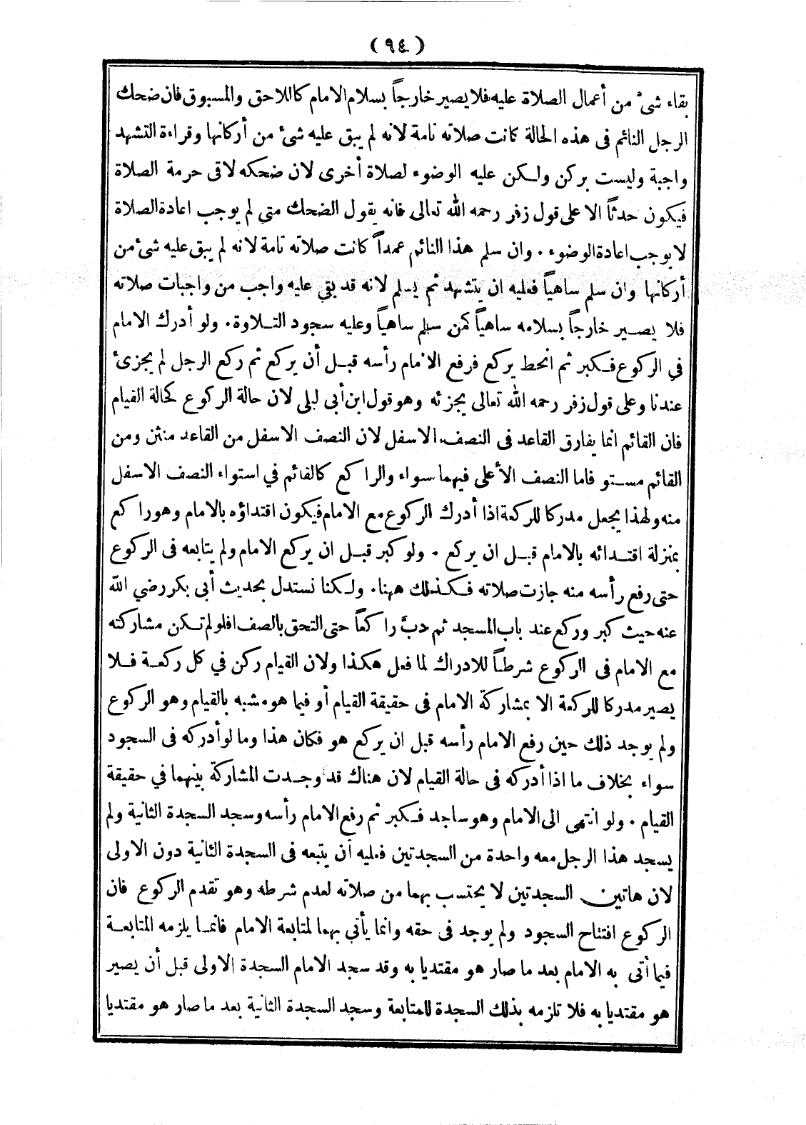 بَقَاءِ شَيْءٍ مِنْ أَعْمَالِ الصَّلَاةِ عَلَيْهِ فَلَا يَصِيرُ خَارِجًا بِسَلَامِ الْإِمَامِ كَاللَّاحِقِ وَالْمَسْبُوقِ فَإِنْ ضَحِكَ الرَّجُلُ النَّائِمُ فِي هَذِهِ الْحَالَةِ كَانَتْ صَلَاتُهُ تَامَّةً؛ لِأَنَّهُ لَمْ يَبْقَ عَلَيْهِ شَيْءٌ مِنْ أَرْكَانِهَا وَقِرَاءَةُ التَّشَهُّدِ وَاجِبَةٌ وَلَيْسَتْ بِرُكْنٍ وَلَكِنْ عَلَيْهِ الْوُضُوءُ لِصَلَاةٍ أُخْرَى؛ لِأَنَّ ضِحْكَهُ لَاقَى حُرْمَةَ الصَّلَاةِ فَيَكُونُ حَدَثًا إلَّا عَلَى قَوْلِ زُفَرَ - رَحِمَهُ اللَّهُ تَعَالَى - فَإِنَّهُ يَقُولُ: الضَّحِكُ مَتَى لَمْ يُوجِبْ إعَادَةَ الصَّلَاةِ لَا يُوجِبُ إعَادَةَ الْوُضُوءِ