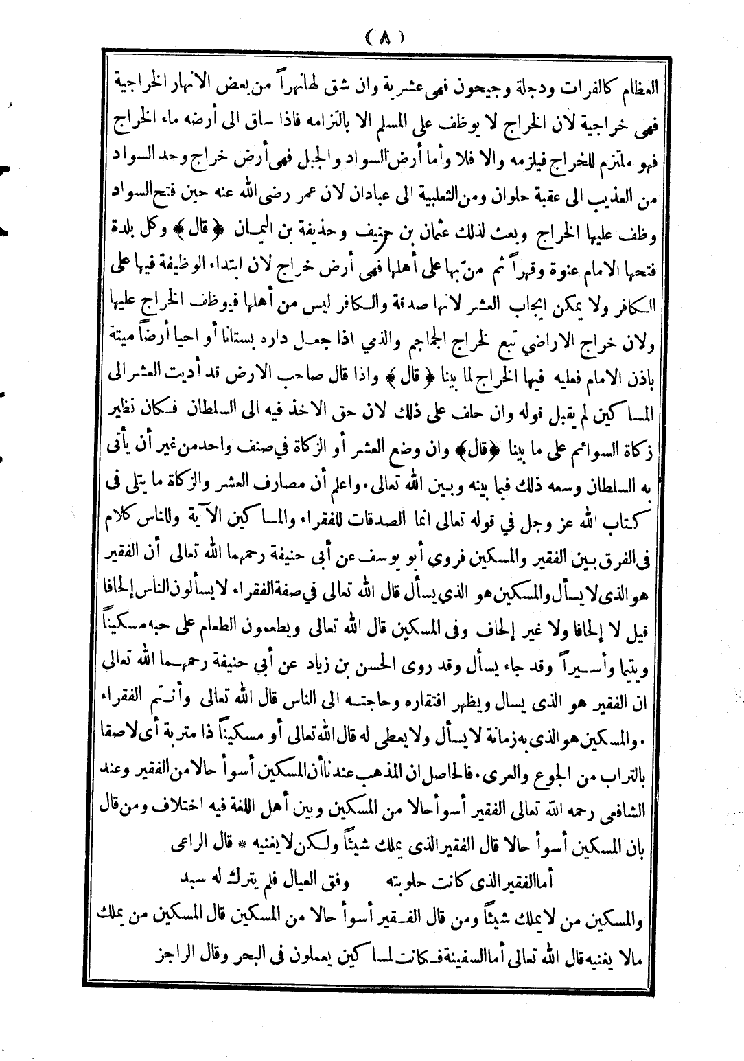 وَاعْلَمْ أَنَّ مَصَارِفَ الْعُشْرِ وَالزَّكَاةِ مَا يُتْلَى فِي كِتَابِ اللَّهِ عَزَّ وَجَلَّ فِي قَوْله تَعَالَى {إنَّمَا الصَّدَقَاتُ لِلْفُقَرَاءِ وَالْمَسَاكِينِ} [التوبة: 60] الْآيَةُ وَلِلنَّاسِ كَلَامٌ فِي الْفَرْقِ بَيْنَ الْفَقِيرِ وَالْمِسْكِينِ فَرَوَى أَبُو يُوسُفَ عَنْ أَبِي حَنِيفَةَ رَحِمَهُمَا اللَّهُ تَعَالَى أَنَّ الْفَقِيرَ هُوَ الَّذِي لَا يَسْأَلُ وَالْمِسْكِينُ هُوَ الَّذِي يَسْأَلُ قَالَ اللَّهُ تَعَالَى فِي صِفَةِ الْفُقَرَاءِ {لَا يَسْأَلُونَ النَّاسَ إلْحَافًا} [البقرة: 273] قِيلَ لَا إلْحَافًا، وَلَا غَيْرَ إلْحَافٍ وَفِي الْمِسْكِينِ قَالَ اللَّهُ تَعَالَى {وَيُطْعِمُونَ الطَّعَامَ عَلَى حُبِّهِ مِسْكِينًا وَيَتِيمًا وَأَسِيرًا} [الإنسان: 8] وَقَدْ جَاءَ يَسْأَلُ وَقَدْ رَوَى الْحَسَنُ بْنُ زِيَادٍ عَنْ أَبِي حَنِيفَةَ رَحِمَهُمَا اللَّهُ تَعَالَى أَنَّ الْفَقِيرَ هُوَ الَّذِي يَسْأَلُ وَيُظْهِرُ افْتِقَارَهُ وَحَاجَتَهُ إلَى النَّاسِ قَالَ اللَّهُ تَعَالَى {وَأَنْتُمْ الْفُقَرَاءُ} [محمد: 38] وَالْمِسْكِينُ هُوَ الَّذِي بِهِ زَمَانَةٌ لَا يَسْأَلُ، وَلَا يُعْطَى لَهُ قَالَ اللَّهُ تَعَالَى: {، أَوْ مِسْكِينًا ذَا مَتْرَبَةٍ} [البلد: 16] أَيْ لَاصِقًا بِالتُّرَابِ مِنْ الْجُوعِ وَالْعُرْي. فَالْحَاصِلُ أَنَّ الْمَذْهَبَ عِنْدَنَا أَنَّ الْمِسْكِينَ أَسْوَأُ حَالًا مِنْ الْفَقِيرِ وَعِنْدَ الشَّافِعِيِّ - رَحِمَهُ اللَّهُ تَعَالَى - الْفَقِيرُ أَسْوَأُ حَالًا مِنْ الْمِسْكِينِ وَبَيْنَ أَهْلِ اللُّغَةِ فِيهِ اخْتِلَافٌ وَمَنْ قَالَ بِأَنَّ الْمِسْكِينَ أَسْوَأُ حَالًا قَالَ الْفَقِيرُ الَّذِي يَمْلِكُ شَيْئًا وَلَكِنْ لَا يُغْنِيه قَالَ الرَّاعِي