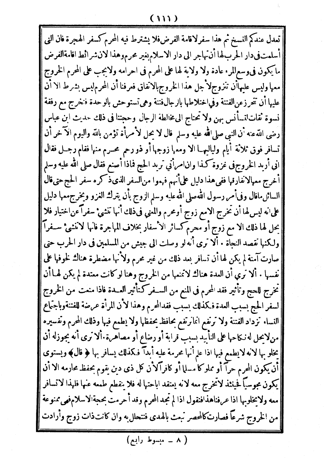 وَالْمَعْنَى فِي ذَلِكَ أَنَّهَا تُنْشِئُ سَفَرًا عَنْ اخْتِيَارٍ فَلَا يَحِلُّ لَهَا ذَلِكَ إلَّا مَعَ زَوْجٍ أَوْ مَحْرَمٍ كَسَائِرِ الْأَسْفَارِ بِخِلَافِ الْمُهَاجِرَةِ فَإِنَّهَا لَا تُنْشِئُ سَفَرًا، وَلَكِنَّهَا تَقْصِدُ النَّجَاةَ أَلَا تَرَى أَنَّهُ لَوْ وَصَلَتْ إلَى جَيْشٍ مِنْ الْمُسْلِمِينَ فِي دَارِ الْحَرْبِ حَتَّى صَارَتْ آمِنَةً لَمْ يَكُنْ لَهَا أَنْ تُسَافِرَ بَعْدَ ذَلِكَ مِنْ غَيْرِ مَحْرَمٍ، وَلِأَنَّهَا مُضْطَرَّةٌ هُنَاكَ لِخَوْفِهَا عَلَى نَفْسِهَا أَلَا تَرَى أَنَّ الْعِدَّةَ هُنَاكَ لَا تَمْنَعُهَا مِنْ الْخُرُوجِ، وَهُنَا لَوْ كَانَتْ مُعْتَدَّةً لَمْ يَكُنْ لَهَا أَنْ تَخْرُجَ لِلْحَجِّ، وَتَأْثِيرُ فَقْدِ الْمَحْرَمِ فِي الْمَنْعِ مِنْ السَّفَرِ كَتَأْثِيرِ الْعِدَّةِ فَإِذَا مُنِعَتْ مِنْ الْخُرُوجِ لِسَفَرِ الْحَجِّ بِسَبَبِ الْعِدَّةِ فَكَذَلِكَ بِسَبَبِ فَقْدِ الْمَحْرَمِ، وَهَذَا لِأَنَّ الْمَرْأَةَ عُرْضَةٌ لِلْفِتْنَةِ، وَبِاجْتِمَاعِ النِّسَاءِ تَزْدَادُ الْفِتْنَةُ، وَلَا تُرْفَعُ إنَّمَا تُرْفَعُ بِحَافِظٍ يَحْفَظُهَا، وَلَا يَطْمَعُ فِيهَا، وَذَلِكَ الْمَحْرَمُ، وَتَفْسِيرُهُ مَنْ لَا يَحِلُّ لَهُ نِكَاحُهَا عَلَى التَّأْبِيدِ بِسَبَبِ قَرَابَةٍ أَوْ رَضَاعٍ أَوْ مُصَاهَرَةٍ أَلَا تَرَى أَنَّهُ يَجُوزُ لَهُ أَنْ يَخْلُوَ بِهَا لِأَنَّهُ لَا يَطْمَعُ فِيهَا إذَا عَلِمَ أَنَّهَا مُحَرَّمَةٌ عَلَيْهِ أَبَدًا فَكَذَلِكَ يُسَافِرُ بِهَا.