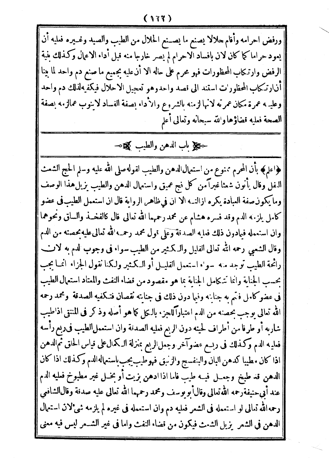 (بَابُ الدُّهْنِ وَالطِّيبِ) (اعْلَمْ) بِأَنَّ الْمُحْرِمَ مَمْنُوعٌ مِنْ اسْتِعْمَالِ الدُّهْنِ وَالطِّيبِ لِقَوْلِهِ - صَلَّى اللَّهُ عَلَيْهِ وَسَلَّمَ - «الْحَاجُّ الشَّعِثُ التَّفِلُ، وَقَالَ: يَأْتُونَ شُعْثًا غُبْرًا مِنْ كُلِّ فَجٍّ عَمِيقٍ» وَاسْتِعْمَالُ الدُّهْنِ وَالطِّيبِ يُزِيلُ هَذَا الْوَصْفَ وَمَا يَكُونُ صِفَةَ الْعِبَادَةِ يُكْرَهُ إزَالَتُهُ إلَّا أَنَّ فِي ظَاهِرِ الرِّوَايَةِ قَالَ: إنْ اسْتَعْمَلَ الطِّيبَ فِي عُضْوٍ كَامِلٍ يَلْزَمُهُ الدَّمُ، وَقَدْ فَسَّرَهُ هِشَامٌ عَنْ مُحَمَّدٍ - رَحِمَهُمَا اللَّهُ تَعَالَى - قَالَ: كَالْفَخِذِ وَالسَّاقِ وَنَحْوِهِمَا، وَإِنْ اسْتَعْمَلَهُ فِيمَا دُون ذَلِكَ فَعَلَيْهِ الصَّدَقَةُ وَعَلَى قَوْلِ مُحَمَّدٍ - رَحِمَهُ اللَّهُ تَعَالَى - بِحِصَّتِهِ مِنْ الدَّمِ. وَقَالَ الشَّعْبِيُّ - رَحِمَهُ اللَّهُ تَعَالَى -: الْقَلِيلُ وَالْكَثِيرُ مِنْ الطِّيبِ سَوَاءٌ فِي وُجُوبِ الدَّمِ بِهِ؛ لِأَنَّ رَائِحَةَ الطِّيبِ تُوجَدُ مِنْهُ سَوَاءٌ اسْتَعْمَلَ الْقَلِيلَ أَوْ الْكَثِيرَ، وَلَكِنَّا نَقُولُ: الْجَزَاءُ إنَّمَا يَجِبُ بِحَسَبِ الْجِنَايَةِ، وَإِنَّمَا تَتَكَامَلُ الْجِنَايَةُ بِمَا هُوَ مَقْصُودٌ مِنْ قَضَاءِ التَّفَثِ، وَالْمُعْتَادُ اسْتِعْمَالُ الطِّيبِ فِي عُضْوٍ كَامِلٍ فَتَمَّ بِهِ جِنَايَتُهُ وَفِيمَا دُونَ ذَلِكَ فِي جِنَايَتِهِ نُقْصَانٌ فَتَكْفِيهِ نُقْصَانُ الصَّدَقَةِ وَمُحَمَّدٌ - رَحِمَهُ اللَّهُ تَعَالَى - يُوجِبُ بِحِصَّتِهِ مِنْ الدَّمِ وَاعْتِبَارًا لِلْجُزْءِ بِالْكُلِّ كَمَا هُوَ أَصْلُهُ، وَذَكَرَ فِي الْمُنْتَقَى إذَا طَيَّبَ شَارِبَهُ أَوْ طَرَفًا مِنْ أَطْرَافِ لِحْيَتِهِ دُونَ الرُّبْعِ فَعَلَيْهِ الصَّدَقَةُ. وَإِنْ اسْتَعْمَلَ الطِّيبَ فِي رُبْعِ رَأْسِهِ فَعَلَيْهِ الدَّمُ، وَكَذَلِكَ فِي رُبْعِ عُضْوٍ آخَرَ وَجَعَلَ الرُّبْعَ بِمَنْزِلَةِ الْكَمَالِ عَلَى قِيَاسِ الْحَلْقِ ثُمَّ الدُّهْنُ إذَا كَانَ مُطَيَّبًا كَدُهْنِ أَلْبَانٍ وَالْبَنَفْسَجِ وَالزَّنْبَقِ فَهُوَ طِيبٌ يَجِبُ بِاسْتِعْمَالِهِ الدَّمُ، وَكَذَلِكَ إذَا كَانَ الدُّهْنُ قَدْ طُبِخَ وَجُعِلَ فِيهِ طِيبٌ، فَأَمَّا إذَا ادَّهَنَ بِزَيْتٍ أَوْ بِخَلٍّ غَيْرِ مَطْبُوخٍ فَعَلَيْهِ الدَّمُ عِنْدَ أَبِي حَنِيفَةَ - رَحِمَهُ اللَّهُ تَعَالَى -، وَقَالَ أَبُو يُوسُفَ وَمُحَمَّدٌ - رَحِمَهُمَا اللَّهُ تَعَالَى -: عَلَيْهِ صَدَقَةٌ، وَقَالَ الشَّافِعِيُّ - رَحِمَهُ اللَّهُ تَعَالَى -: لَوْ اسْتَعْمَلَهُ فِي الشَّعْرِ فَعَلَيْهِ دَمٌ وَإِنْ اسْتَعْمَلَهُ فِي غَيْرِهِ لَمْ يَلْزَمْهُ شَيْءٌ؛ لِأَنَّ اسْتِعْمَالَ الدُّهْنِ فِي الشَّعْرِ يُزِيلُ الشَّعَثَ فَيَكُونُ مِنْ قَضَاءِ التَّفَثِ. وَأَمَّا فِي غَيْرِ الشَّعْرِ لَيْسَ فِيهِ مَعْنَى