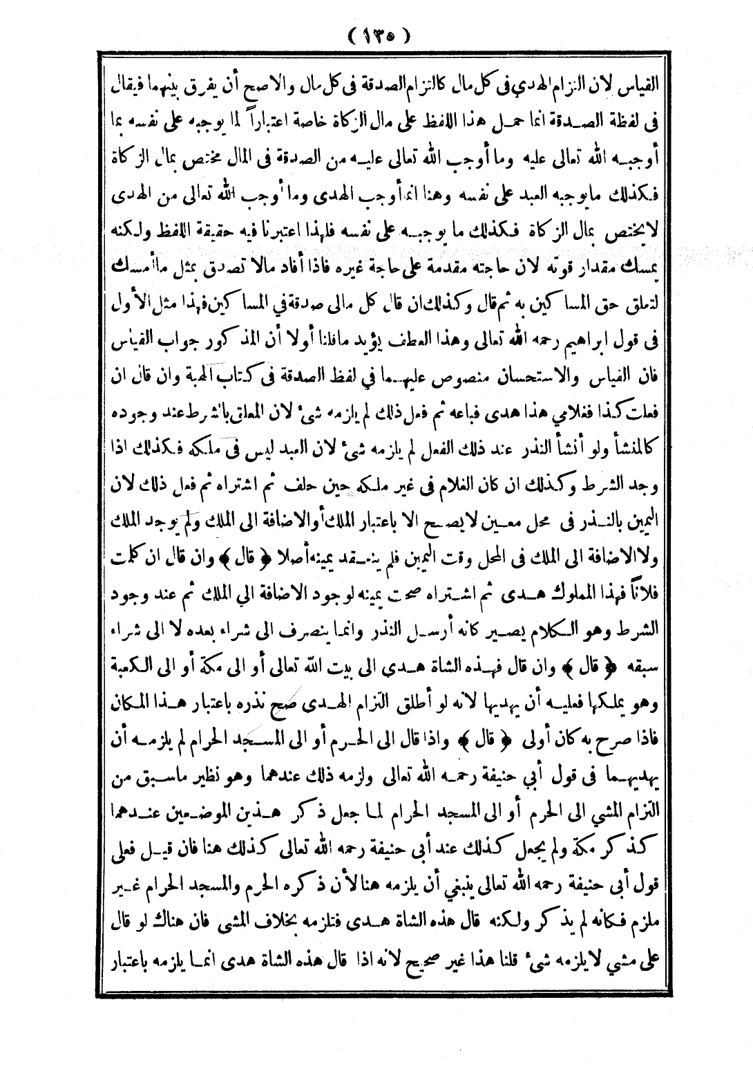 الْقِيَاسِ؛ لِأَنَّ الْتِزَامَ الْهَدْيِ فِي كُلِّ مَالٍ كَالْتِزَامِ الصَّدَقَةِ فِي كُلِّ مَالٍ، وَالْأَصَحُّ أَنْ يُفَرِّقَ بَيْنَهُمَا فَيُقَالَ فِي لَفْظِ الصَّدَقَةِ إنَّمَا حُمِلَ هَذَا اللَّفْظُ عَلَى مَالِ الزَّكَاةِ خَاصَّةً اعْتِبَارًا لِمَا يُوجِبُهُ عَلَى نَفْسِهِ بِمَا أَوْجَبَهُ اللَّهُ تَعَالَى عَلَيْهِ وَمَا أَوْجَبَ اللَّهُ تَعَالَى عَلَيْهِ مِنْ الصَّدَقَةِ فِي الْمَالِ مُخْتَصٌّ بِمَالِ الزَّكَاةِ فَكَذَلِكَ مَا يُوجِبُهُ الْعَبْدُ عَلَى نَفْسِهِ، وَهُنَا إنَّمَا أَوْجَبَ الْهَدْيَ وَمَا أَوْجَبَ اللَّهُ تَعَالَى مِنْ الْهَدْيِ لَا يَخْتَصُّ بِمَالِ الزَّكَاةِ فَكَذَلِكَ مَا يُوجِبُهُ عَلَى نَفْسِهِ فَلِهَذَا اعْتَبَرْنَا فِيهِ حَقِيقَةَ اللَّفْظِ، وَلَكِنَّهُ يُمْسِكُ مِقْدَارَ قُوتِهِ؛ لِأَنَّ حَاجَتَهُ مُقَدَّمَةٌ عَلَى حَاجَةِ غَيْرِهِ، فَإِذَا أَفَادَ مَالًا تَصَدَّقَ بِمِثْلِ مَا أَمْسَكَ لِتَعَلُّقِ حَقِّ الْمَسَاكِينِ بِهِ ثُمَّ قَالَ: وَكَذَلِكَ إنْ قَالَ: كُلُّ مَالِي صَدَقَةٌ فِي الْمَسَاكِينِ فَهَذَا مِثْلُ الْأَوَّلِ فِي قَوْلِ إبْرَاهِيمَ - رَحِمَهُ اللَّهُ تَعَالَى -، وَهَذَا الْعَطْفُ يُؤَيِّدُ مَا قُلْنَا أَوَّلًا أَنَّ الْمَذْكُورَ جَوَابُ الْقِيَاسِ فَإِنَّ الْقِيَاسَ وَالِاسْتِحْسَانَ مَنْصُوصٌ عَلَيْهِمَا فِي لَفْظِ الصَّدَقَةِ فِي كِتَابِ الْهِبَةِ، وَإِنْ قَالَ: إنْ فَعَلْتُ كَذَا فَغُلَامِي هَذَا هَدْيٌ فَبَاعَهُ ثُمَّ فَعَلَ ذَلِكَ لَمْ يَلْزَمْهُ شَيْءٌ؛ لِأَنَّ الْمُعَلَّقَ بِالشَّرْطِ عِنْدَ وُجُودِهِ كَالْمُنْشَإِ، وَلَوْ أَنْشَأَ النَّذْرَ عِنْدَ ذَلِكَ الْفِعْلِ لَمْ يَلْزَمْهُ شَيْءٌ؛ لِأَنَّ الْعَبْدَ لَيْسَ فِي مِلْكِهِ فَكَذَلِكَ إذَا وُجِدَ الشَّرْطُ، وَكَذَلِكَ إنْ كَانَ الْغُلَامُ فِي غَيْرِ مِلْكِهِ حِينَ حَلَفَ ثُمَّ اشْتَرَاهُ ثُمَّ فَعَلَ ذَلِكَ؛ لِأَنَّ الْيَمِينَ بِالنَّذْرِ فِي مَحَلٍّ مُعَيَّنٍ لَا يَصِحُّ إلَّا بِاعْتِبَارِ الْمِلْكِ أَوْ الْإِضَافَةِ إلَى الْمِلْكِ، وَلَمْ يُوجَدْ الْمِلْكُ وَلَا الْإِضَافَةُ إلَى الْمِلْكِ فِي الْمَحِلِّ وَقْتَ الْيَمِينِ فَلَمْ يَنْعَقِدْ يَمِينُهُ أَصْلًا